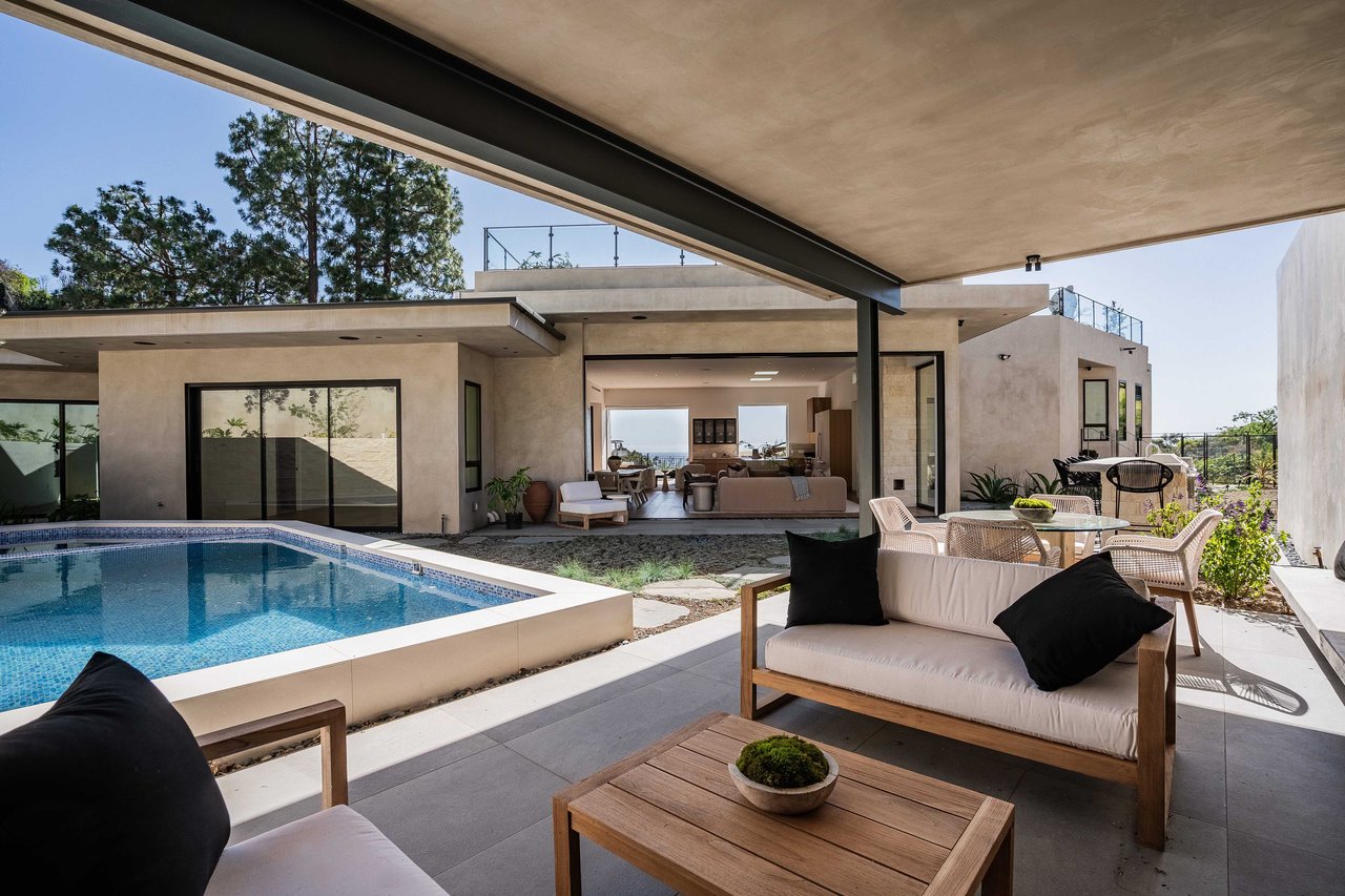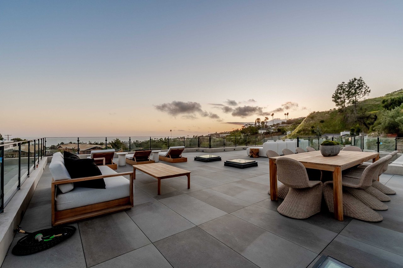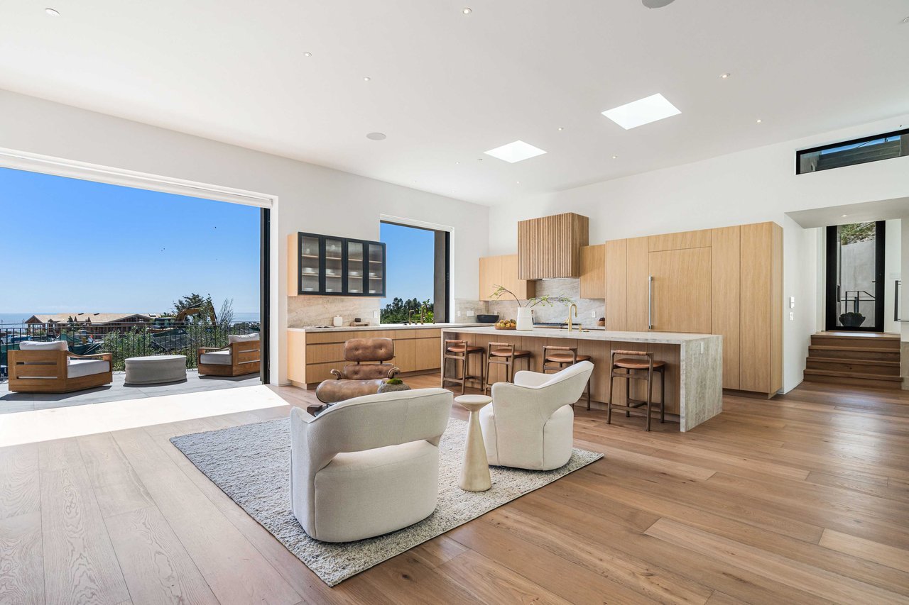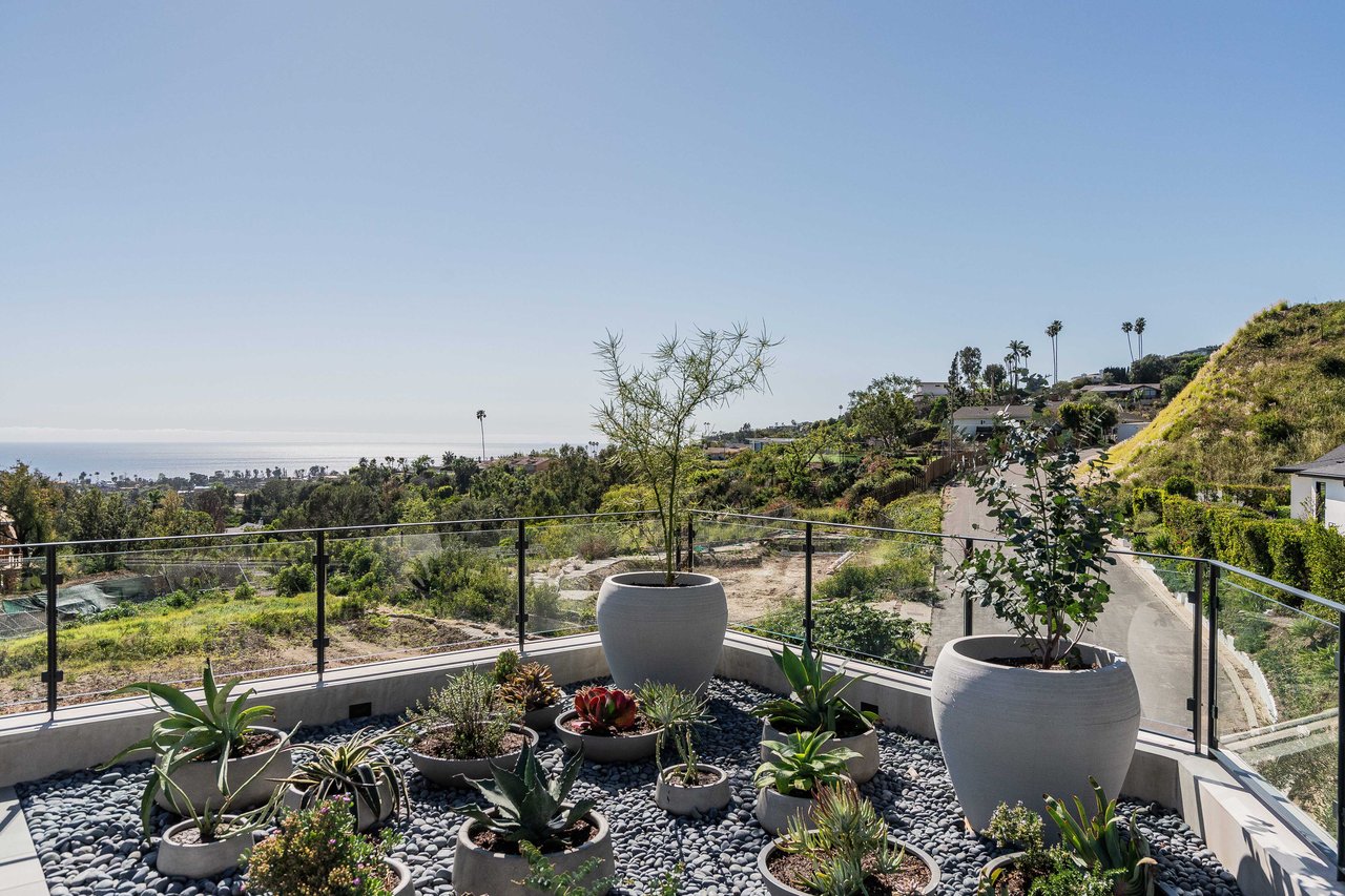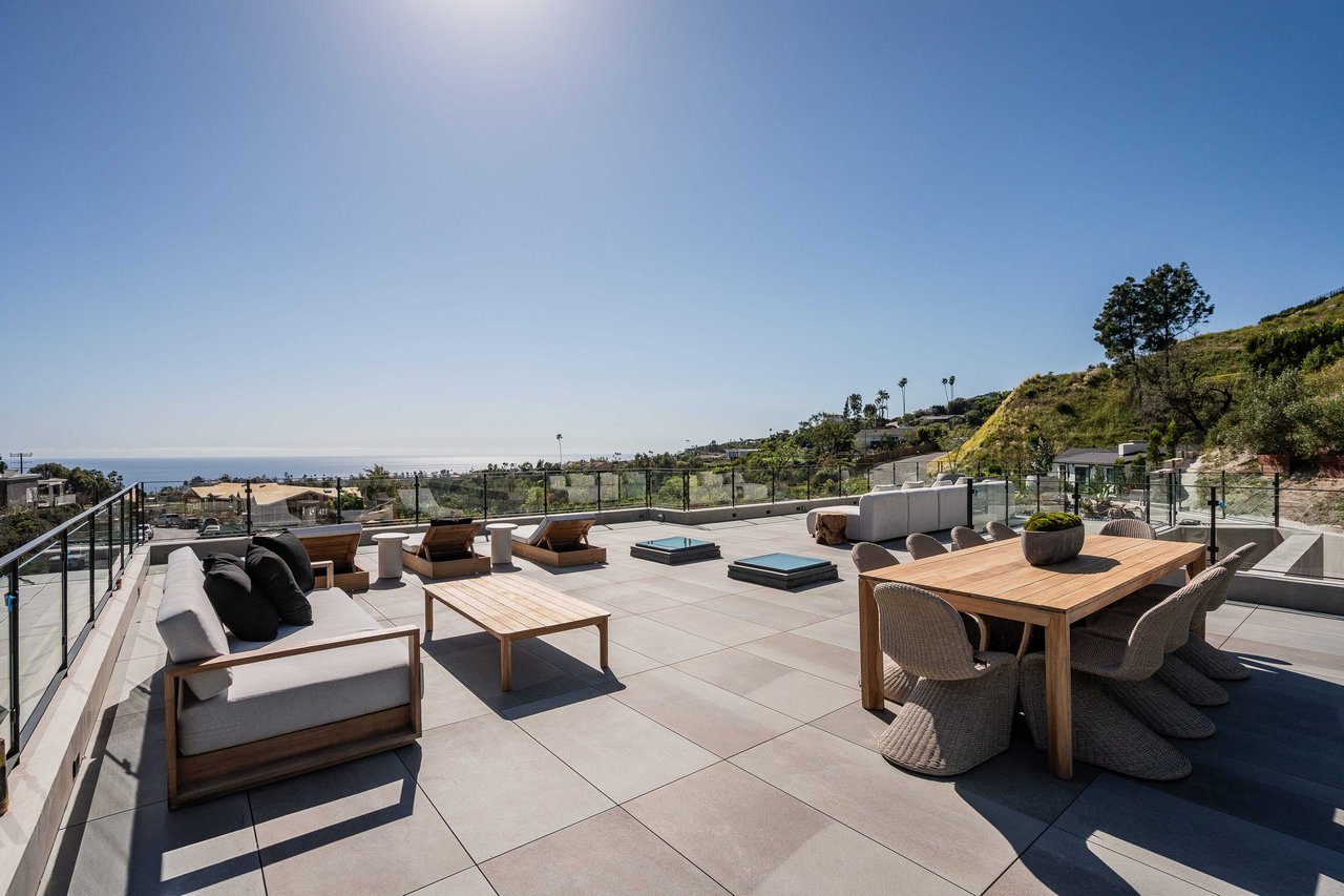 One of the first newly constructed homes available in Pacific Palisades, this brand-new organic-modern ocean-view pool home sits on a prominent 16,927 sq ft corner parcel, offering exceptional privacy and sweeping Pacific Ocean views. The residence features 4 bedrooms with en suite baths, plus an additional powder room, soaring 12-foot ceilings, and expansive walls of glass with pocketing aluminum sliding doors that create seamless indoor-outdoor living. Designed with an organic, modern coastal aesthetic, the home blends clean architectural lines with warm, natural materials, including wide-plank European oak floors, custom rift oak cabinetry, natural stone finishes, and Taj Mahal quartzite countertops. The chef's kitchen features Thermador appliances and a pass-through pocket window opening to an outdoor bar and BBQ area, ideal for entertaining. An expansive rooftop deck captures panoramic ocean and sunset views with garden areas, utilities, and preparation for speakers and a fire feature. The main living spaces open to multiple outdoor areas, including three front patios, a covered rear patio with a fire pit, integrated speakers and TV wiring, and a resort-style pool and spa with mosaic detailing, water features, and smart controls. A private patio off one of the bedrooms offers additional outdoor living space. Additional features include a two-car garage with an EV charger and epoxy flooring, a laundry room with a sink and storage, and a fully integrated smart home system with whole-home audio, surround sound, security cameras, an alarm system, WiFi boosters, and smart entry. The home is built with extensive fire-conscious design elements, including reinforced exterior construction, dual-glazed tempered windows, interior and exterior fire sprinklers, rooftop sprinklers supplied by a pool reservoir backup, non-combustible roof deck pavers, and low-fire-risk landscaping with more than 30 olive trees. Constructed and designed by Builder Direct Design Build, a respected Palisades family-owned firm known for exceptional craftsmanship.