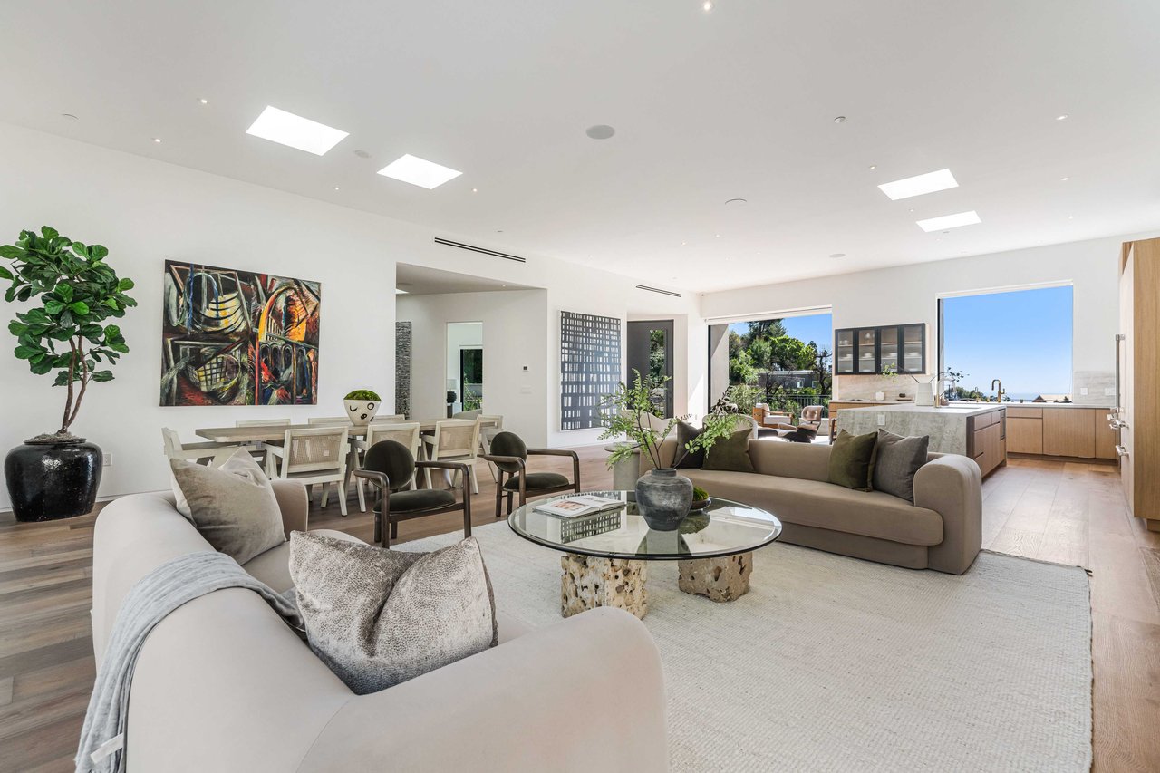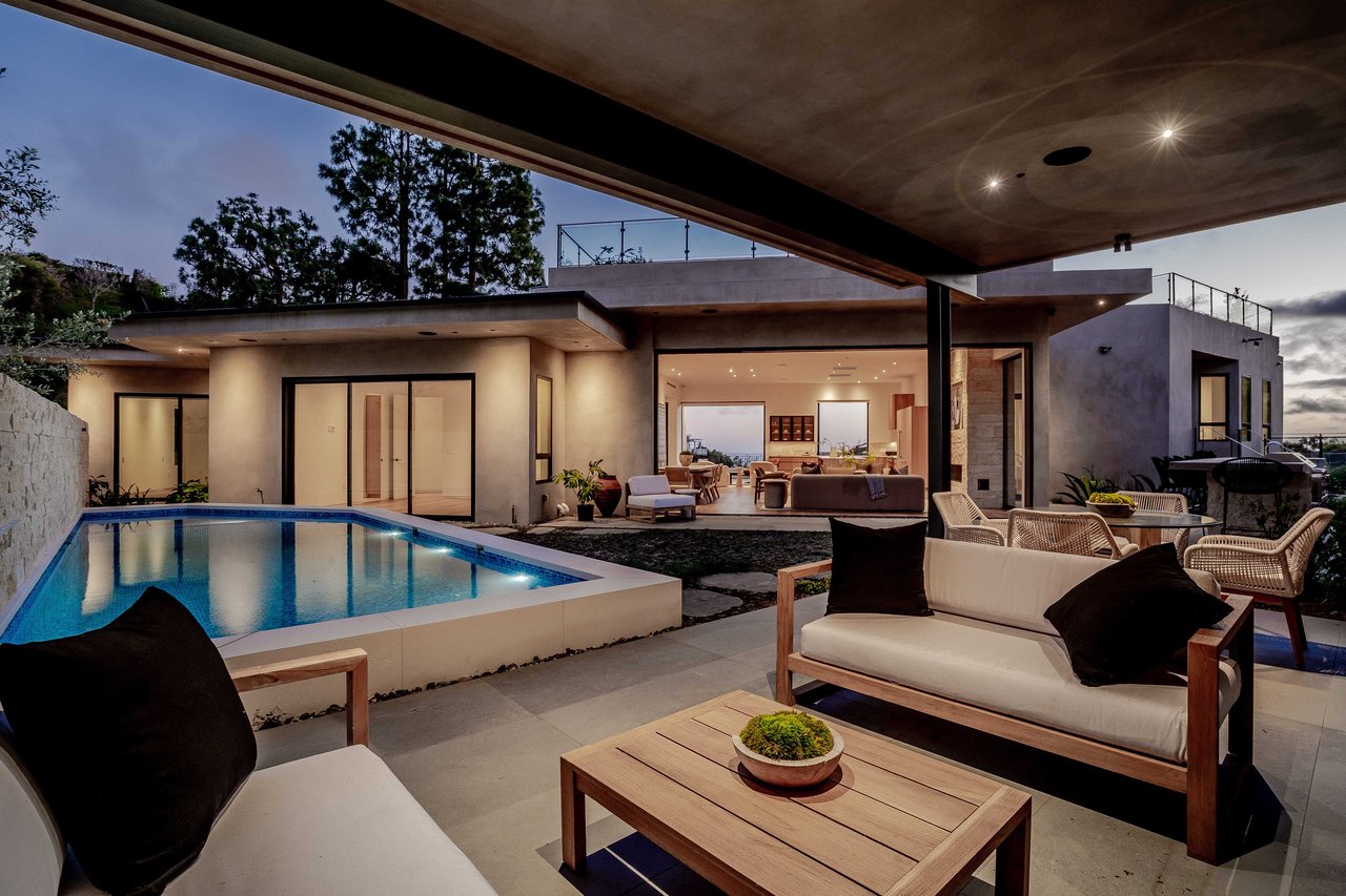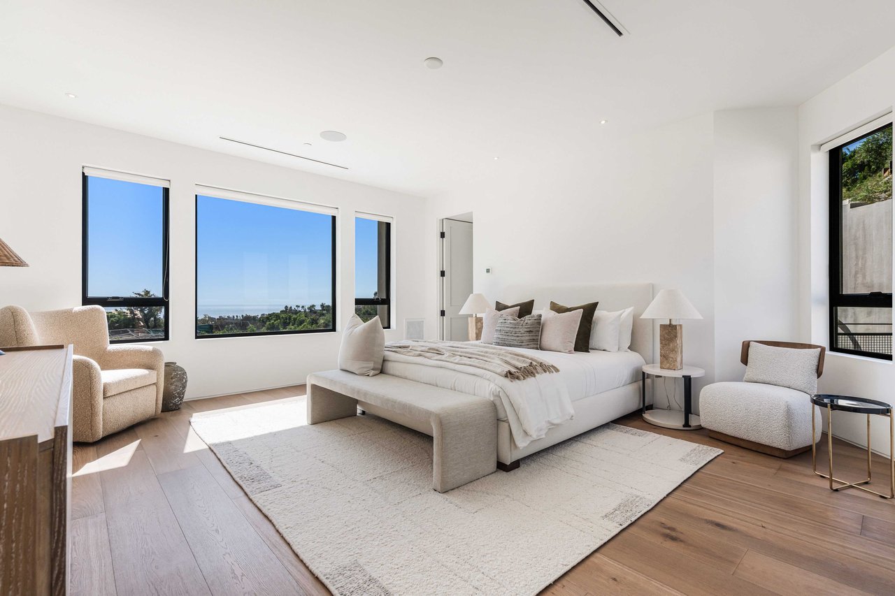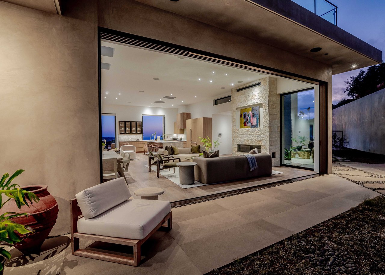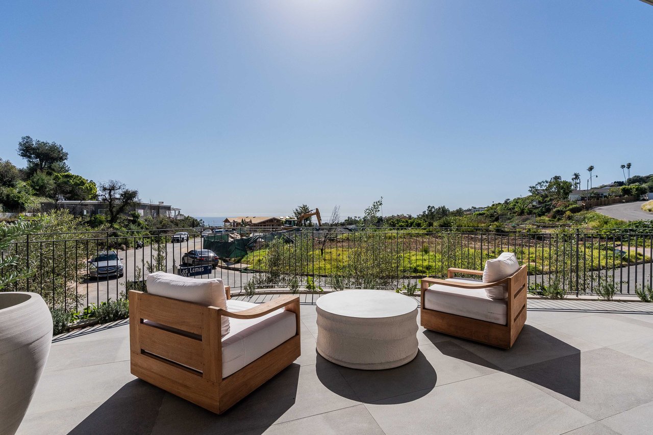 One of the first newly constructed homes available in Pacific Palisades, this brand-new organic-modern ocean-view pool home sits on a prominent 16,927 sq ft corner parcel, offering exceptional privacy and sweeping Pacific Ocean views. The residence features 4 bedrooms with en suite baths, plus an additional powder room, soaring 12-foot ceilings, and expansive walls of glass with pocketing aluminum sliding doors that create seamless indoor-outdoor living. Designed with an organic, modern coastal aesthetic, the home blends clean architectural lines with warm, natural materials, including wide-plank European oak floors, custom rift oak cabinetry, natural stone finishes, and Taj Mahal quartzite countertops. The chef's kitchen features Thermador appliances and a pass-through pocket window opening to an outdoor bar and BBQ area, ideal for entertaining. An expansive rooftop deck captures panoramic ocean and sunset views with garden areas, utilities, and preparation for speakers and a fire feature. The main living spaces open to multiple outdoor areas, including three front patios, a covered rear patio with a fire pit, integrated speakers and TV wiring, and a resort-style pool and spa with mosaic detailing, water features, and smart controls. A private patio off one of the bedrooms offers additional outdoor living space. Additional features include a two-car garage with an EV charger and epoxy flooring, a laundry room with a sink and storage, and a fully integrated smart home system with whole-home audio, surround sound, security cameras, an alarm system, WiFi boosters, and smart entry. The home is built with extensive fire-conscious design elements, including reinforced exterior construction, dual-glazed tempered windows, interior and exterior fire sprinklers, rooftop sprinklers supplied by a pool reservoir backup, non-combustible roof deck pavers, and low-fire-risk landscaping with more than 30 olive trees. Constructed and designed by Builder Direct Design Build, a respected Palisades family-owned firm known for exceptional craftsmanship.