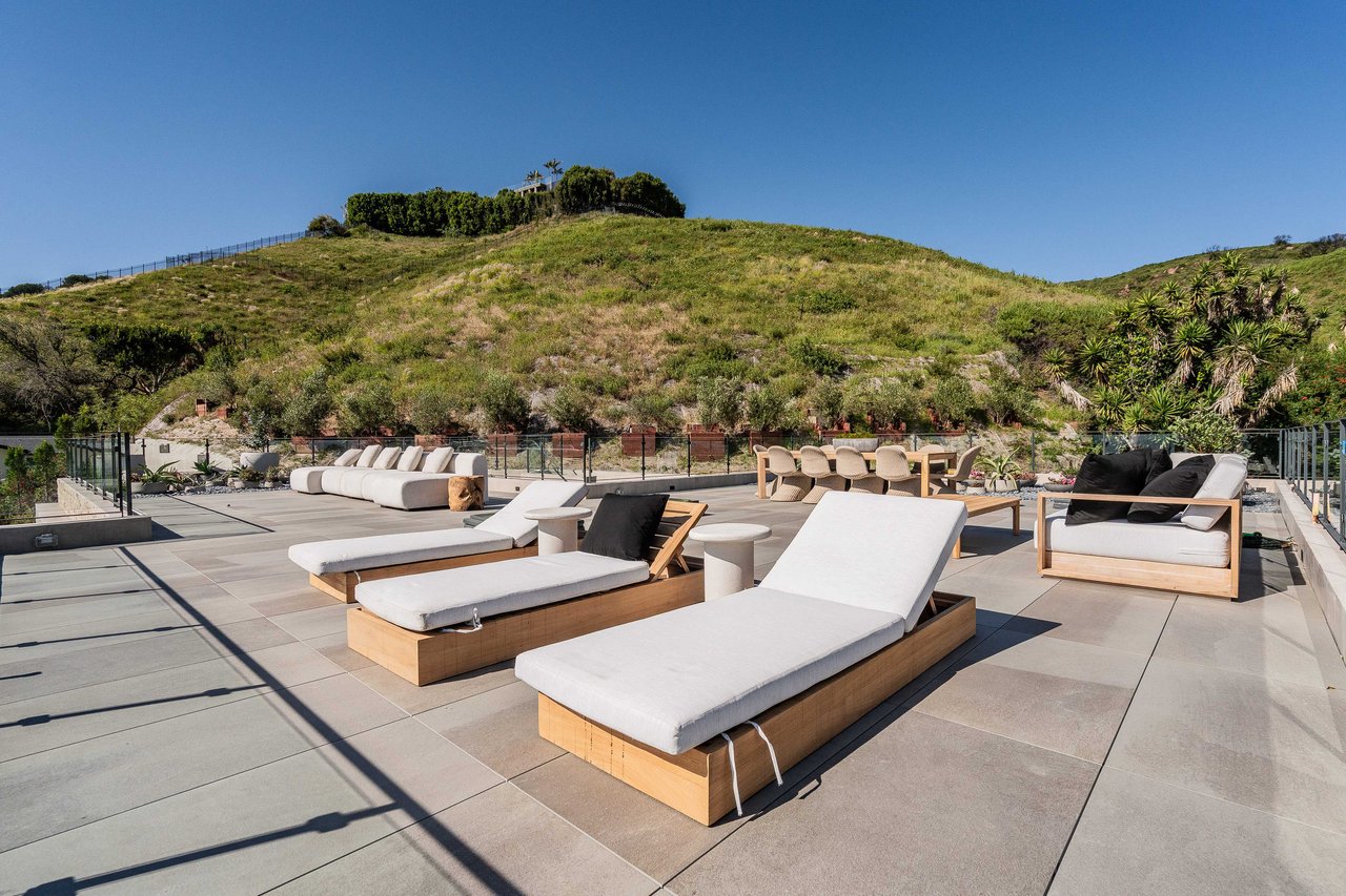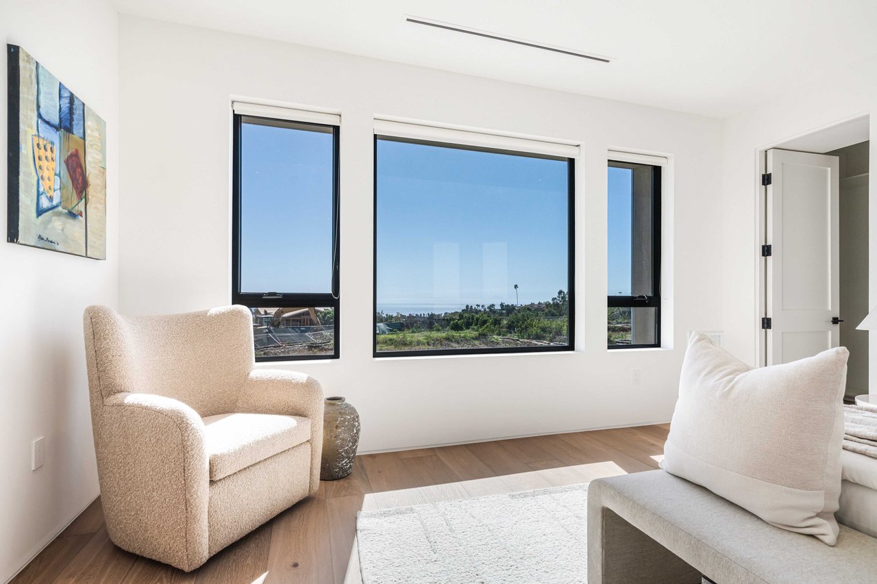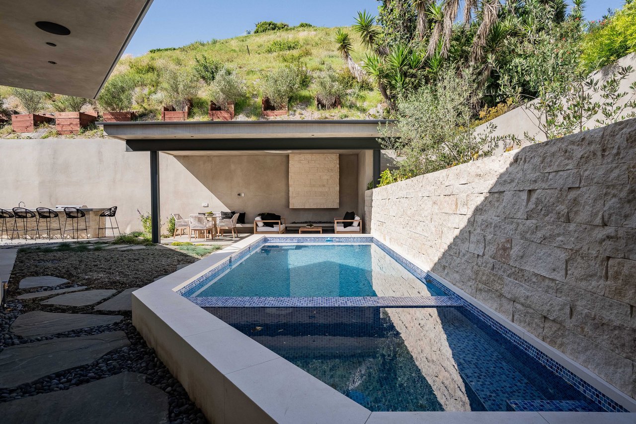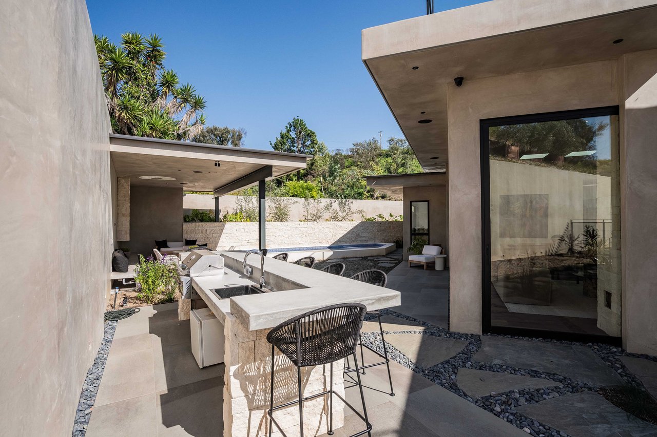 One of the first newly constructed homes available in Pacific Palisades, this brand-new organic-modern ocean-view pool home sits on a prominent 16,927 sq ft corner parcel, offering exceptional privacy and sweeping Pacific Ocean views. The residence features 4 bedrooms with en suite baths, plus an additional powder room, soaring 12-foot ceilings, and expansive walls of glass with pocketing aluminum sliding doors that create seamless indoor-outdoor living. Designed with an organic, modern coastal aesthetic, the home blends clean architectural lines with warm, natural materials, including wide-plank European oak floors, custom rift oak cabinetry, natural stone finishes, and Taj Mahal quartzite countertops. The chef's kitchen features Thermador appliances and a pass-through pocket window opening to an outdoor bar and BBQ area, ideal for entertaining. An expansive rooftop deck captures panoramic ocean and sunset views with garden areas, utilities, and preparation for speakers and a fire feature. The main living spaces open to multiple outdoor areas, including three front patios, a covered rear patio with a fire pit, integrated speakers and TV wiring, and a resort-style pool and spa with mosaic detailing, water features, and smart controls. A private patio off one of the bedrooms offers additional outdoor living space. Additional features include a two-car garage with an EV charger and epoxy flooring, a laundry room with a sink and storage, and a fully integrated smart home system with whole-home audio, surround sound, security cameras, an alarm system, WiFi boosters, and smart entry. The home is built with extensive fire-conscious design elements, including reinforced exterior construction, dual-glazed tempered windows, interior and exterior fire sprinklers, rooftop sprinklers supplied by a pool reservoir backup, non-combustible roof deck pavers, and low-fire-risk landscaping with more than 30 olive trees. Constructed and designed by Builder Direct Design Build, a respected Palisades family-owned firm known for exceptional craftsmanship.