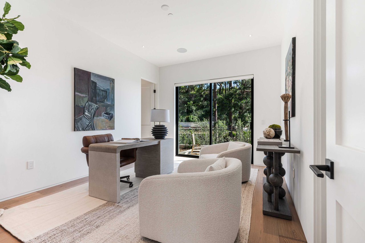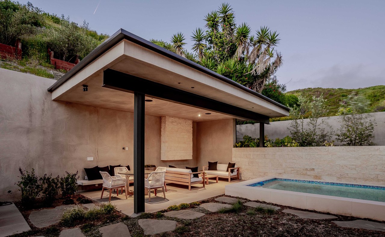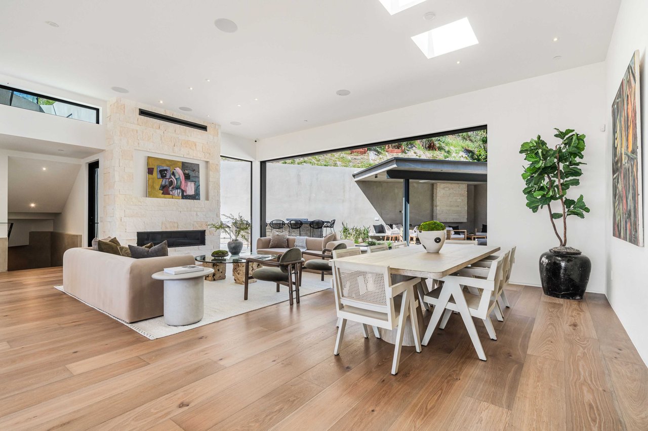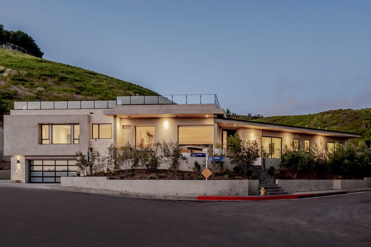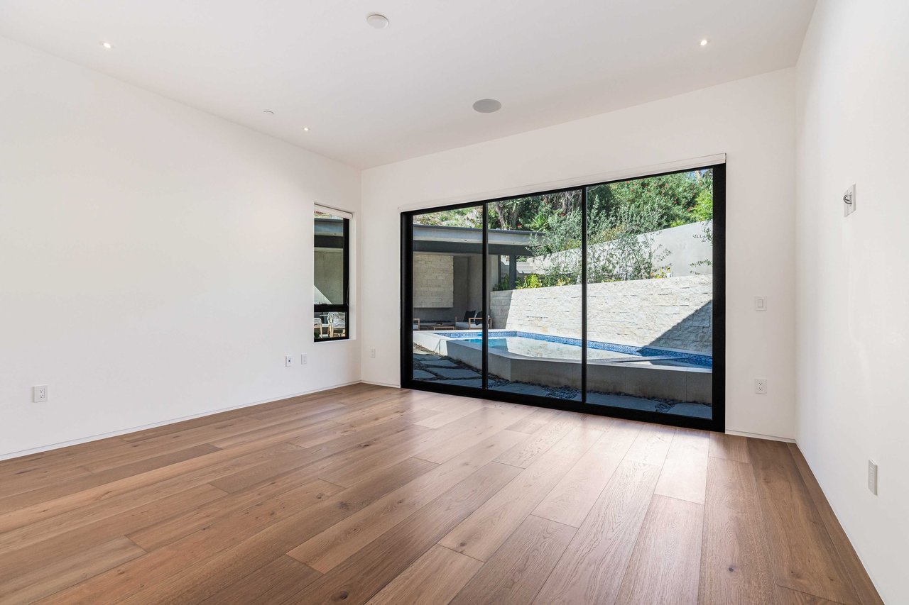 One of the first newly constructed homes available in Pacific Palisades, this brand-new organic-modern ocean-view pool home sits on a prominent 16,927 sq ft corner parcel, offering exceptional privacy and sweeping Pacific Ocean views. The residence features 4 bedrooms with en suite baths, plus an additional powder room, soaring 12-foot ceilings, and expansive walls of glass with pocketing aluminum sliding doors that create seamless indoor-outdoor living. Designed with an organic, modern coastal aesthetic, the home blends clean architectural lines with warm, natural materials, including wide-plank European oak floors, custom rift oak cabinetry, natural stone finishes, and Taj Mahal quartzite countertops. The chef's kitchen features Thermador appliances and a pass-through pocket window opening to an outdoor bar and BBQ area, ideal for entertaining. An expansive rooftop deck captures panoramic ocean and sunset views with garden areas, utilities, and preparation for speakers and a fire feature. The main living spaces open to multiple outdoor areas, including three front patios, a covered rear patio with a fire pit, integrated speakers and TV wiring, and a resort-style pool and spa with mosaic detailing, water features, and smart controls. A private patio off one of the bedrooms offers additional outdoor living space. Additional features include a two-car garage with an EV charger and epoxy flooring, a laundry room with a sink and storage, and a fully integrated smart home system with whole-home audio, surround sound, security cameras, an alarm system, WiFi boosters, and smart entry. The home is built with extensive fire-conscious design elements, including reinforced exterior construction, dual-glazed tempered windows, interior and exterior fire sprinklers, rooftop sprinklers supplied by a pool reservoir backup, non-combustible roof deck pavers, and low-fire-risk landscaping with more than 30 olive trees. Constructed and designed by Builder Direct Design Build, a respected Palisades family-owned firm known for exceptional craftsmanship.