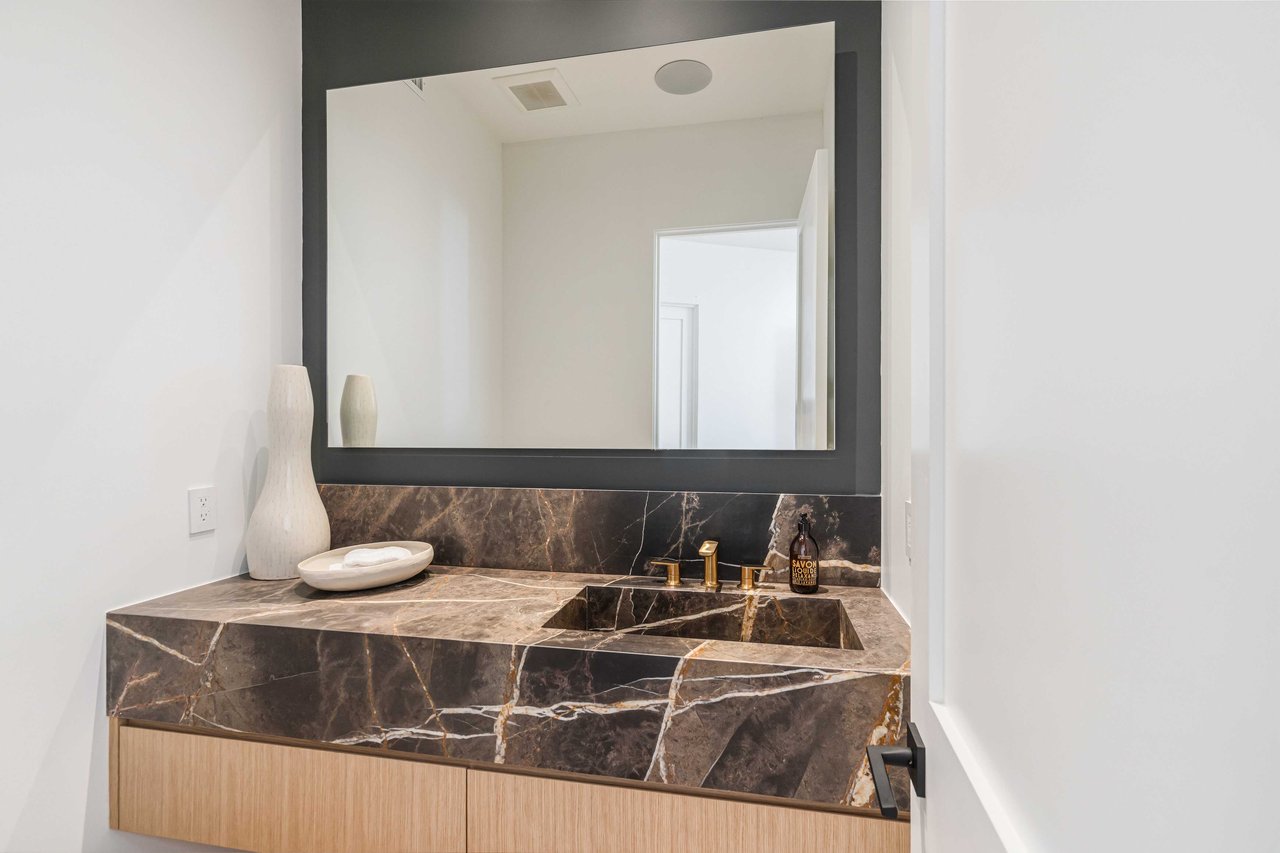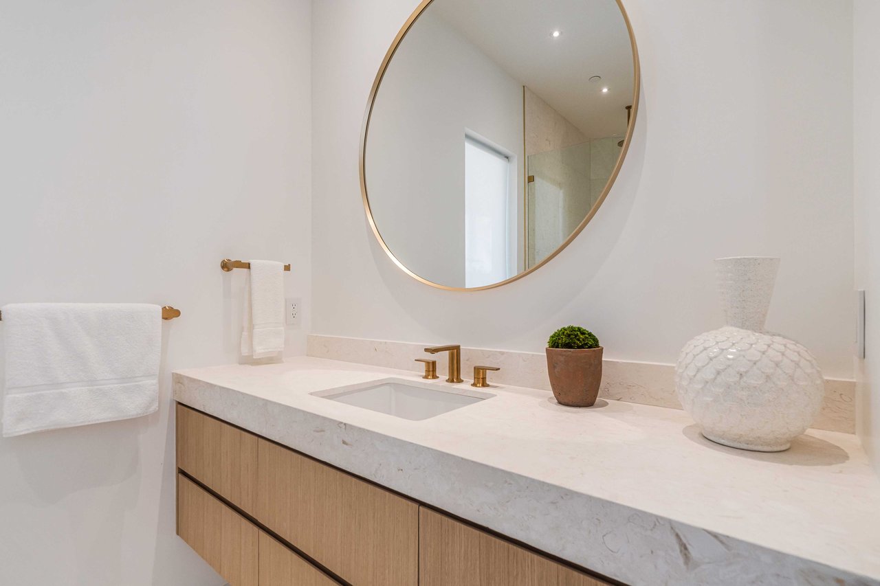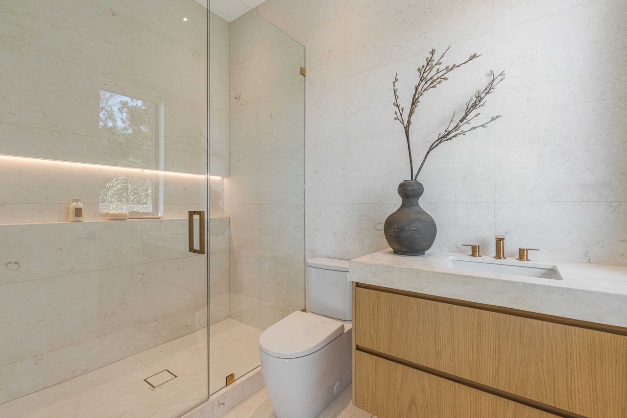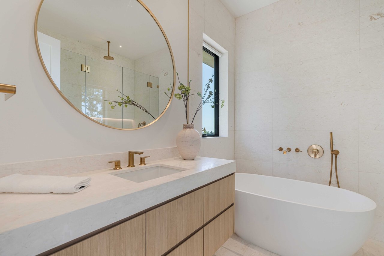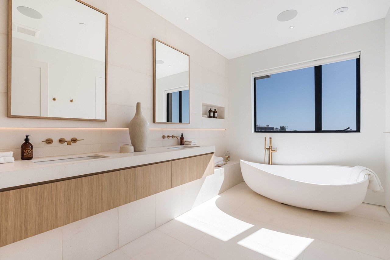 One of the first newly constructed homes available in Pacific Palisades, this brand-new organic-modern ocean-view pool home sits on a prominent 16,927 sq ft corner parcel, offering exceptional privacy and sweeping Pacific Ocean views. The residence features 4 bedrooms with en suite baths, plus an additional powder room, soaring 12-foot ceilings, and expansive walls of glass with pocketing aluminum sliding doors that create seamless indoor-outdoor living. Designed with an organic, modern coastal aesthetic, the home blends clean architectural lines with warm, natural materials, including wide-plank European oak floors, custom rift oak cabinetry, natural stone finishes, and Taj Mahal quartzite countertops. The chef's kitchen features Thermador appliances and a pass-through pocket window opening to an outdoor bar and BBQ area, ideal for entertaining. An expansive rooftop deck captures panoramic ocean and sunset views with garden areas, utilities, and preparation for speakers and a fire feature. The main living spaces open to multiple outdoor areas, including three front patios, a covered rear patio with a fire pit, integrated speakers and TV wiring, and a resort-style pool and spa with mosaic detailing, water features, and smart controls. A private patio off one of the bedrooms offers additional outdoor living space. Additional features include a two-car garage with an EV charger and epoxy flooring, a laundry room with a sink and storage, and a fully integrated smart home system with whole-home audio, surround sound, security cameras, an alarm system, WiFi boosters, and smart entry. The home is built with extensive fire-conscious design elements, including reinforced exterior construction, dual-glazed tempered windows, interior and exterior fire sprinklers, rooftop sprinklers supplied by a pool reservoir backup, non-combustible roof deck pavers, and low-fire-risk landscaping with more than 30 olive trees. Constructed and designed by Builder Direct Design Build, a respected Palisades family-owned firm known for exceptional craftsmanship.