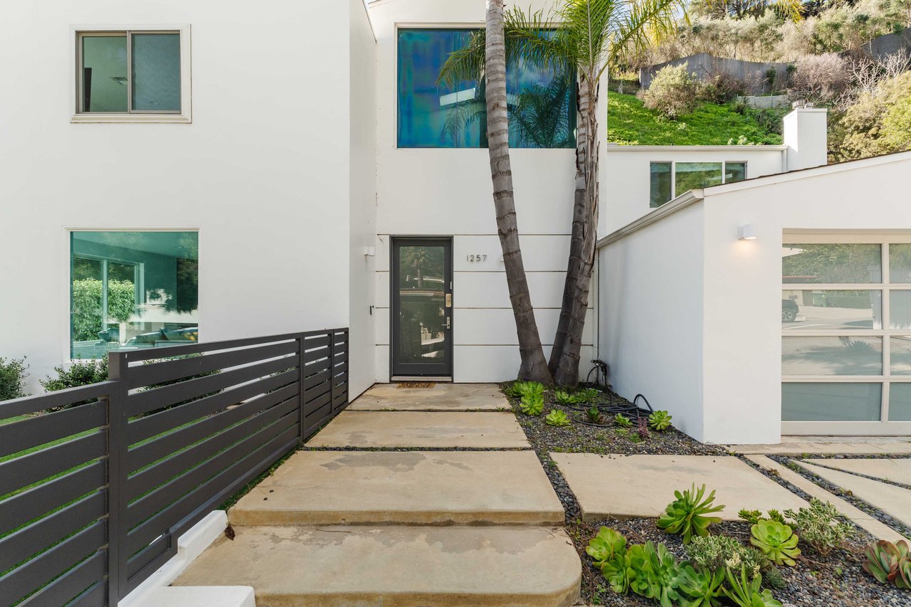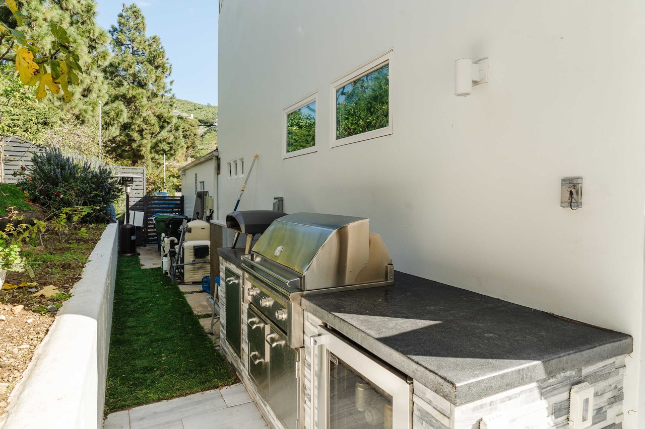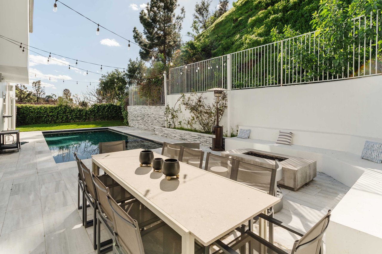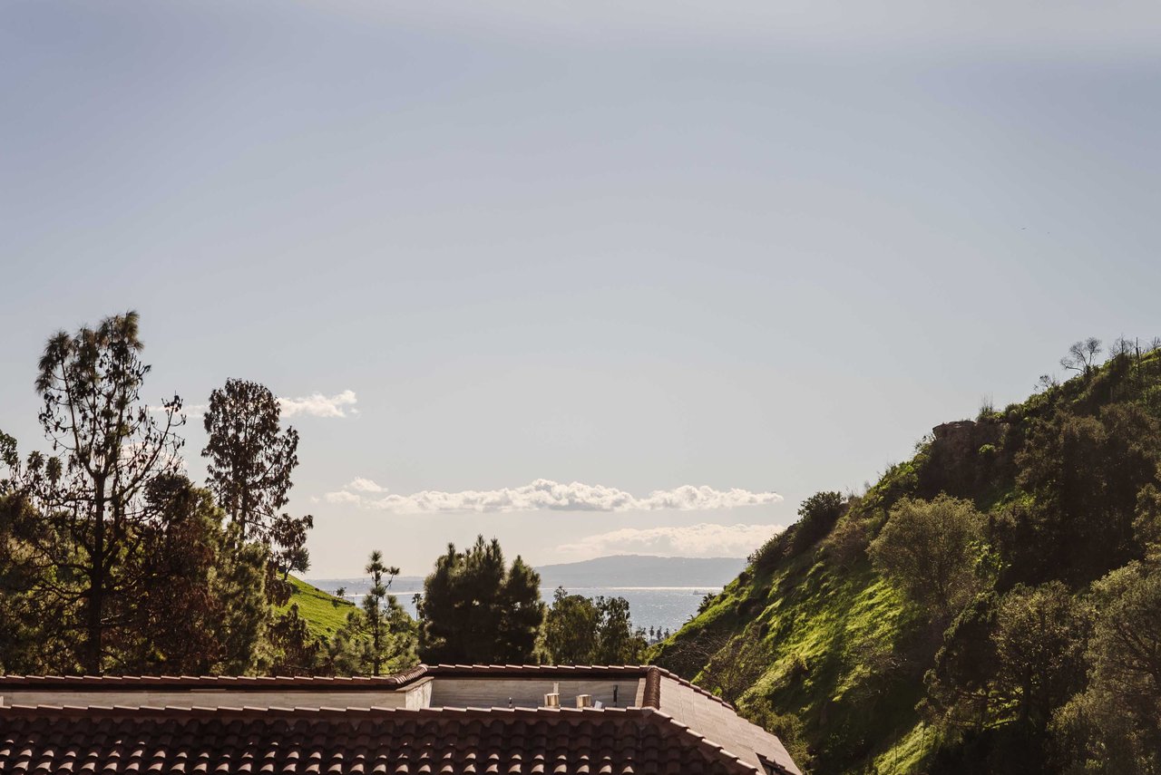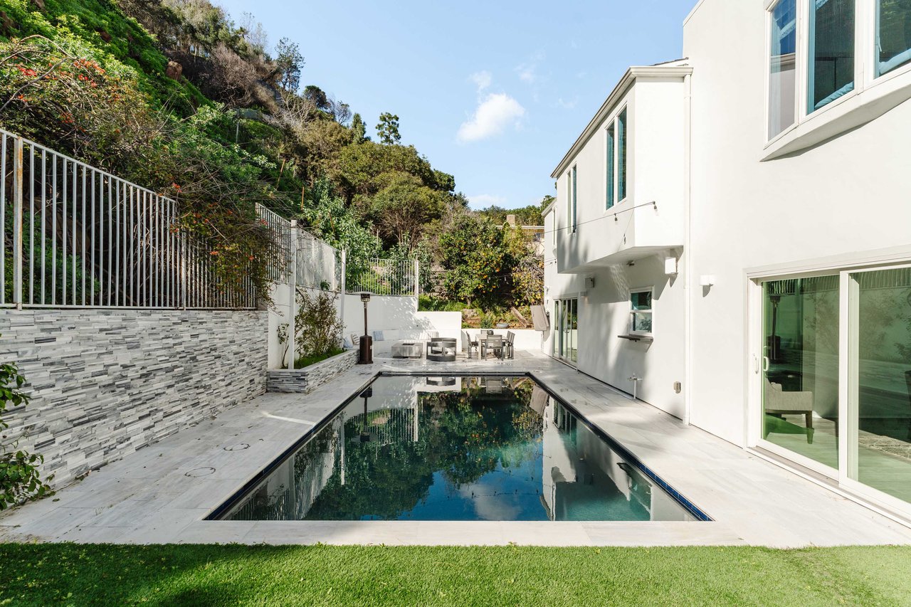 Set in the famed Marquez Knolls, this contemporary residence offers serene privacy in a truly bucolic setting. Guests are welcomed by a stately foyer with gallery walls, leading into an expansive open floorplan designed for seamless entertaining. The great room, anchored by a sophisticated fireplace and formal dining area, is bathed in natural light from large southern-facing windows. The chef’s kitchen is a masterclass in design, featuring a Wolf 6-burner double oven, Sub-Zero fridge/freezer, and custom cabinetry centered around a striking waterfall countertop with informal dining. An inviting family room adjoins the kitchen, creating a perfect hub for daily life. Upstairs, the primary suite serves as a private sanctuary, detailed with custom built-ins, skylights, and a large custom closet. The spa-like ensuite bath features dual vanities and an oversized shower with a bench. Three additional bedrooms off the landing offer breathtaking canyon and ocean vistas, sharing a bright, designer bathroom with tub and shower. The resort-caliber backyard is an entertainer's dream, featuring a saltwater pool with a baja shelf, a spa, and a built-in firepit lounge. A dedicated BBQ station services the alfresco dining terrace, while a lush, fenced lawn wraps around the home. The home is completed by a 2-car garage that also functions as a gym along with a laundry area. Located in a tight-knit community known for its resilience and charm, this home offers the quintessential Palisades lifestyle.