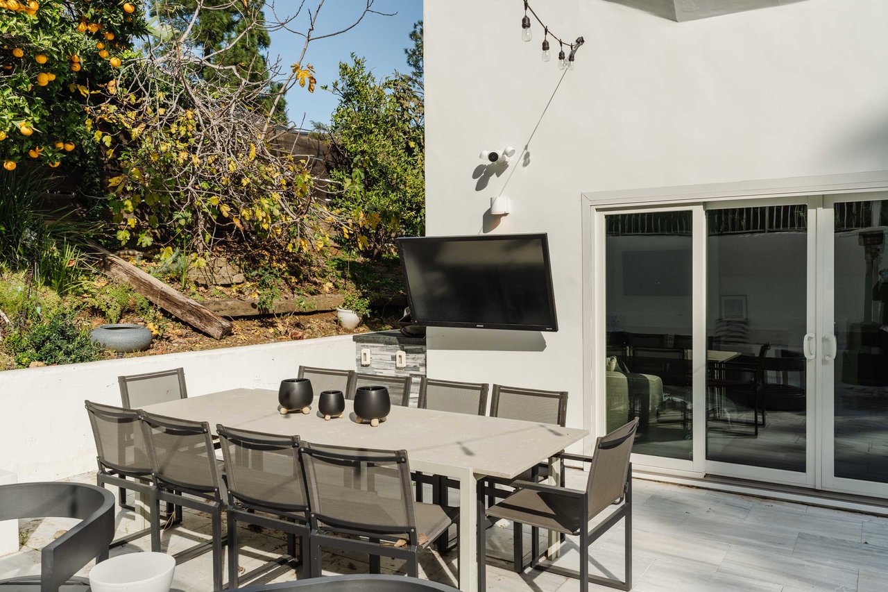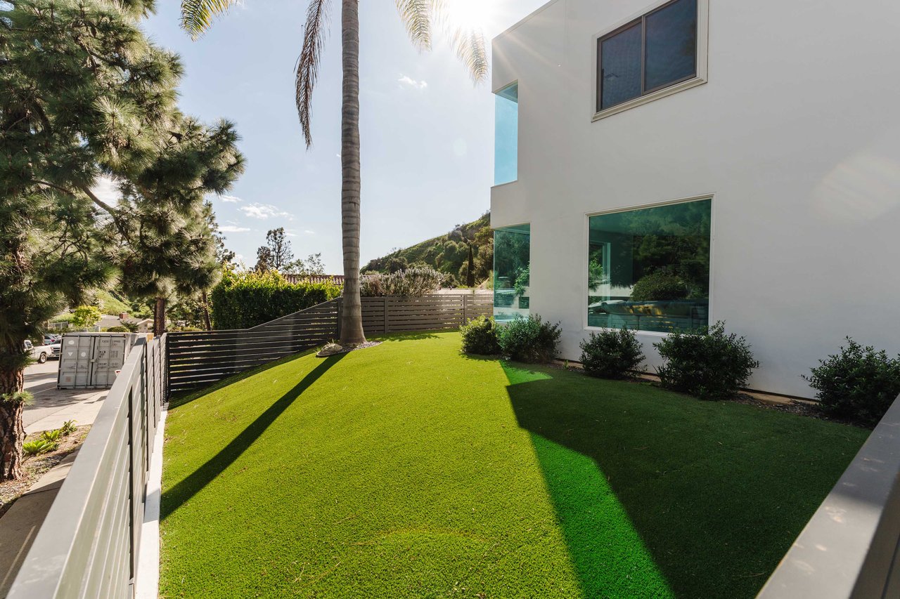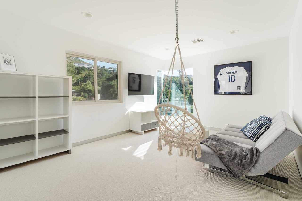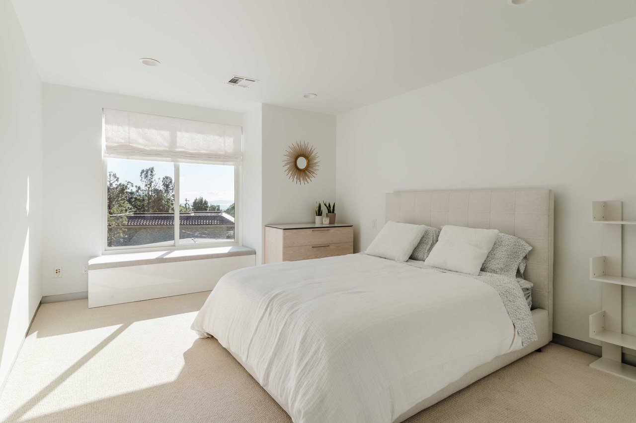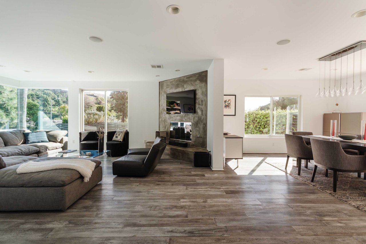 Set in the famed Marquez Knolls, this contemporary residence offers serene privacy in a truly bucolic setting. Guests are welcomed by a stately foyer with gallery walls, leading into an expansive open floorplan designed for seamless entertaining. The great room, anchored by a sophisticated fireplace and formal dining area, is bathed in natural light from large southern-facing windows. The chef’s kitchen is a masterclass in design, featuring a Wolf 6-burner double oven, Sub-Zero fridge/freezer, and custom cabinetry centered around a striking waterfall countertop with informal dining. An inviting family room adjoins the kitchen, creating a perfect hub for daily life. Upstairs, the primary suite serves as a private sanctuary, detailed with custom built-ins, skylights, and a large custom closet. The spa-like ensuite bath features dual vanities and an oversized shower with a bench. Three additional bedrooms off the landing offer breathtaking canyon and ocean vistas, sharing a bright, designer bathroom with tub and shower. The resort-caliber backyard is an entertainer's dream, featuring a saltwater pool with a baja shelf, a spa, and a built-in firepit lounge. A dedicated BBQ station services the alfresco dining terrace, while a lush, fenced lawn wraps around the home. The home is completed by a 2-car garage that also functions as a gym along with a laundry area. Located in a tight-knit community known for its resilience and charm, this home offers the quintessential Palisades lifestyle.