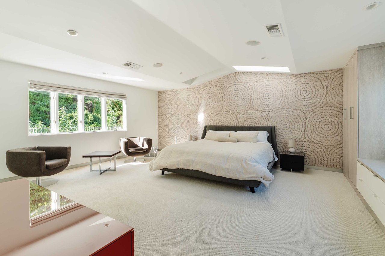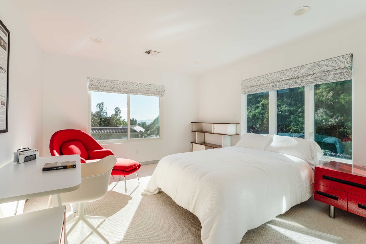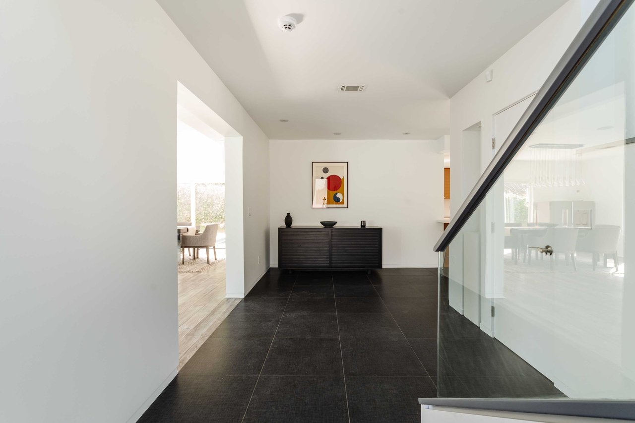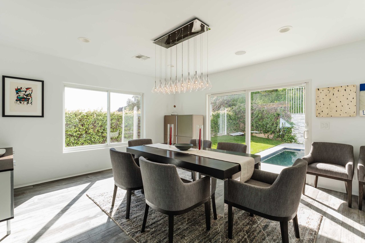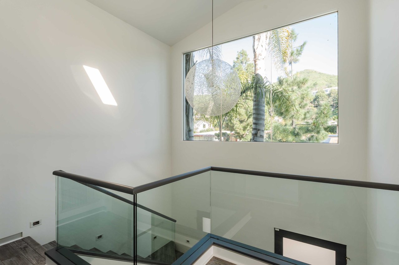Set in the famed Marquez Knolls, this contemporary residence offers serene privacy in a truly bucolic setting. Guests are welcomed by a stately foyer with gallery walls, leading into an expansive open floorplan designed for seamless entertaining. The great room, anchored by a sophisticated fireplace and formal dining area, is bathed in natural light from large southern-facing windows. The chef’s kitchen is a masterclass in design, featuring a Wolf 6-burner double oven, Sub-Zero fridge/freezer, and custom cabinetry centered around a striking waterfall countertop with informal dining. An inviting family room adjoins the kitchen, creating a perfect hub for daily life. Upstairs, the primary suite serves as a private sanctuary, detailed with custom built-ins, skylights, and a large custom closet. The spa-like ensuite bath features dual vanities and an oversized shower with a bench. Three additional bedrooms off the landing offer breathtaking canyon and ocean vistas, sharing a bright, designer bathroom with tub and shower. The resort-caliber backyard is an entertainer's dream, featuring a saltwater pool with a baja shelf, a spa, and a built-in firepit lounge. A dedicated BBQ station services the alfresco dining terrace, while a lush, fenced lawn wraps around the home. The home is completed by a 2-car garage that also functions as a gym along with a laundry area. Located in a tight-knit community known for its resilience and charm, this home offers the quintessential Palisades lifestyle.