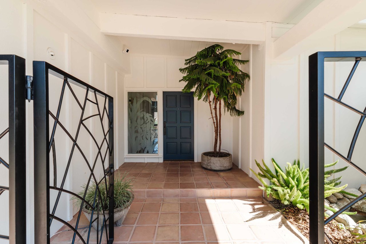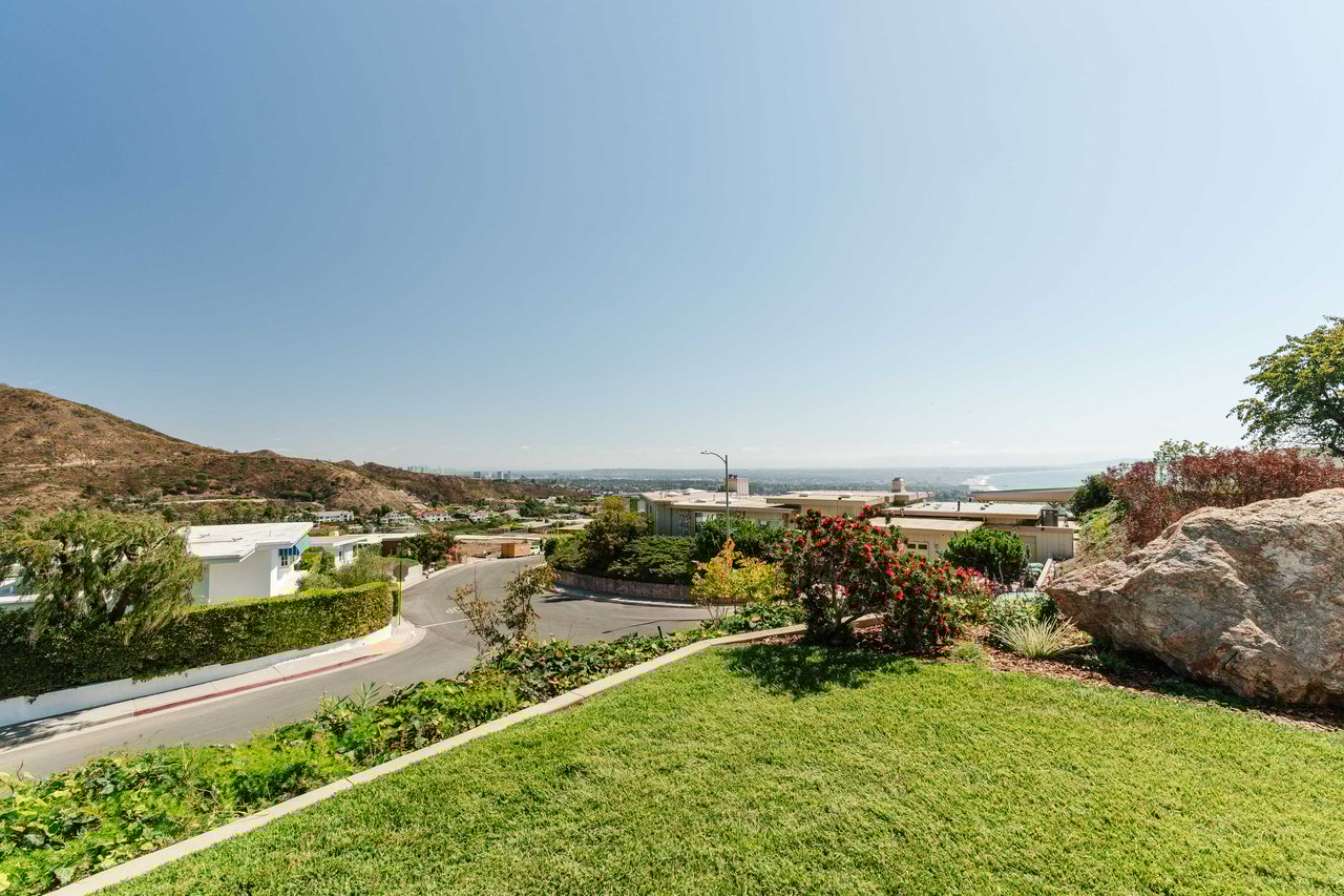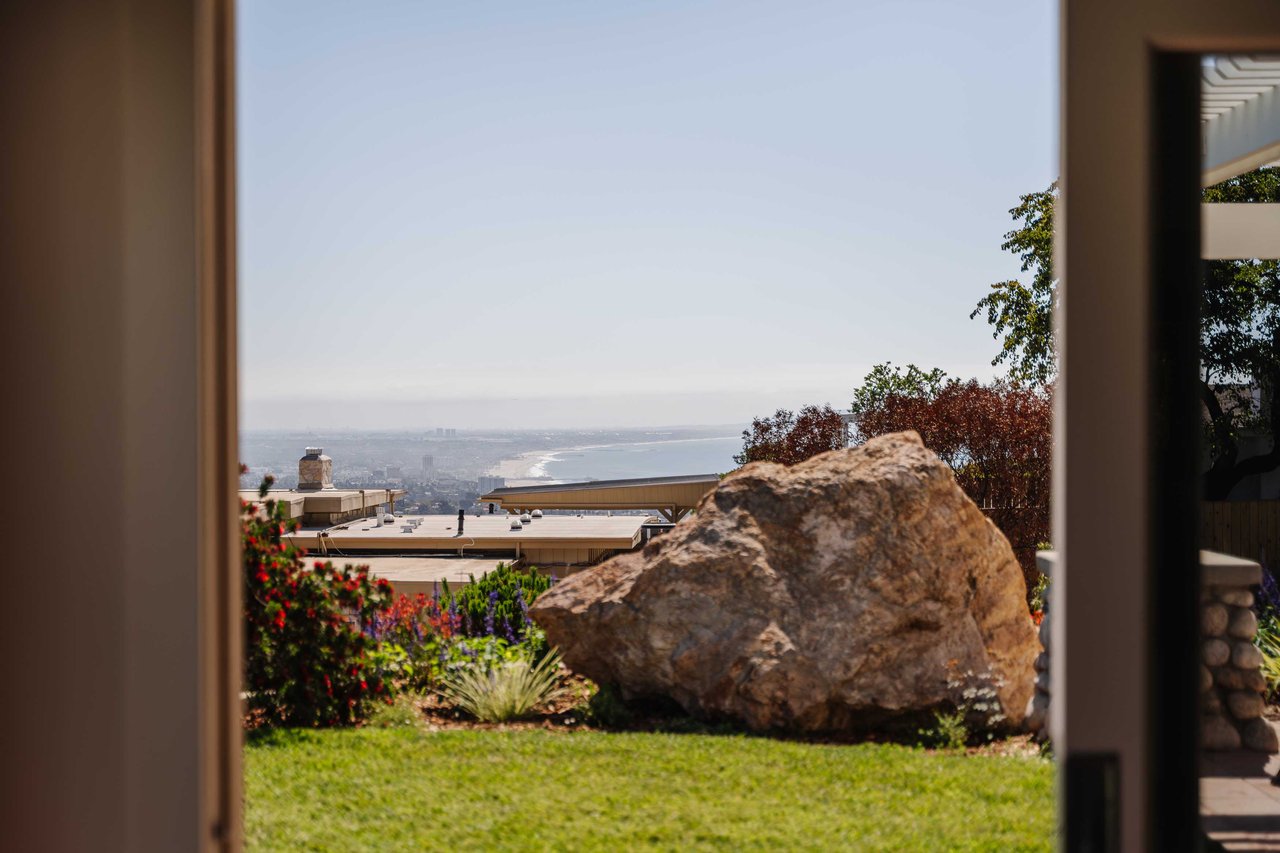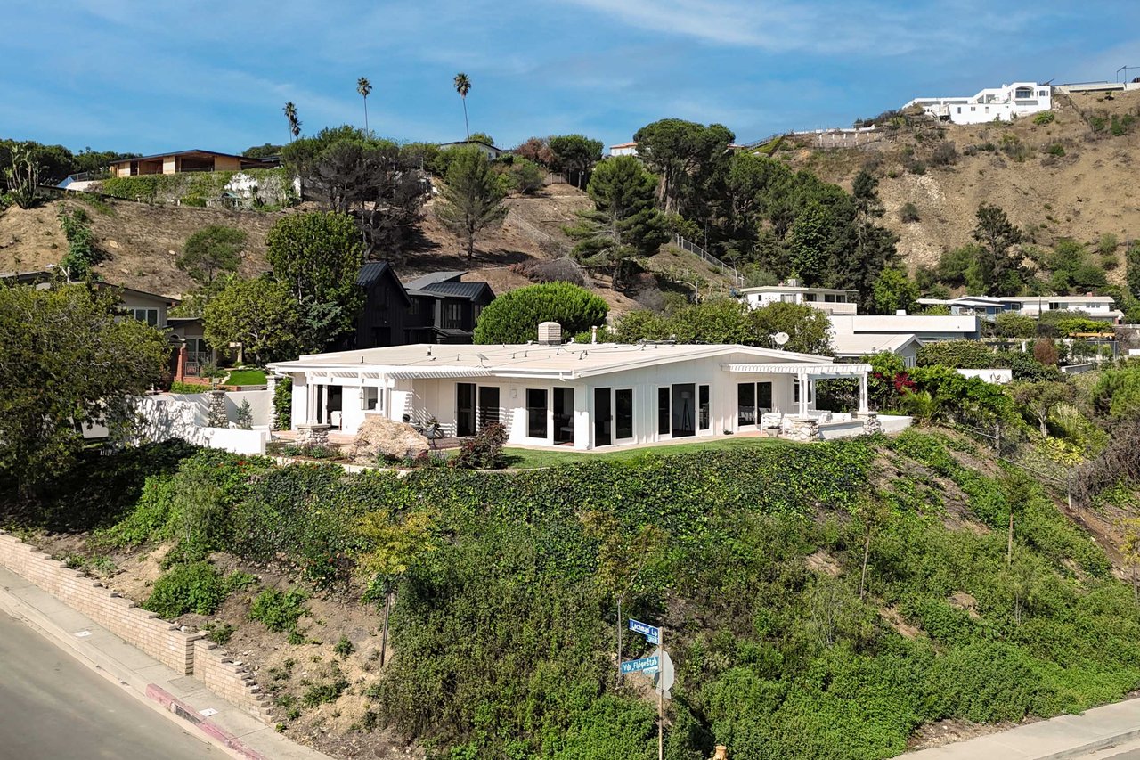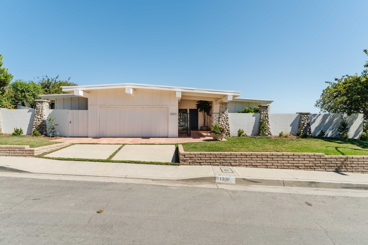 This beautiful, single-level, midcentury residence blends panoramic views from downtown to the coastline and ocean - all on a street-to-street, corner lot set above the neighborhood on an over 12,000-square-foot promontory. Originally designed in 1973 to bring the vistas inside, the home showcases vaulted ceilings with exposed beams, walls of glass, and more. Through the gated entry, guests are welcomed past an outdoor foyer with a water feature into the open layout heart of the home; a formal living room with fireplace, original kitchen, and dining room - all oriented toward the views. Past the den (which could serve as a fourth bedroom), discover three bedrooms, including the primary suite with two closets, a bath with a shower and large vanity, and a private patio overlooking the views. The two guest bedrooms down the hallway share a hall bath with tub. The outdoors wrap around the home with multiple grassy areas, lounging spots, al-fresco dining areas, and newly landscaped grounds that thoughtfully combine mature plantings with fresh additions. Completing the property are a direct-access two-car garage, central air/heat, beautiful tile floors, new carpets in the bedrooms, a powder room, and more. Located off Lachman Lane among many still-standing homes, this stunning residence has been fully remediated and passed post-remediation testing. The property presents an excellent option in its current state, with the added potential to reimagine into the neighborhood’s next great home.