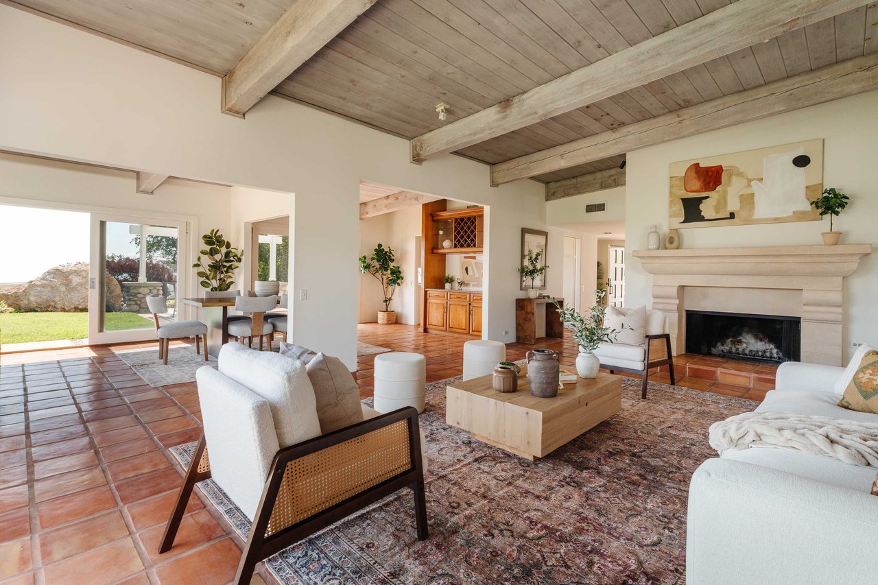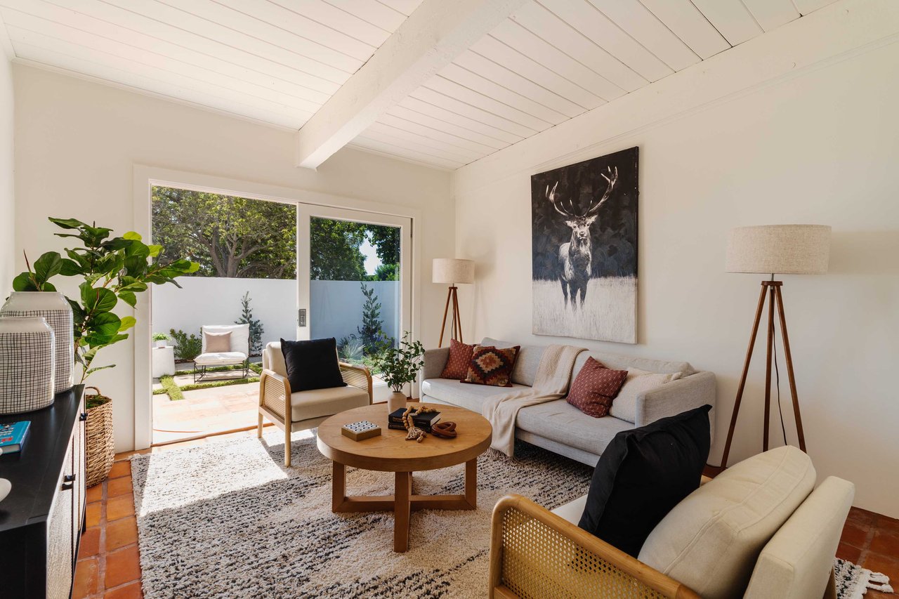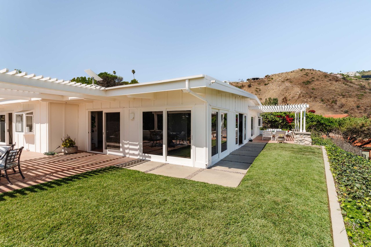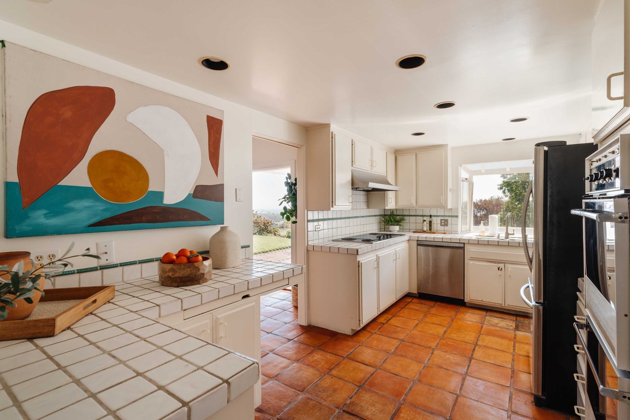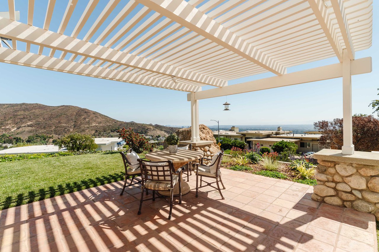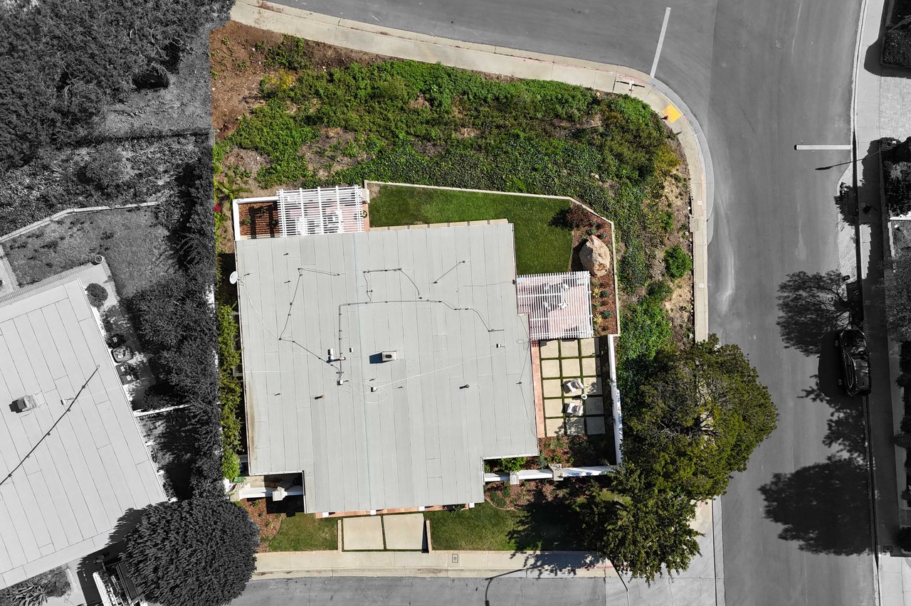 This beautiful, single-level, midcentury residence blends panoramic views from downtown to the coastline and ocean - all on a street-to-street, corner lot set above the neighborhood on an over 12,000-square-foot promontory. Originally designed in 1973 to bring the vistas inside, the home showcases vaulted ceilings with exposed beams, walls of glass, and more. Through the gated entry, guests are welcomed past an outdoor foyer with a water feature into the open layout heart of the home; a formal living room with fireplace, original kitchen, and dining room - all oriented toward the views. Past the den (which could serve as a fourth bedroom), discover three bedrooms, including the primary suite with two closets, a bath with a shower and large vanity, and a private patio overlooking the views. The two guest bedrooms down the hallway share a hall bath with tub. The outdoors wrap around the home with multiple grassy areas, lounging spots, al-fresco dining areas, and newly landscaped grounds that thoughtfully combine mature plantings with fresh additions. Completing the property are a direct-access two-car garage, central air/heat, beautiful tile floors, new carpets in the bedrooms, a powder room, and more. Located off Lachman Lane among many still-standing homes, this stunning residence has been fully remediated and passed post-remediation testing. The property presents an excellent option in its current state, with the added potential to reimagine into the neighborhood’s next great home.