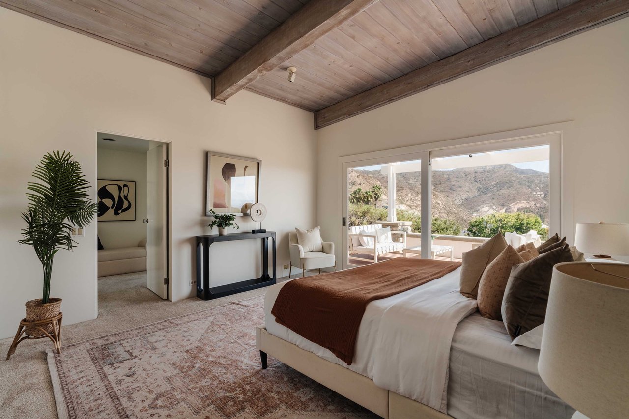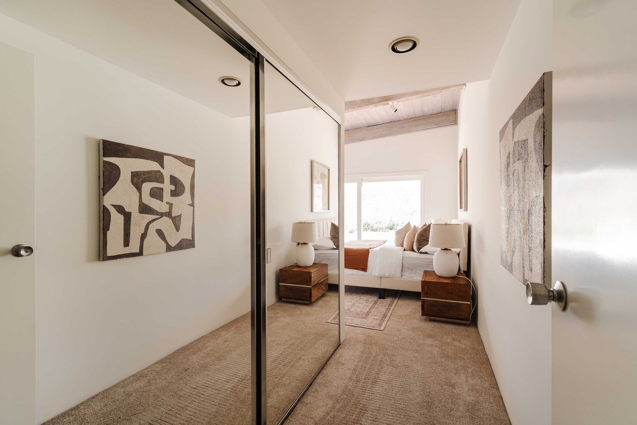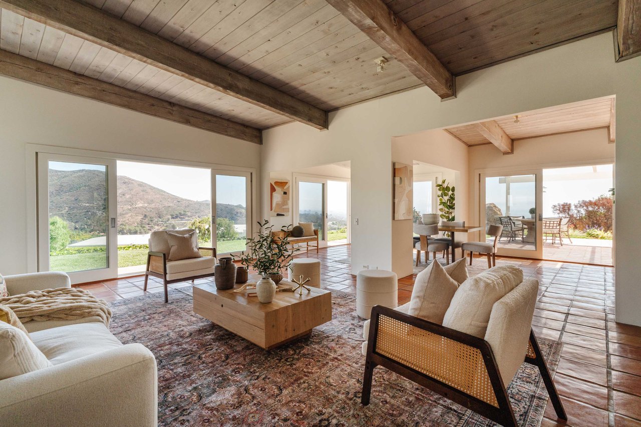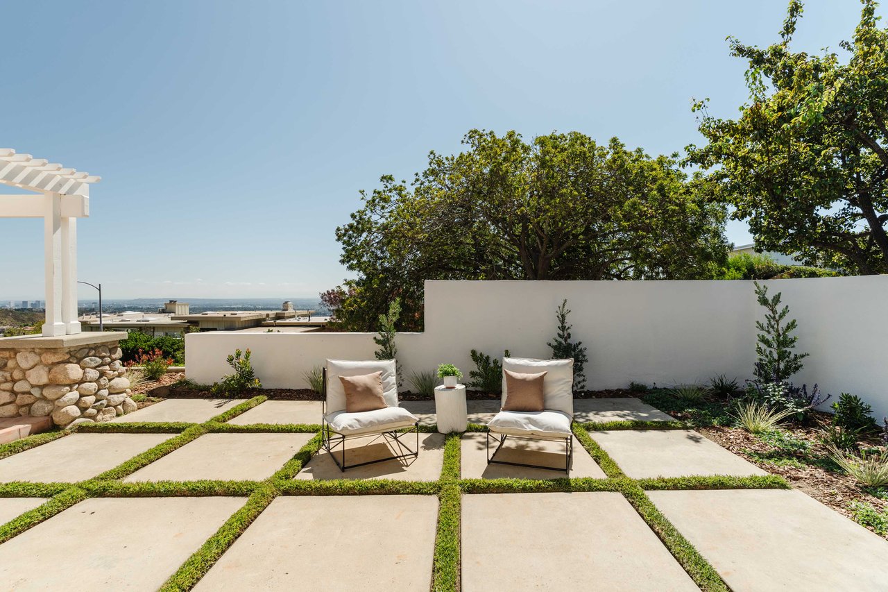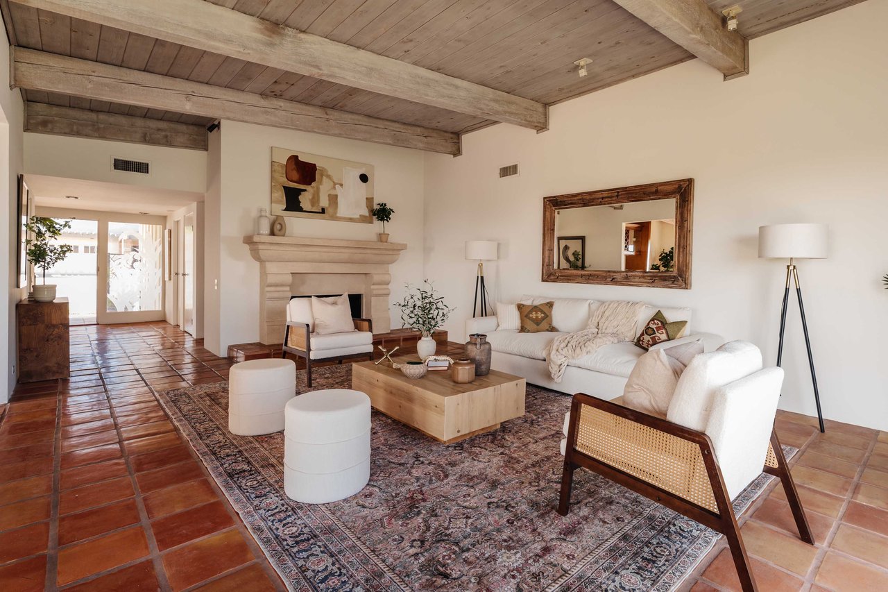 This beautiful, single-level, midcentury residence blends panoramic views from downtown to the coastline and ocean - all on a street-to-street, corner lot set above the neighborhood on an over 12,000-square-foot promontory. Originally designed in 1973 to bring the vistas inside, the home showcases vaulted ceilings with exposed beams, walls of glass, and more. Through the gated entry, guests are welcomed past an outdoor foyer with a water feature into the open layout heart of the home; a formal living room with fireplace, original kitchen, and dining room - all oriented toward the views. Past the den (which could serve as a fourth bedroom), discover three bedrooms, including the primary suite with two closets, a bath with a shower and large vanity, and a private patio overlooking the views. The two guest bedrooms down the hallway share a hall bath with tub. The outdoors wrap around the home with multiple grassy areas, lounging spots, al-fresco dining areas, and newly landscaped grounds that thoughtfully combine mature plantings with fresh additions. Completing the property are a direct-access two-car garage, central air/heat, beautiful tile floors, new carpets in the bedrooms, a powder room, and more. Located off Lachman Lane among many still-standing homes, this stunning residence has been fully remediated and passed post-remediation testing. The property presents an excellent option in its current state, with the added potential to reimagine into the neighborhood’s next great home.