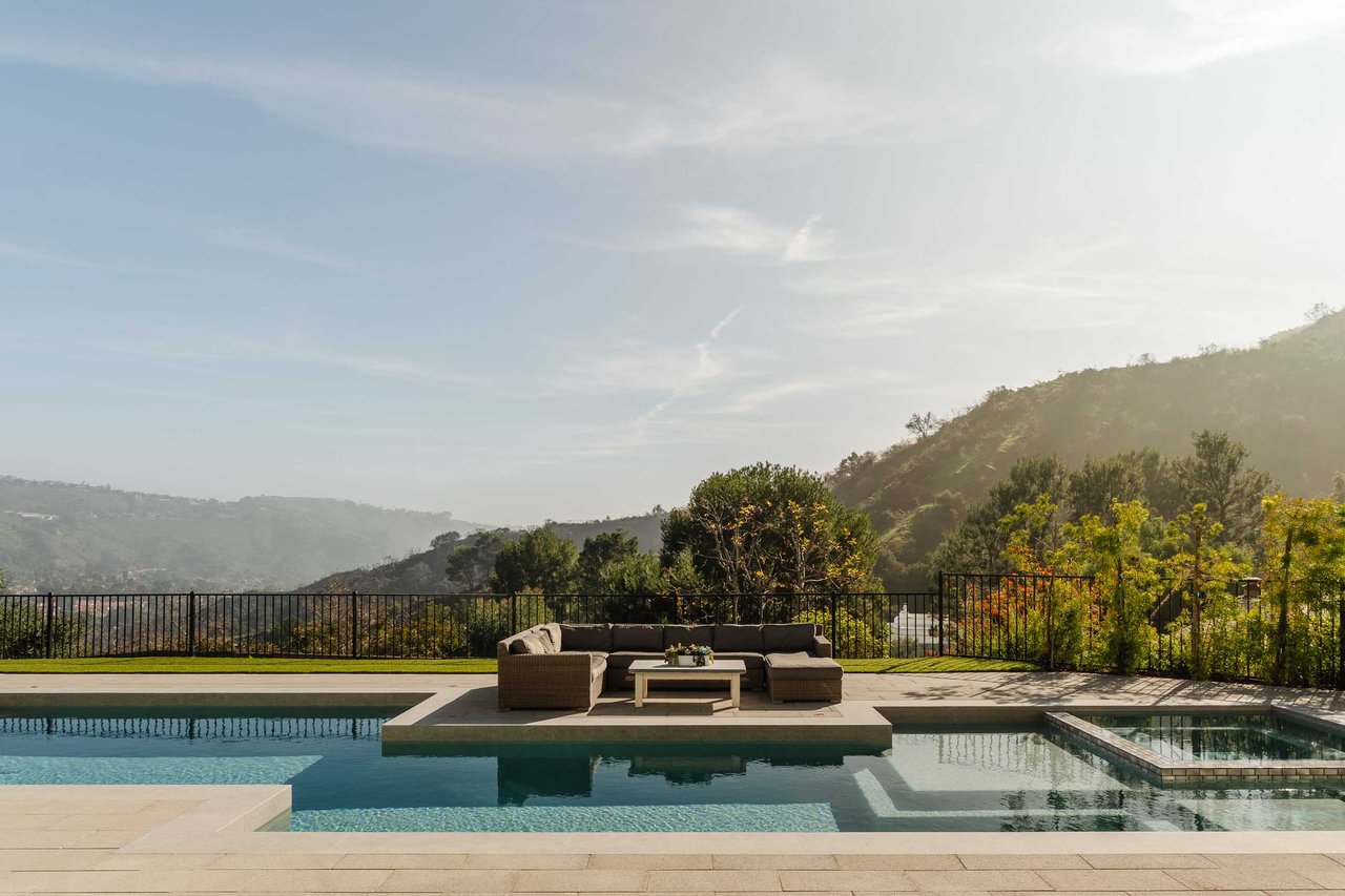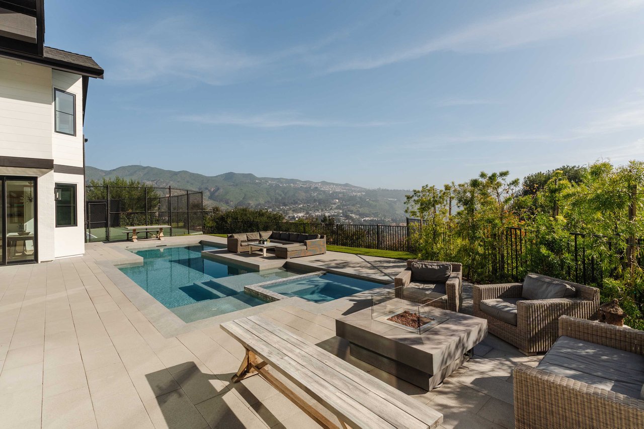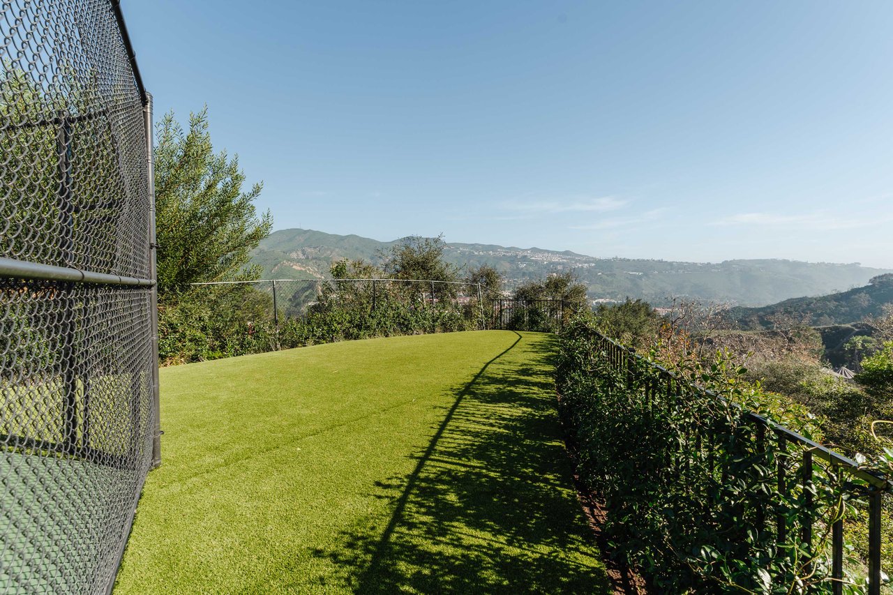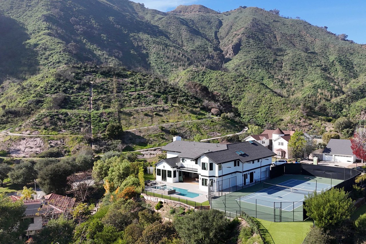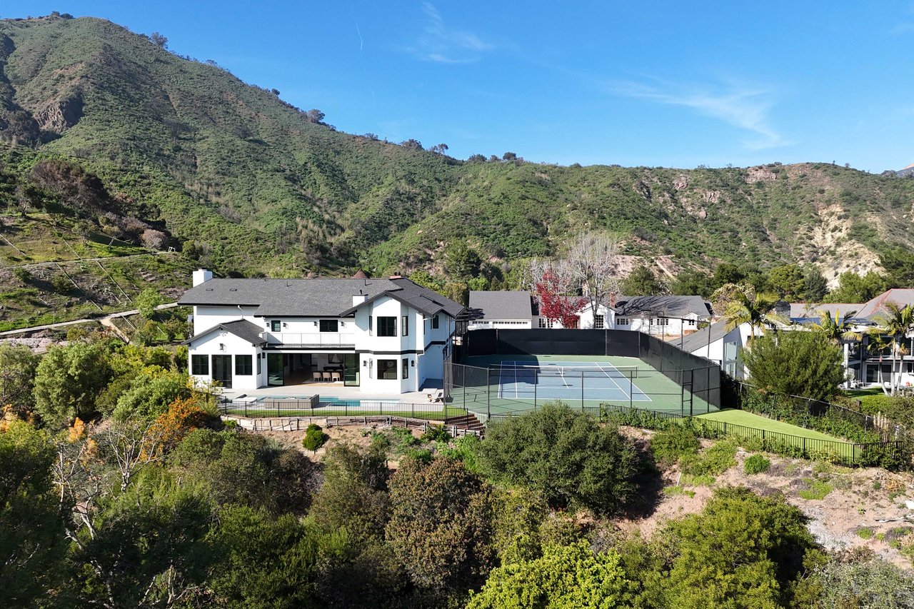 Situated within the exclusive 24-hour guard-gated Country Estates, this designer-done tennis court estate offers an unparalleled blend of security, privacy, and modern luxury. Completely remodeled in 2024, the residence is set on over half an acre of beautifully curated grounds defined by panoramic views. Guests are welcomed under a two-story foyer into the heart of the home. The open floor plan is anchored by a world-class chef’s kitchen featuring dual waterfall islands, a 60-inch La Cornue rangetop, Wolf ovens, Sub-Zero fridges/freezer, and walk-in pantry - all flowing seamlessly into the dining area with massive sliding walls of glass that open to the backyard and views. The family room with wet bar and stunning fireplace also flanks this area. For more formal occasions, the living room impresses with soaring ceilings and a floor-to-ceiling black marble fireplace. The downstairs is completed by a mud room/secondary laundry room, powder room, and guest suite/office that functions as the pool/tennis quarters. Upstairs off of the main landing are four refined suites, led by the spectacular primary suite under vaulted ceilings, featuring a stone fireplace, personal kitchenette, massive walk-in closet, and balcony that flows out to the views. The primary suite’s spa-like bathroom boasts dual glass showers illuminated by skylights, dual vanities, a gorgeous standalone tub, and heated flooring. Every guest room is thoughtfully appointed with large bedrooms, curated bathrooms, and plentiful closet space. The upstairs is completed by a custom movie theater with stadium seating and bonus/popcorn room, and generously sized laundry room. The backyard serves as a private resort that pours out to the views over a sparkling pool, spa, and fire-pit lounge - providing the ultimate vantage point for dramatic vistas day or night. The backyard also features a coveted North-South tennis court, fully equipped with championship lights, ball machine, serving machine, and ball mower - ideal for professionals and enthusiasts alike. The home also boasts cutting-edge smart home technology, Frame TVs in nearly every room, a full Lutron lighting system, integrated security, mutil-zone HVAC, and a three-car garage with EV charging. This is a rare opportunity to own one of the most pristine properties, not just in the Palisades, but on the Westside.