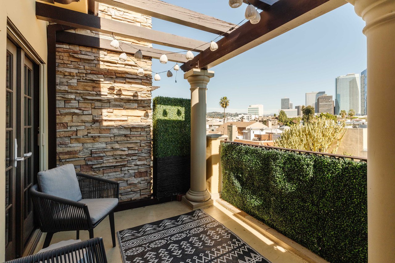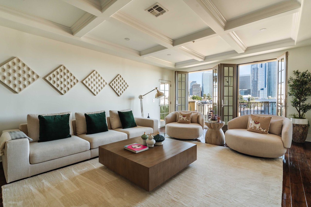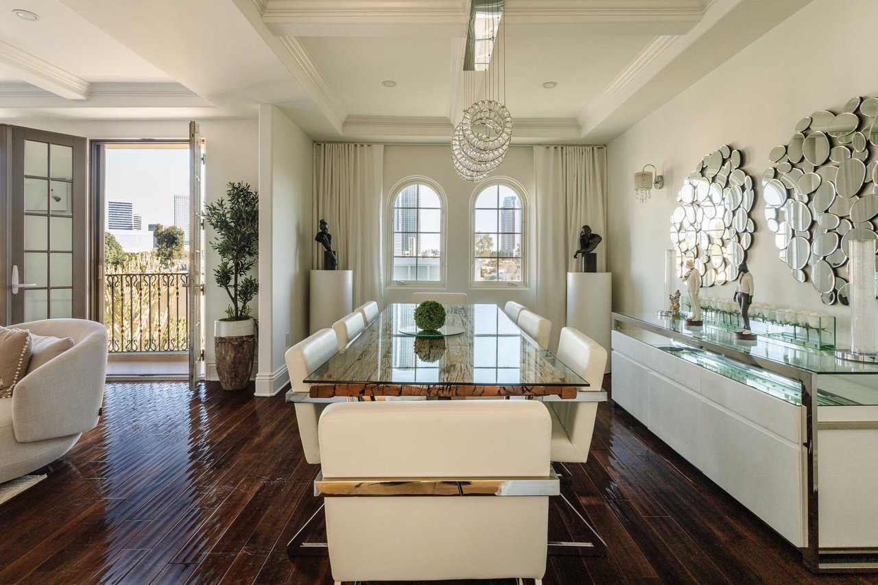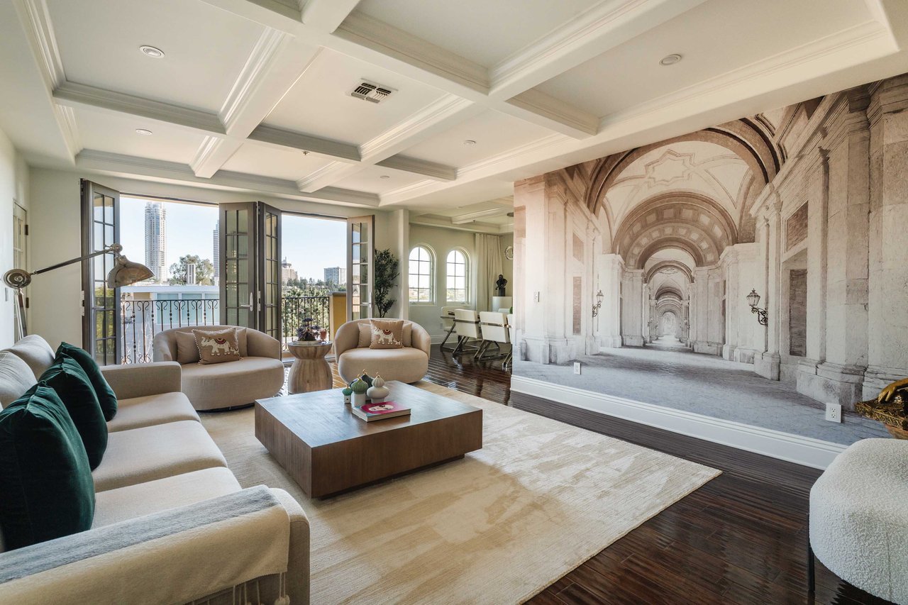 This bespoke contemporary penthouse offers over 3,100 SF of refined living with incredible city and mountain views from the heart of the residence. Upon entry, guests are welcomed into a foyer lined by gallery walls. Down the main hallway is the formal living room with sublime city views out to Century City. Through the formal dining room, find the recently redone kitchen with top appliances from Wolf, Viking, and Sub-Zero, and gorgeous stone countertops. The family room with fireplace flows from the kitchen and is perfect for entertaining small gatherings and large parties alike. Down the hall are the three guest suites including the expansive primary suite featuring a spacious walk-in closet and spa-like bath with dual vanities, a large soaking tub, and oversized shower. The guest bedrooms are generously sized, with one of the two bedrooms featuring a balcony that pours out to sprawling views of the city and mountains. Meticulously crafted with custom moldings, coffered ceilings, and premium wood/stone floors. This offering features a full-sized laundry room with a utility sink, dedicated storage, garage with tandem parking along with a designated electric car charger and an additional spacious storage room, as well as building perks like visitor parking and a gym. Perfectly positioned moments from the boutiques and restaurants of Century City and Beverly Hills. This move-in-ready residence delivers elevated living at its finest, offering the privacy, scale, and sophistication of a luxury estate without the maintenance of a single-family home.