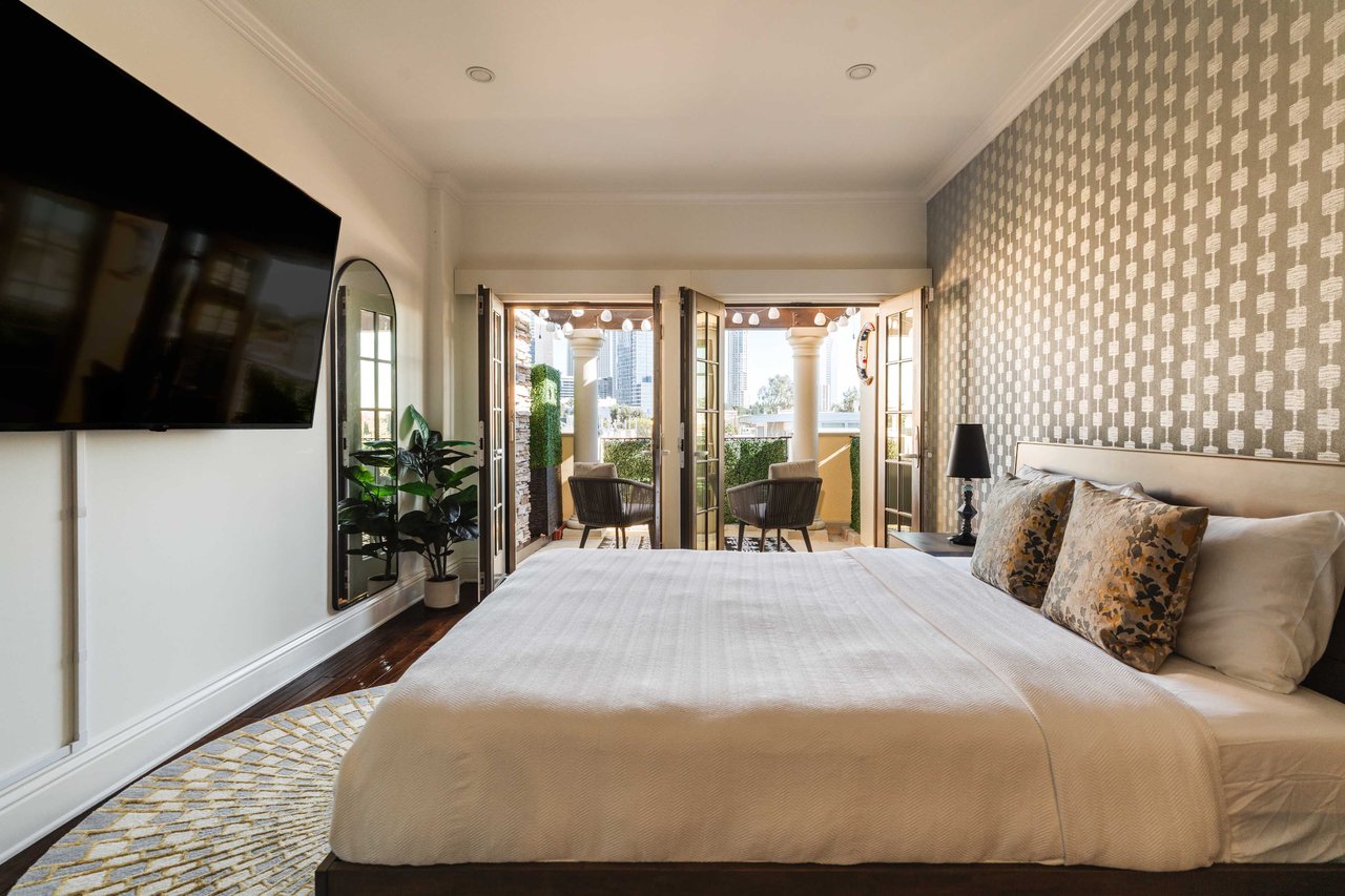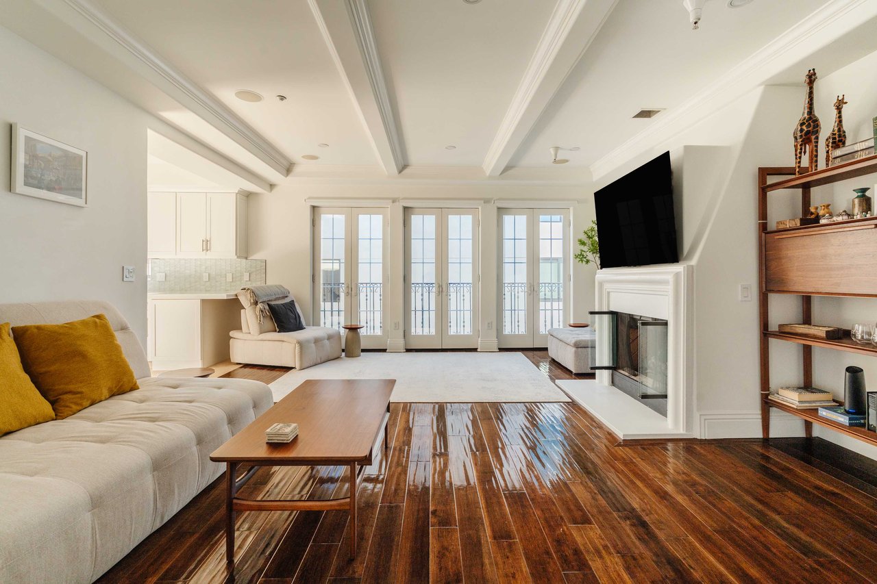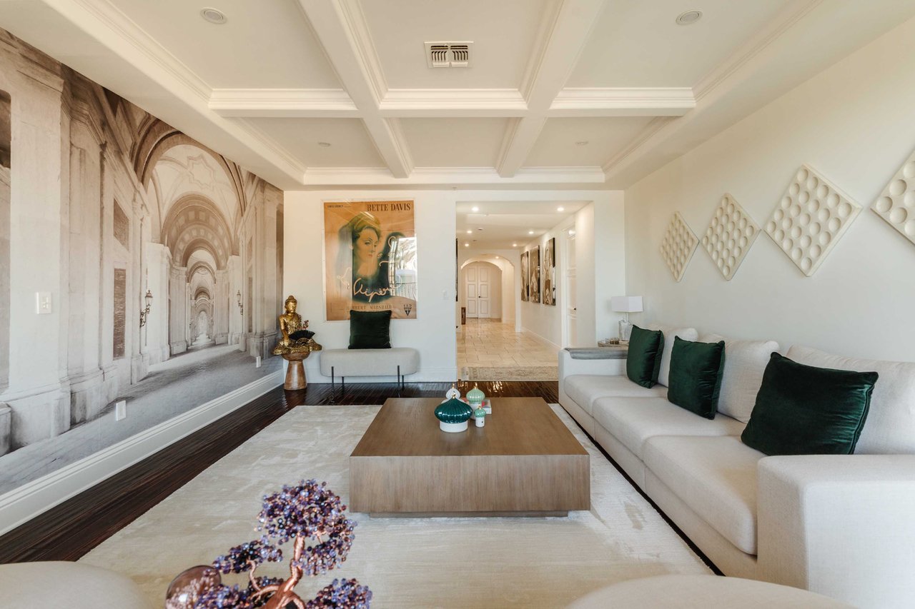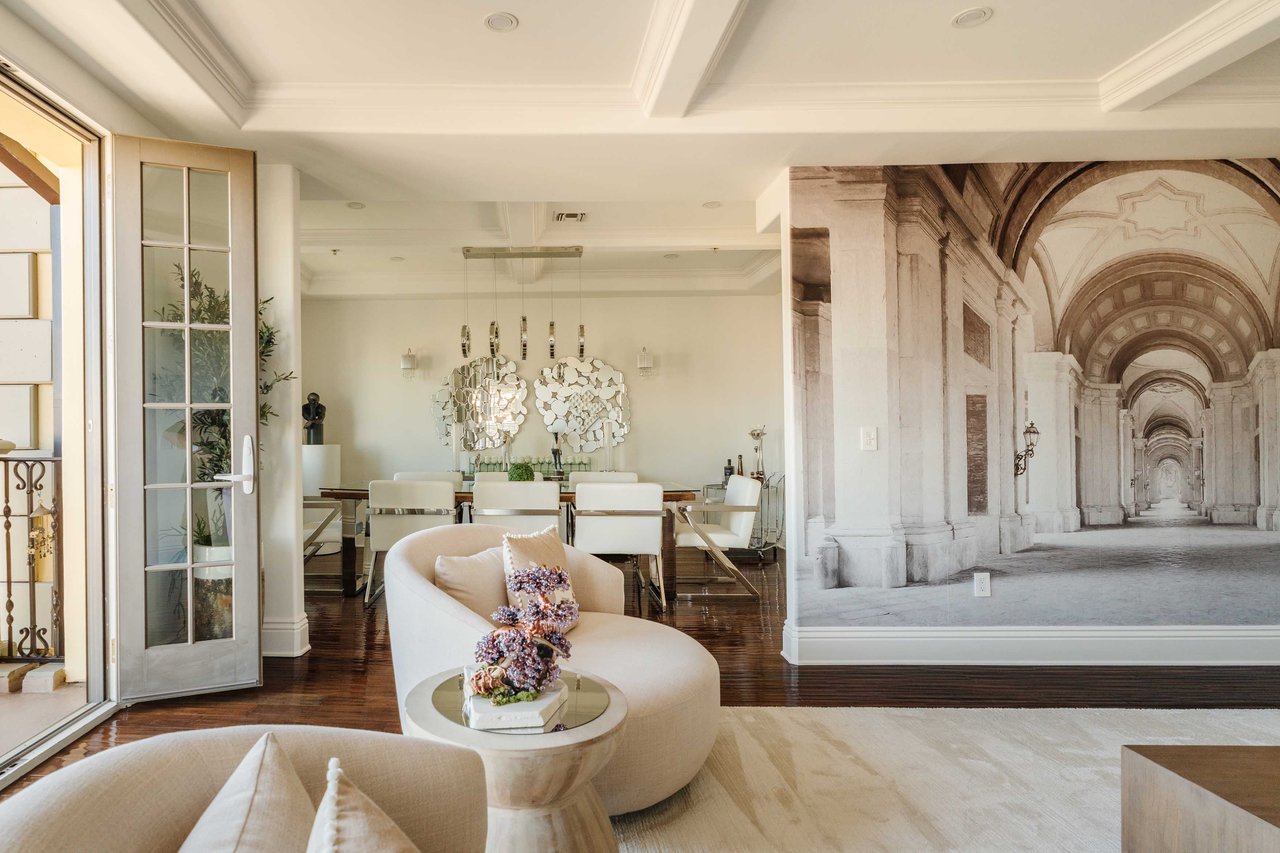 This bespoke contemporary penthouse offers over 3,100 SF of refined living with incredible city and mountain views from the heart of the residence. Upon entry, guests are welcomed into a foyer lined by gallery walls. Down the main hallway is the formal living room with sublime city views out to Century City. Through the formal dining room, find the recently redone kitchen with top appliances from Wolf, Viking, and Sub-Zero, and gorgeous stone countertops. The family room with fireplace flows from the kitchen and is perfect for entertaining small gatherings and large parties alike. Down the hall are the three guest suites including the expansive primary suite featuring a spacious walk-in closet and spa-like bath with dual vanities, a large soaking tub, and oversized shower. The guest bedrooms are generously sized, with one of the two bedrooms featuring a balcony that pours out to sprawling views of the city and mountains. Meticulously crafted with custom moldings, coffered ceilings, and premium wood/stone floors. This offering features a full-sized laundry room with a utility sink, dedicated storage, garage with tandem parking along with a designated electric car charger and an additional spacious storage room, as well as building perks like visitor parking and a gym. Perfectly positioned moments from the boutiques and restaurants of Century City and Beverly Hills. This move-in-ready residence delivers elevated living at its finest, offering the privacy, scale, and sophistication of a luxury estate without the maintenance of a single-family home.