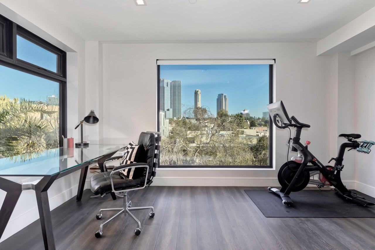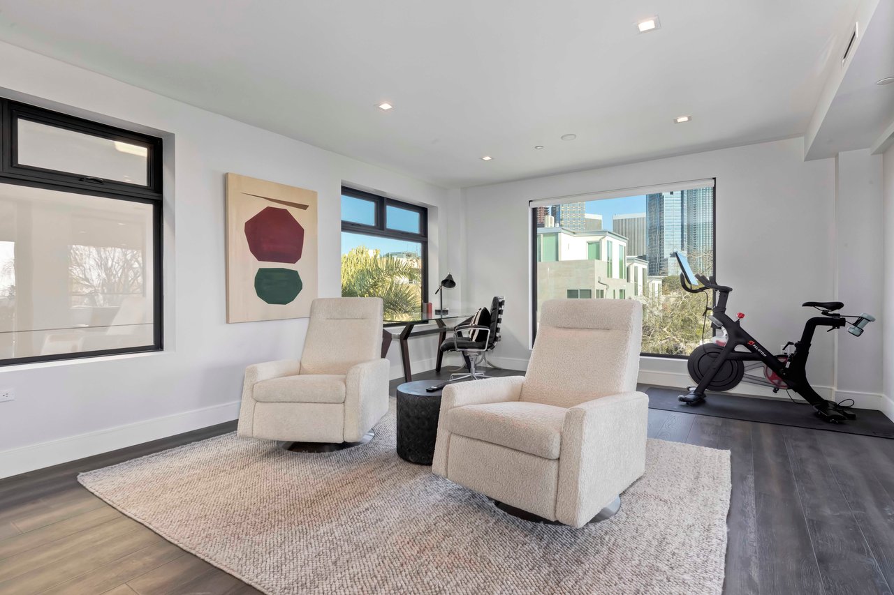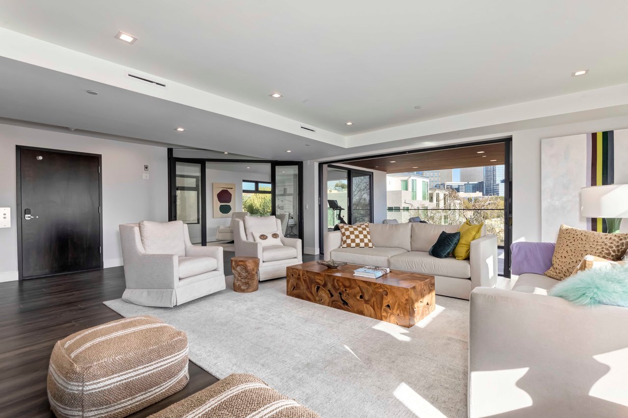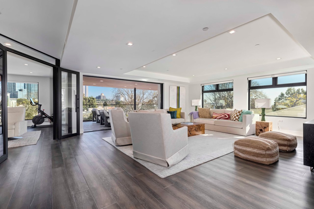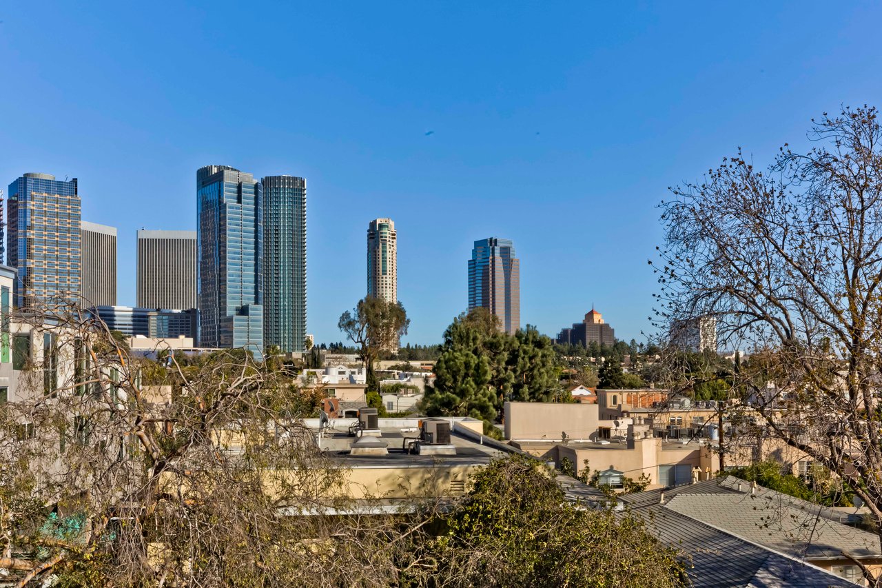 Set within a luxurious four-residence building, this bespoke contemporary home offers nearly 3,000 SF of refined living on its own floor with no shared walls. Guests are welcomed into the residence via a direct-access elevator. The grand, light-filled great room is anchored by wide-plank hardwood floors and expansive glass doors that seamlessly open to a generous terrace with captivating eastern views toward Century City. Designed for both everyday comfort and sophisticated entertaining, the layout includes a spacious living area and a glass-enclosed office. The impressive chef’s kitchen boasts professional-grade Wolf appliances, a Sub-Zero refrigerator, dual ovens, a 60-bottle wine fridge, an oversized island with bar seating, and custom cabinetry. A charming dining area sits adjacent, perfect for intimate dinners or festive gatherings. The bedroom wing hosts the stately primary suite featuring a double-sided fireplace, an expansive walk-in closet, and a spa-like bath appointed with floating dual vanities, a freestanding soaking tub, and an oversized glass shower. Additional highlights include a stylish powder room, side-by-side laundry, abundant storage, and dual-zone HVAC. Perfectly positioned moments from the Century City, Beverly Hills dining and boutiques, and world-class golf at LACC and Rancho Park. This move-in-ready residence delivers elevated living at its finest - offering privacy, scale, and style without the upkeep of a single-family home.