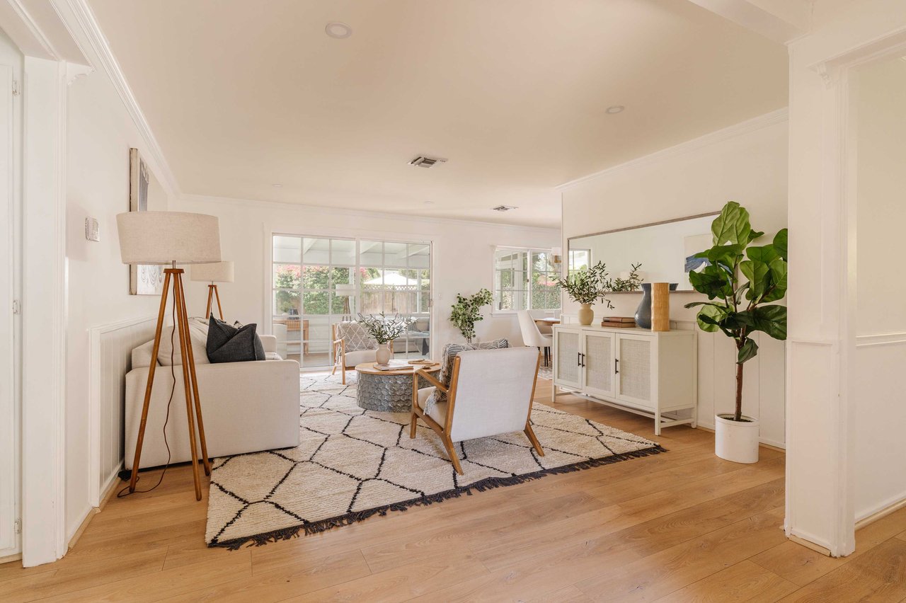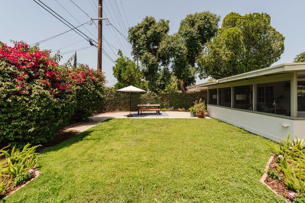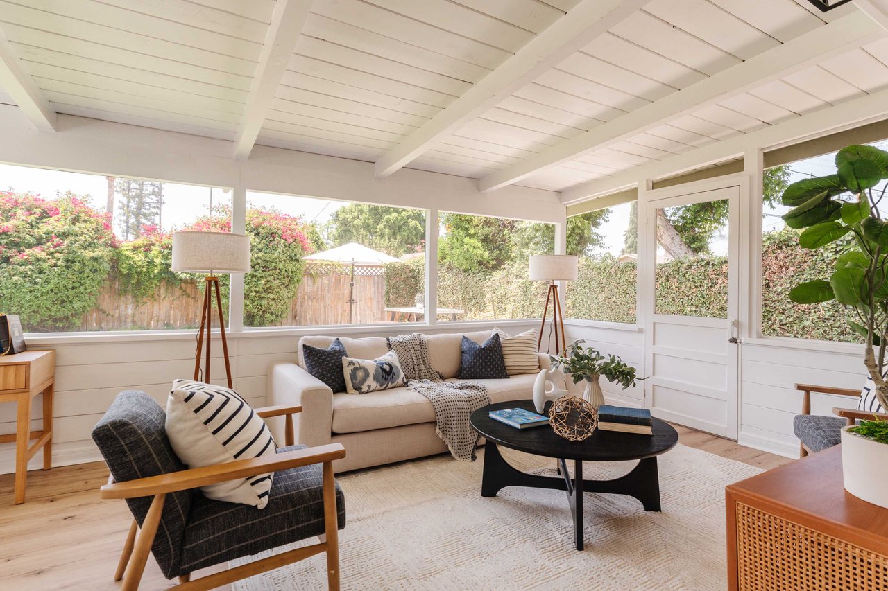 This recently renovated California ranch home offers an inviting presence from every angle. The single-story design beckons you even before stepping inside. A well-manicured exterior highlighted by a spacious grassy lawn and vibrant landscaping guides you to the welcoming entrance. Inside, the thoughtfully designed floor plan features three bedrooms, two bathrooms, plus a versatile enclosed sunroom off the home's main living area. The living room is illuminated by abundant natural light and complemented by soft, neutral tones. The newly updated kitchen is equipped with stainless steel appliances and quartz countertops. An abundance of cabinets and countertop space makes this area functionally fresh. Enhancing your overall living experience is the versatile sunroom, which seamlessly connects indoor living with the backyard. The backyard provides a peaceful retreat with tall hedges for privacy. The grassy lawn is the centerpiece, surrounded by vibrant greenery and colorful flowers along the borders. Mature trees and lush hedges further enhance the sense of seclusion, making it an excellent space for outdoor entertaining or quiet relaxation. The backyard's multiple seating areas and mature plantings create a private sanctuary for outdoor living. Additional features include a new roof, contemporary flooring, stainless steel appliances, central A/C, fresh paint, two-car garage, and space for an RV or boat off the alley. Located in the award-winning Welby Way/El Camino School District and close to Calabasas Commons, Knapp Ranch, Topanga Social, and the new LA Rams Village at Warner Center.