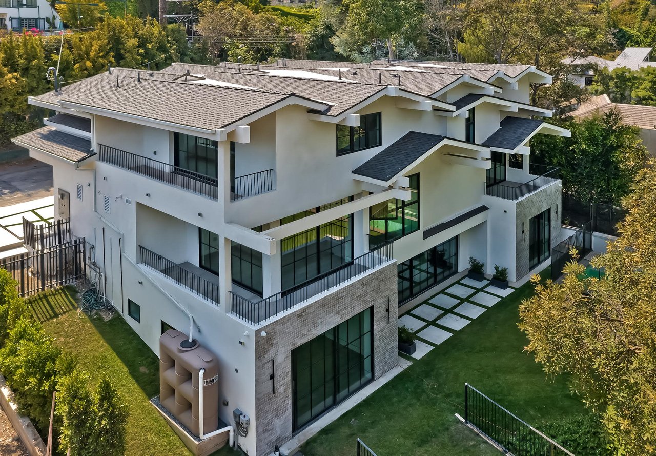 New Construction in the heart of Brentwood. A spectacular opportunity to live with the latest modern amenities in a lush, green, bucolic setting, surrounded by large trees, a private bridge and exquisite views of nature from almost every room. The formal living room is an architectural stunner with its cross-beamed high ceilings and towering black metal picture windows, while anchored by a large double sided fireplace that also serves the formal dining room. A beautifully designed kitchen with custom cabinetry, Miele appliances and an expansive center island with counter seating connects to an open concept family room drenched in an abundance of natural light. Upstairs features an oversized primary suite with balcony, open shower tub area, double vanity and custom walk-in closet, plus two ensuite bedrooms and a spacious laundry room. The lower level offers a superb entertaining space with a gorgeous built-in bar, two large ensuite bedrooms, an adjacent bonus/games area and features Fleetwood sliders offering direct access to a pool, spa and multiple expansive yard areas. All of this within blocks of Brentwood Village, minutes to the beach and located in one of Los Angeles' most sought-after neighborhoods within an excellent public school system.