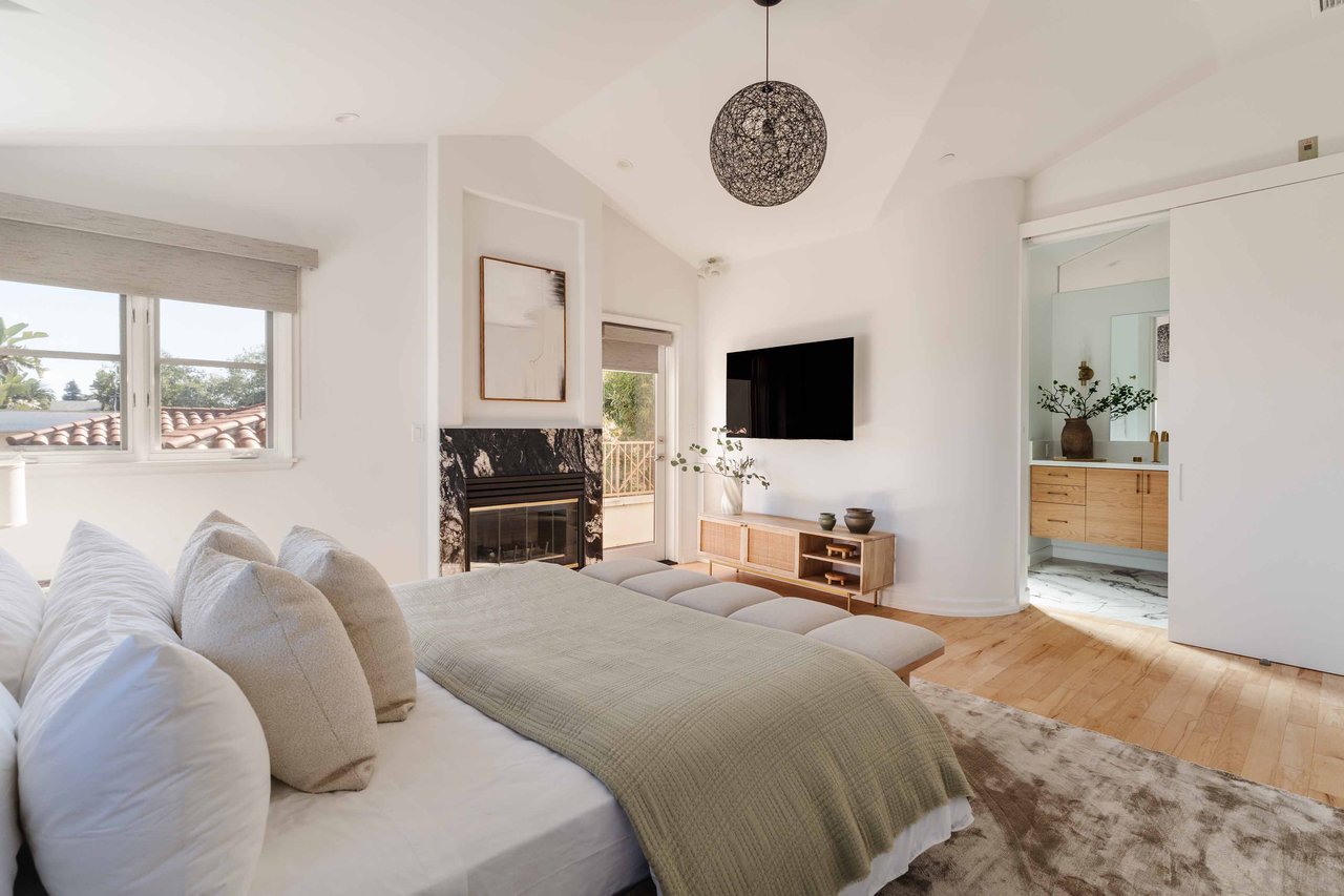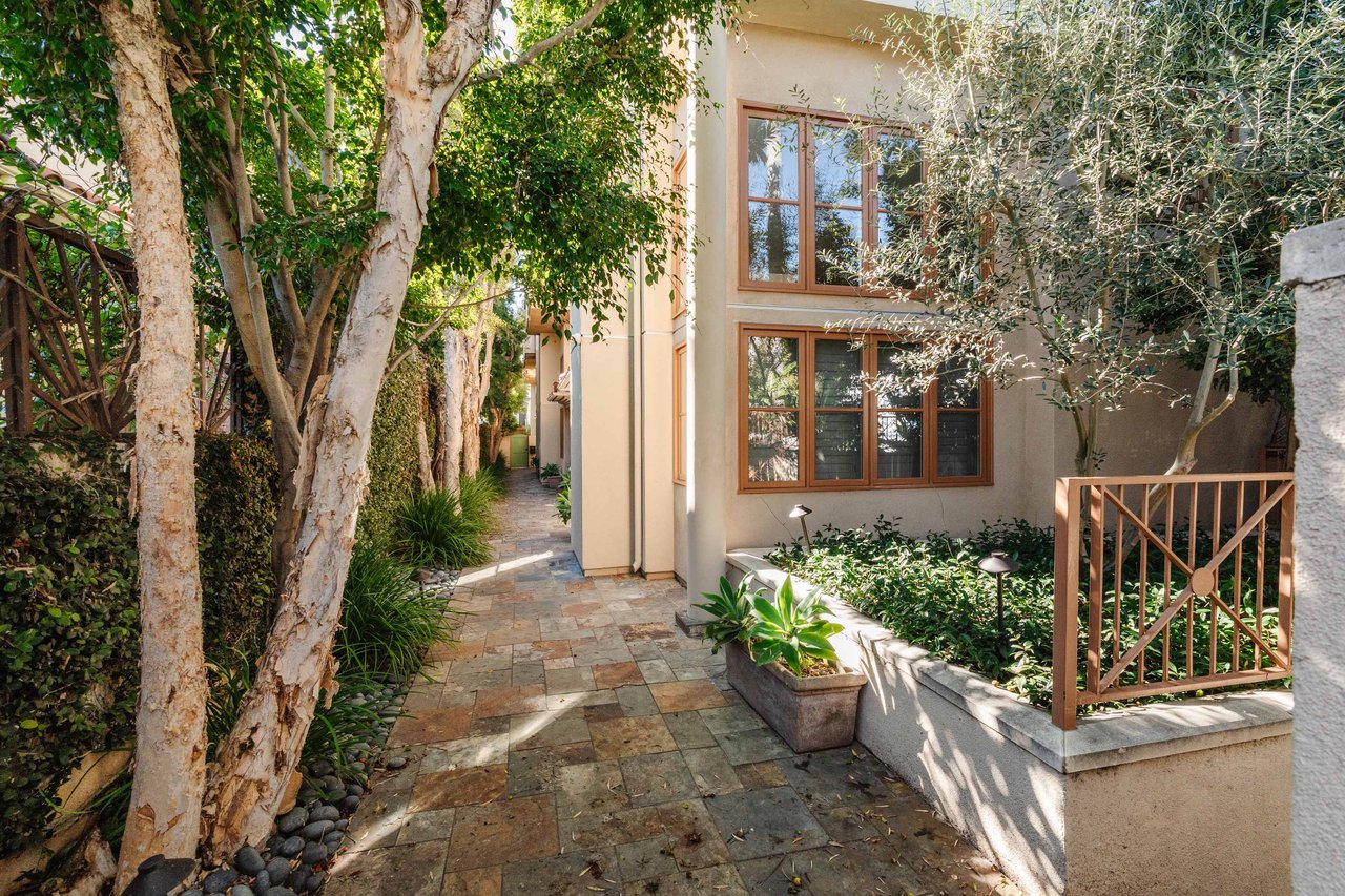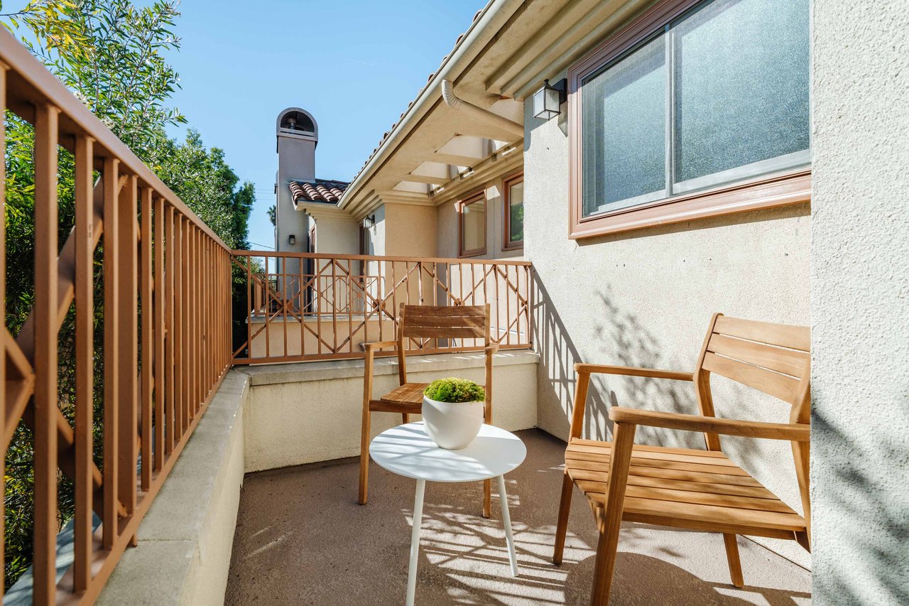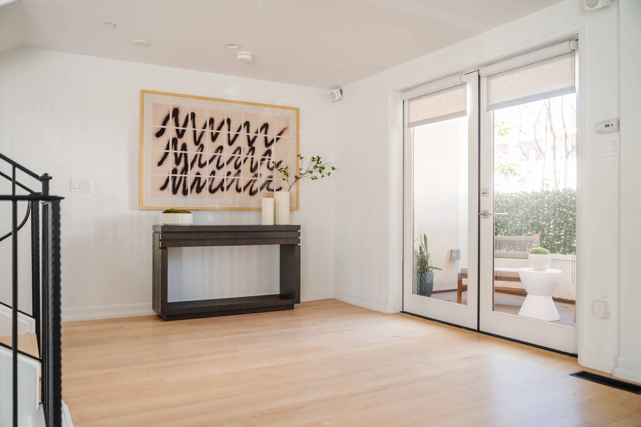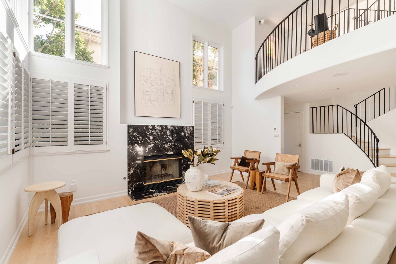 Just off Montana Avenue, this front-facing residence is the premier townhome within a gated four-unit Spanish enclave. Extensively renovated by the current owners, the 2,251-SF layout has been thoughtfully elevated with curated materials, bespoke craftsmanship, and a sophisticated modern aesthetic. Double-height ceilings, hardwood floors, clerestory windows, and gallery-style walls create an airy, sunlit great room and entry with a dramatic black stone fireplace grounding the space. The designer kitchen features custom sage cabinetry, slab stone backsplashes, Wolf and Sub-Zero appliances, and a farmhouse sink with picture window looking out to the exterior. Just beyond, an oversized private patio with a fire pit and mature landscaping offers multiple outdoor living and dining area options - perfect for entertaining or relaxation. Upstairs, a spacious lofted office with a built-in nook and covered patio overlooks the main level and provides flexible utility as a studio, gym, or additional lounge. The serene primary suite features vaulted ceilings, a fireplace, balcony, walk-in closet, and a spa-like bath with dual vanities and an oversized shower. A generous secondary bedroom suite includes its own balcony, walk-in closet, and renovated bath. Additional highlights include a renovated powder room, dedicated laundry room, state-of-the-art air and water filtration systems, and a private two-car garage with storage inside the gated subterranean parking. Originally built for the developer’s personal use and situated just feet from Montana Avenue’s boutiques and cafés, this rare offering blends privacy, design, and turnkey luxury in one of Santa Monica’s most sought-after locations.