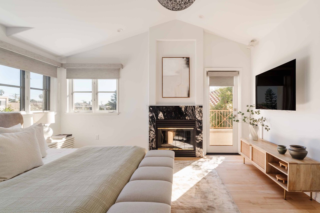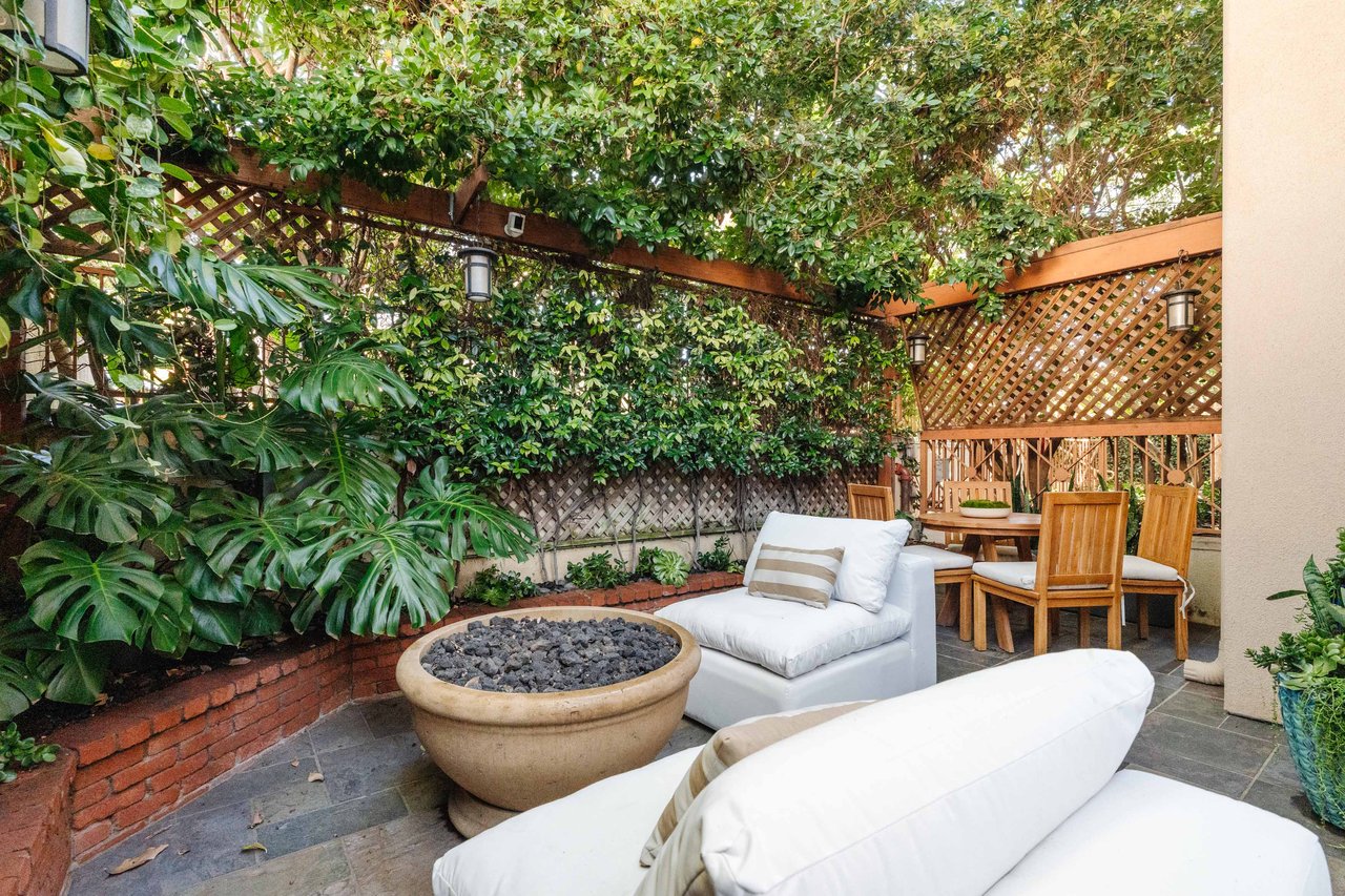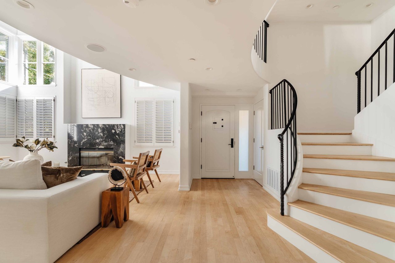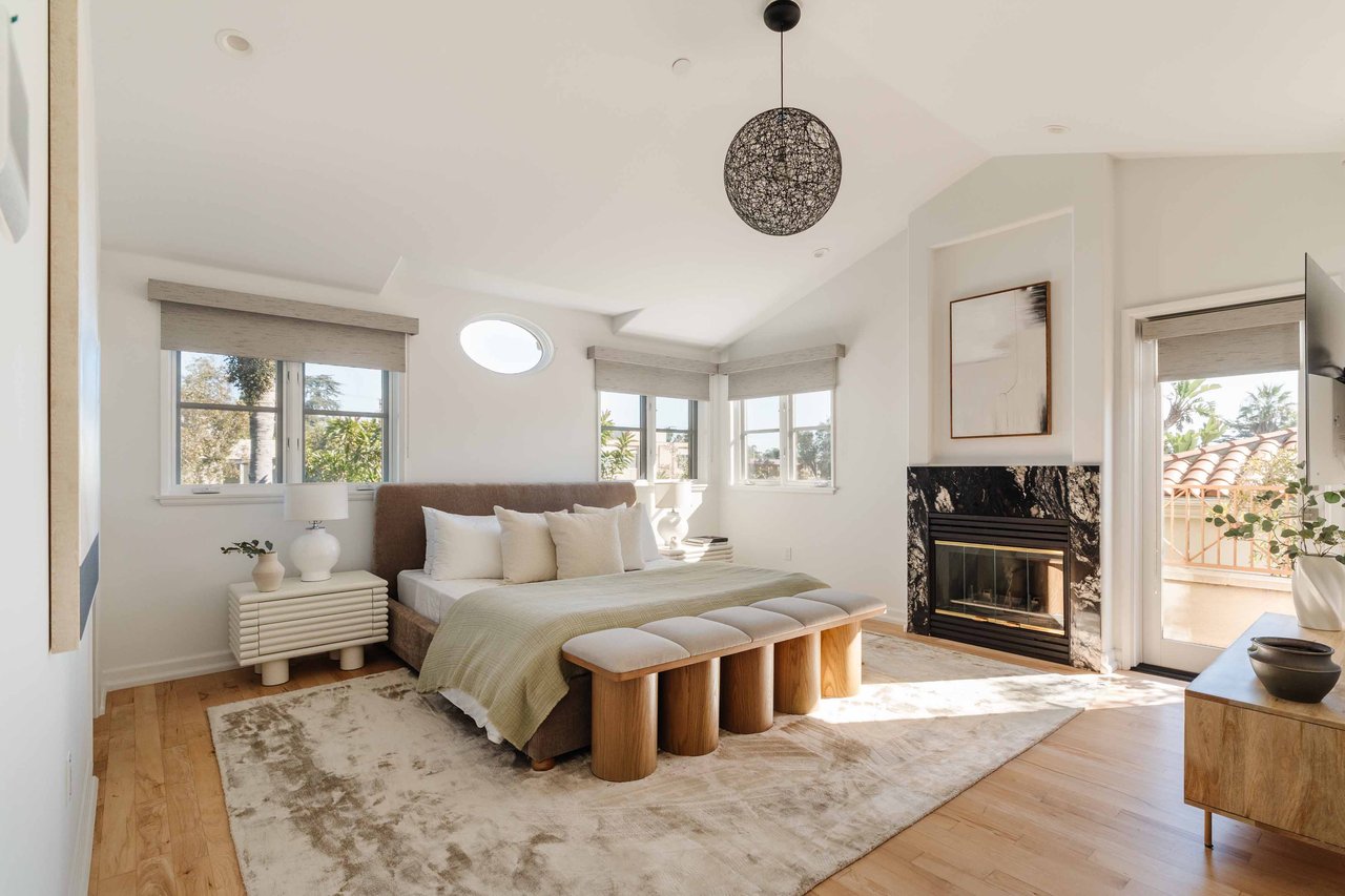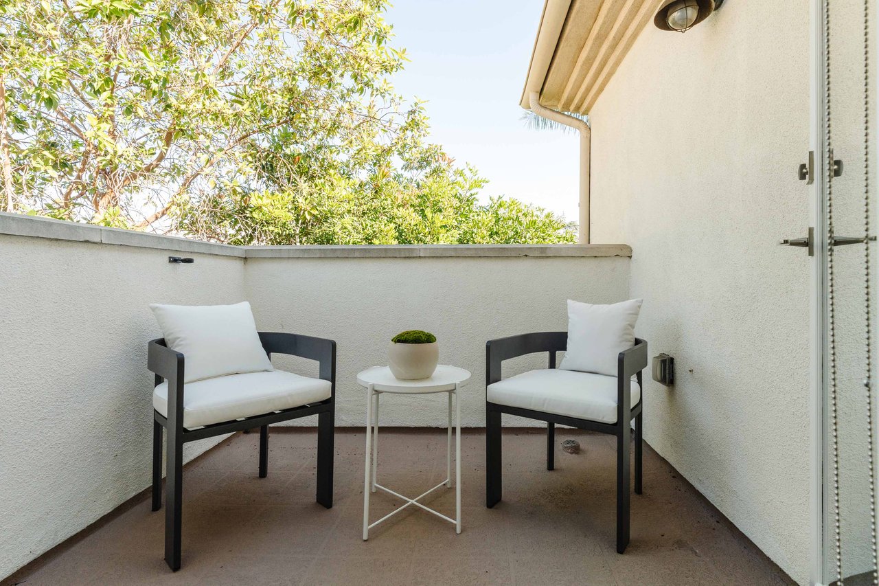 Just off Montana Avenue, this front-facing residence is the premier townhome within a gated four-unit Spanish enclave. Extensively renovated by the current owners, the 2,251-SF layout has been thoughtfully elevated with curated materials, bespoke craftsmanship, and a sophisticated modern aesthetic. Double-height ceilings, hardwood floors, clerestory windows, and gallery-style walls create an airy, sunlit great room and entry with a dramatic black stone fireplace grounding the space. The designer kitchen features custom sage cabinetry, slab stone backsplashes, Wolf and Sub-Zero appliances, and a farmhouse sink with picture window looking out to the exterior. Just beyond, an oversized private patio with a fire pit and mature landscaping offers multiple outdoor living and dining area options - perfect for entertaining or relaxation. Upstairs, a spacious lofted office with a built-in nook and covered patio overlooks the main level and provides flexible utility as a studio, gym, or additional lounge. The serene primary suite features vaulted ceilings, a fireplace, balcony, walk-in closet, and a spa-like bath with dual vanities and an oversized shower. A generous secondary bedroom suite includes its own balcony, walk-in closet, and renovated bath. Additional highlights include a renovated powder room, dedicated laundry room, state-of-the-art air and water filtration systems, and a private two-car garage with storage inside the gated subterranean parking. Originally built for the developer’s personal use and situated just feet from Montana Avenue’s boutiques and cafés, this rare offering blends privacy, design, and turnkey luxury in one of Santa Monica’s most sought-after locations.