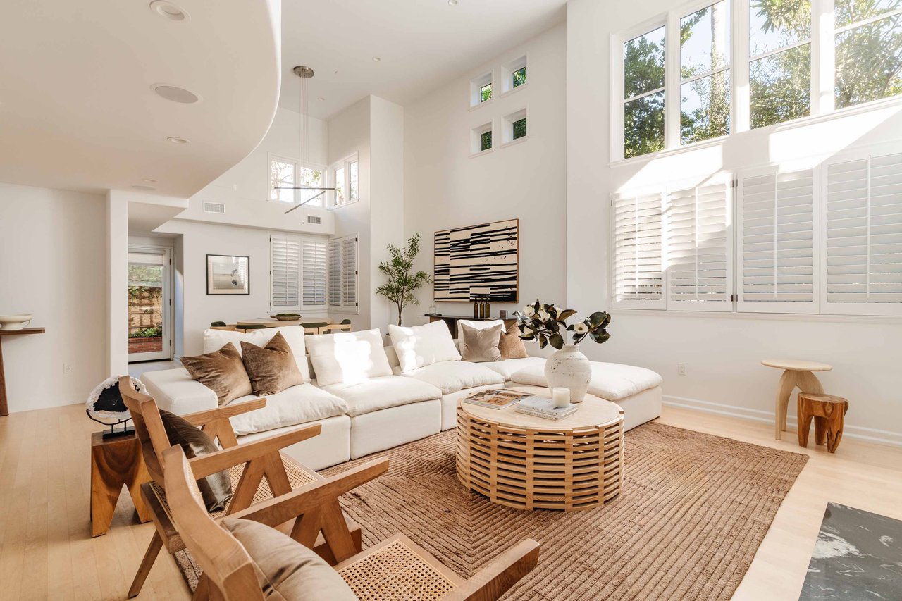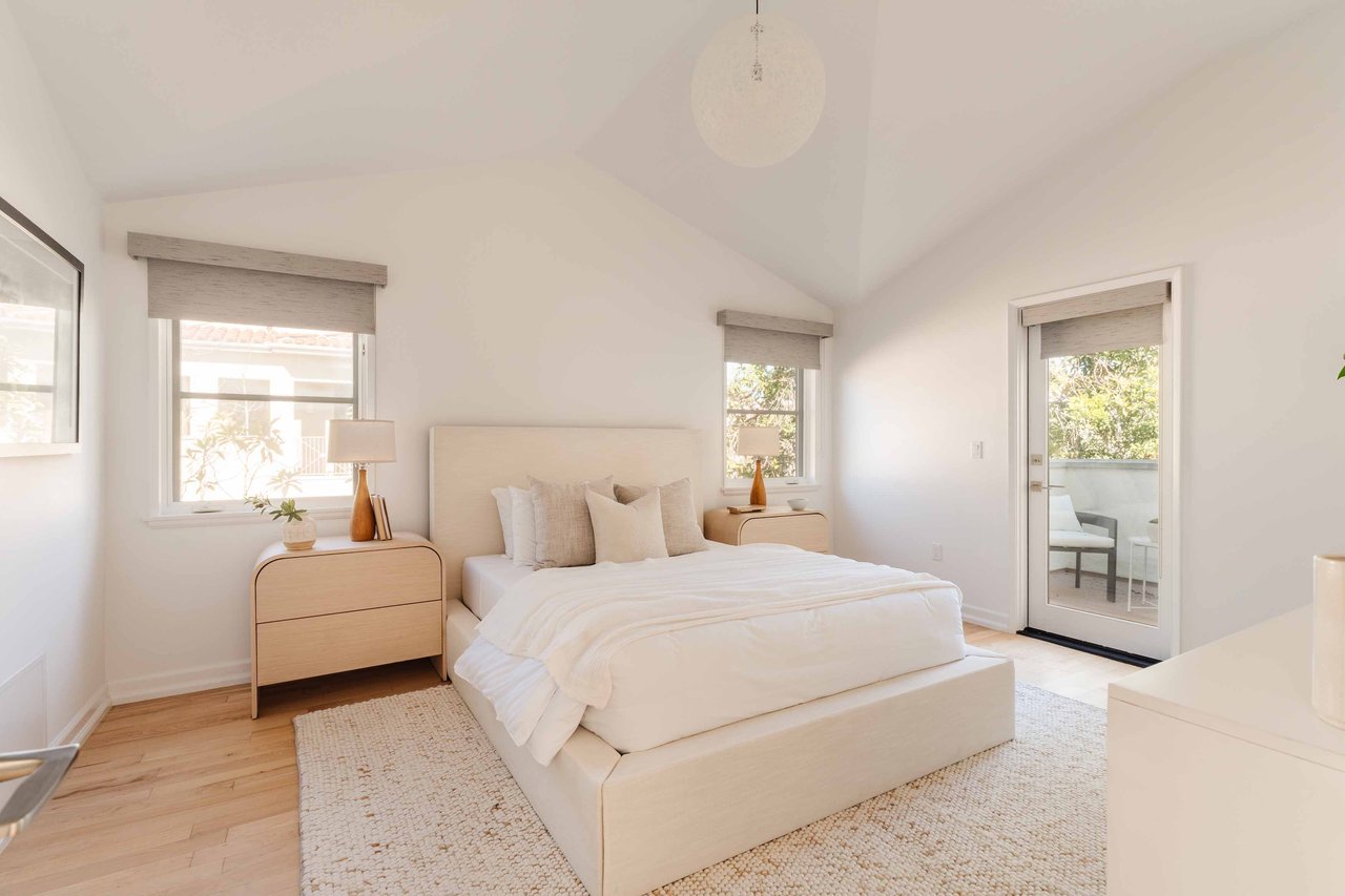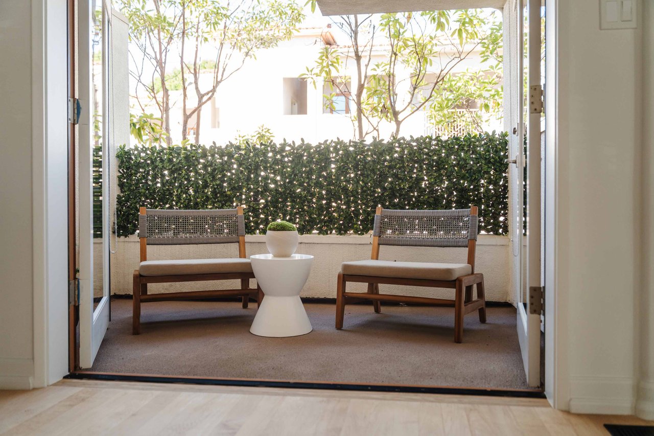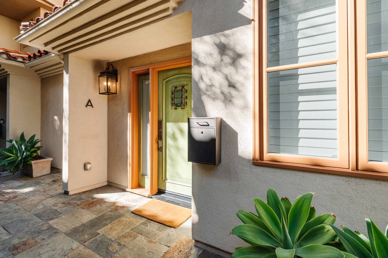 Just off Montana Avenue, this front-facing residence is the premier townhome within a gated four-unit Spanish enclave. Extensively renovated by the current owners, the 2,251-SF layout has been thoughtfully elevated with curated materials, bespoke craftsmanship, and a sophisticated modern aesthetic. Double-height ceilings, hardwood floors, clerestory windows, and gallery-style walls create an airy, sunlit great room and entry with a dramatic black stone fireplace grounding the space. The designer kitchen features custom sage cabinetry, slab stone backsplashes, Wolf and Sub-Zero appliances, and a farmhouse sink with picture window looking out to the exterior. Just beyond, an oversized private patio with a fire pit and mature landscaping offers multiple outdoor living and dining area options - perfect for entertaining or relaxation. Upstairs, a spacious lofted office with a built-in nook and covered patio overlooks the main level and provides flexible utility as a studio, gym, or additional lounge. The serene primary suite features vaulted ceilings, a fireplace, balcony, walk-in closet, and a spa-like bath with dual vanities and an oversized shower. A generous secondary bedroom suite includes its own balcony, walk-in closet, and renovated bath. Additional highlights include a renovated powder room, dedicated laundry room, state-of-the-art air and water filtration systems, and a private two-car garage with storage inside the gated subterranean parking. Originally built for the developer’s personal use and situated just feet from Montana Avenue’s boutiques and cafés, this rare offering blends privacy, design, and turnkey luxury in one of Santa Monica’s most sought-after locations.