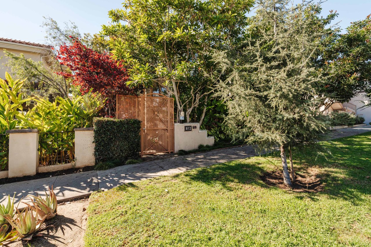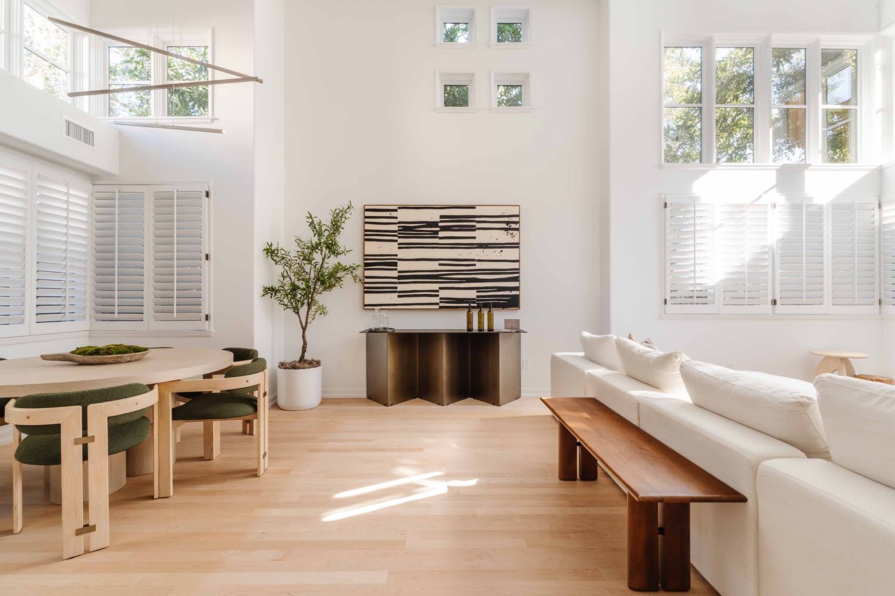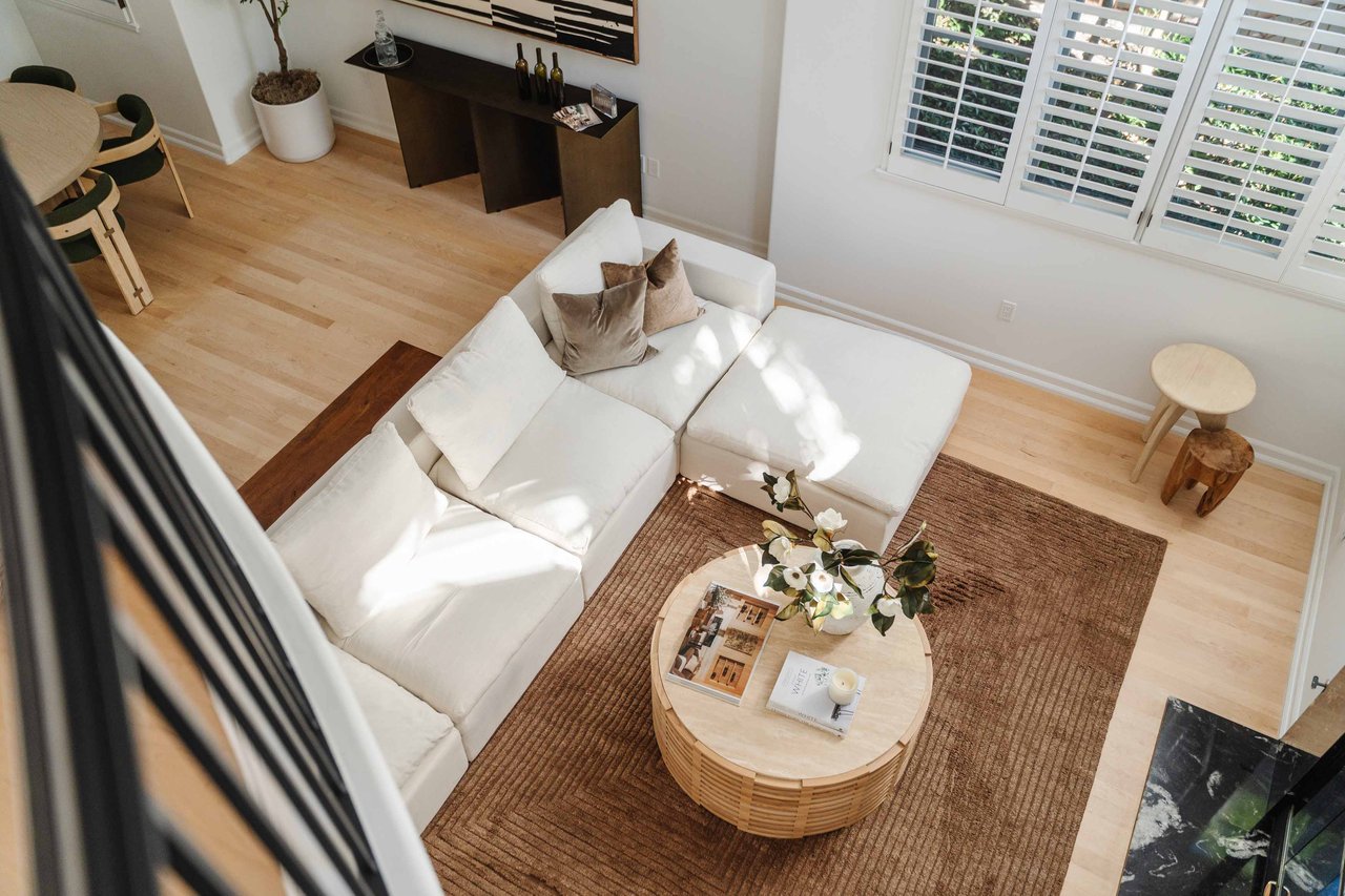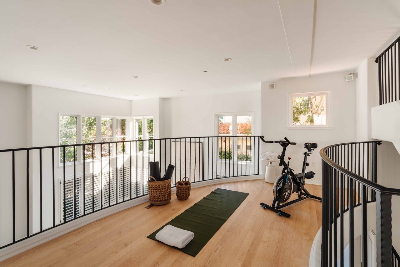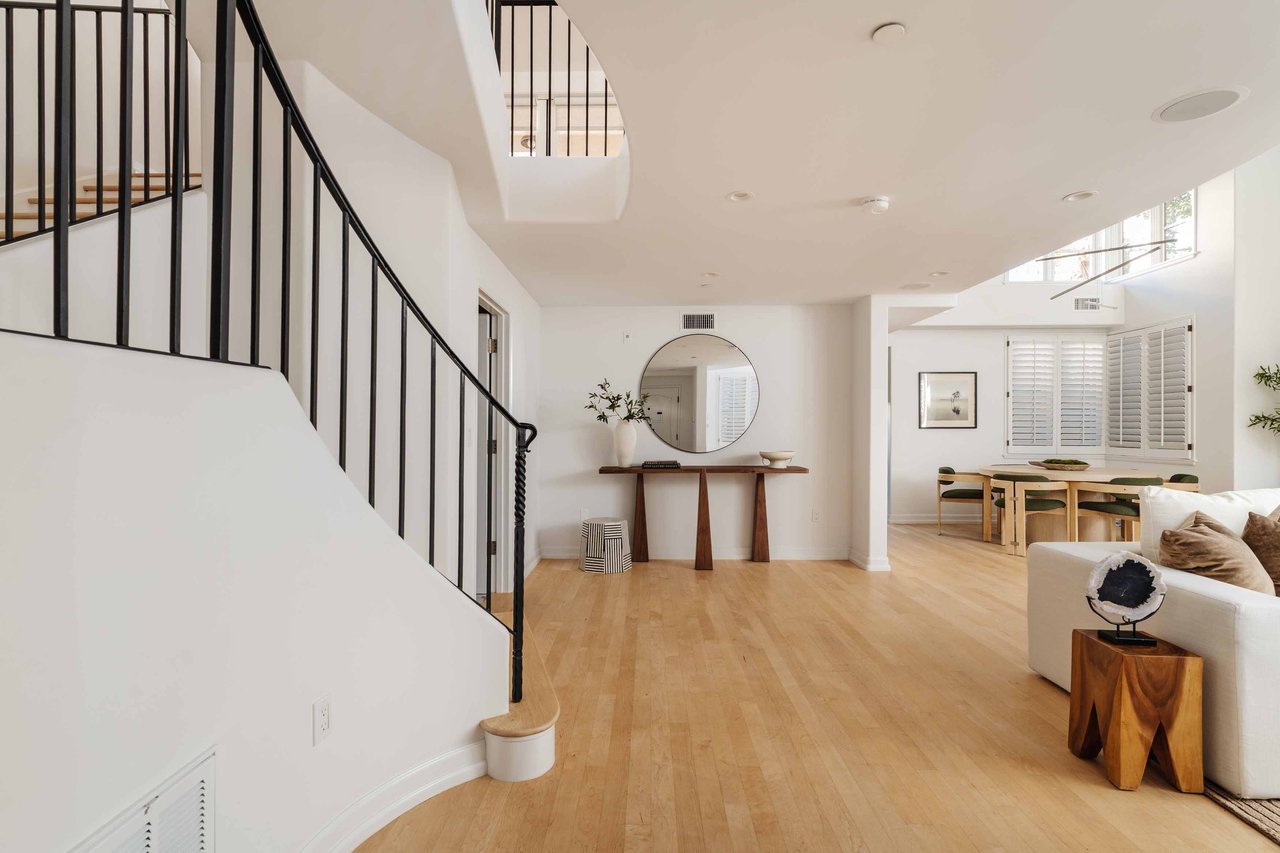Just off Montana Avenue, this front-facing residence is the premier townhome within a gated four-unit Spanish enclave. Extensively renovated by the current owners, the 2,251-SF layout has been thoughtfully elevated with curated materials, bespoke craftsmanship, and a sophisticated modern aesthetic. Double-height ceilings, hardwood floors, clerestory windows, and gallery-style walls create an airy, sunlit great room and entry with a dramatic black stone fireplace grounding the space. The designer kitchen features custom sage cabinetry, slab stone backsplashes, Wolf and Sub-Zero appliances, and a farmhouse sink with picture window looking out to the exterior. Just beyond, an oversized private patio with a fire pit and mature landscaping offers multiple outdoor living and dining area options - perfect for entertaining or relaxation. Upstairs, a spacious lofted office with a built-in nook and covered patio overlooks the main level and provides flexible utility as a studio, gym, or additional lounge. The serene primary suite features vaulted ceilings, a fireplace, balcony, walk-in closet, and a spa-like bath with dual vanities and an oversized shower. A generous secondary bedroom suite includes its own balcony, walk-in closet, and renovated bath. Additional highlights include a renovated powder room, dedicated laundry room, state-of-the-art air and water filtration systems, and a private two-car garage with storage inside the gated subterranean parking. Originally built for the developer’s personal use and situated just feet from Montana Avenue’s boutiques and cafés, this rare offering blends privacy, design, and turnkey luxury in one of Santa Monica’s most sought-after locations.