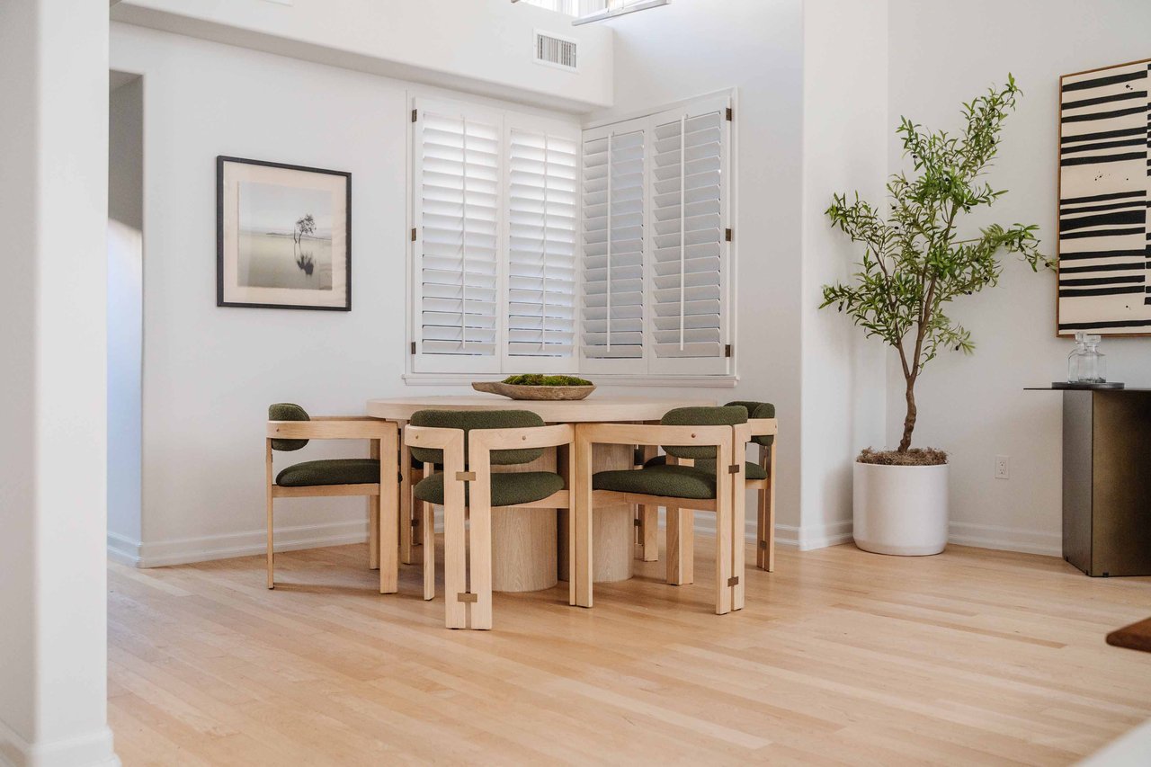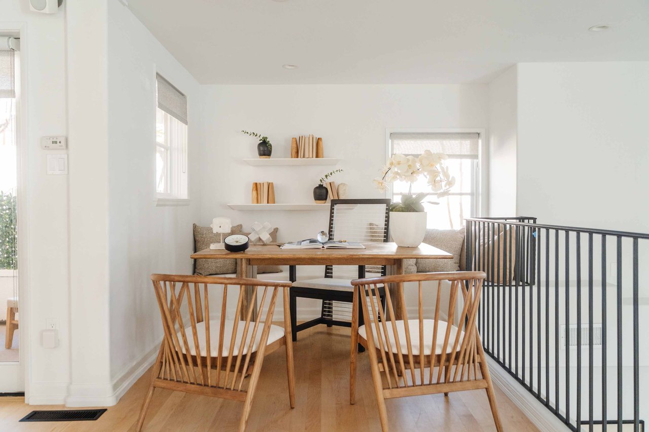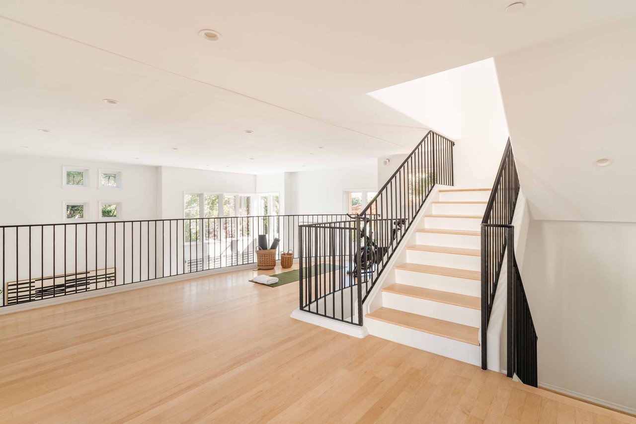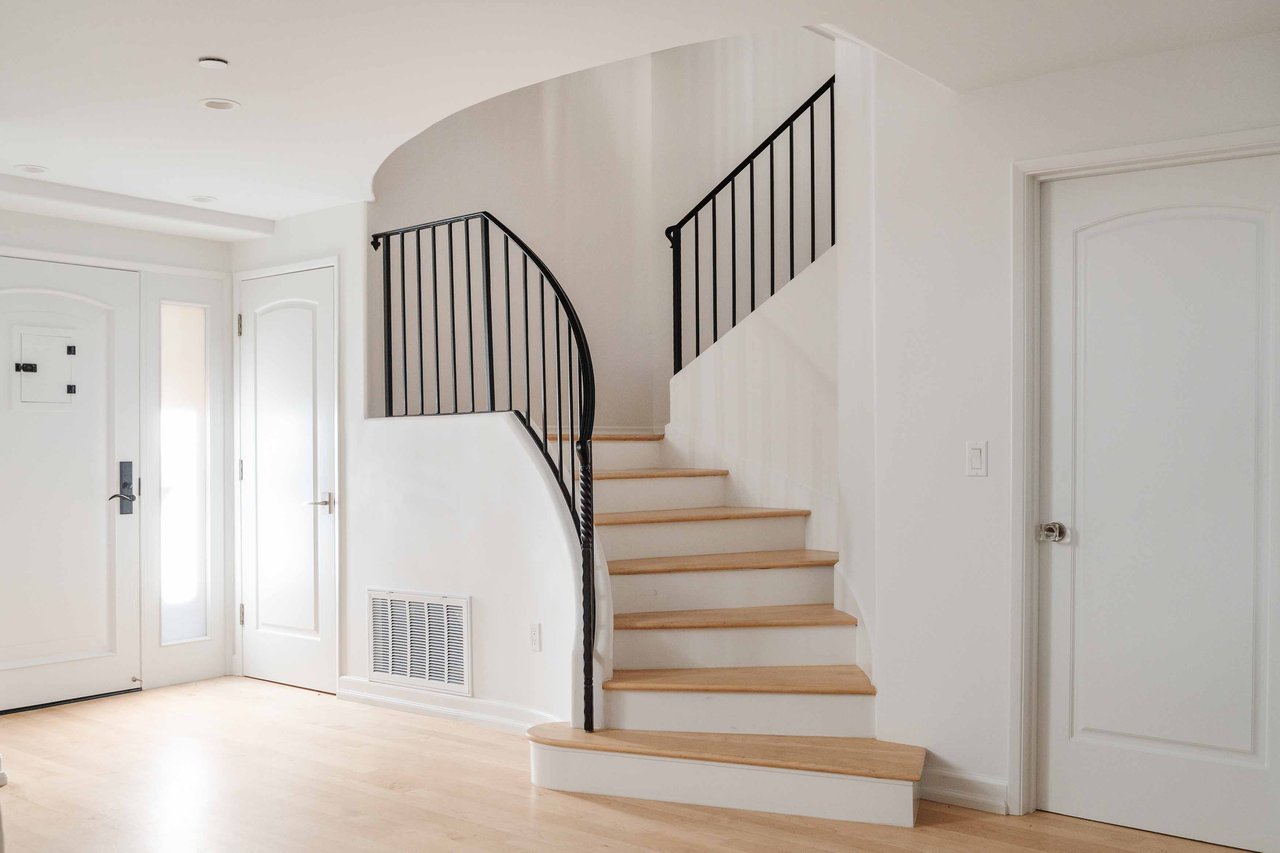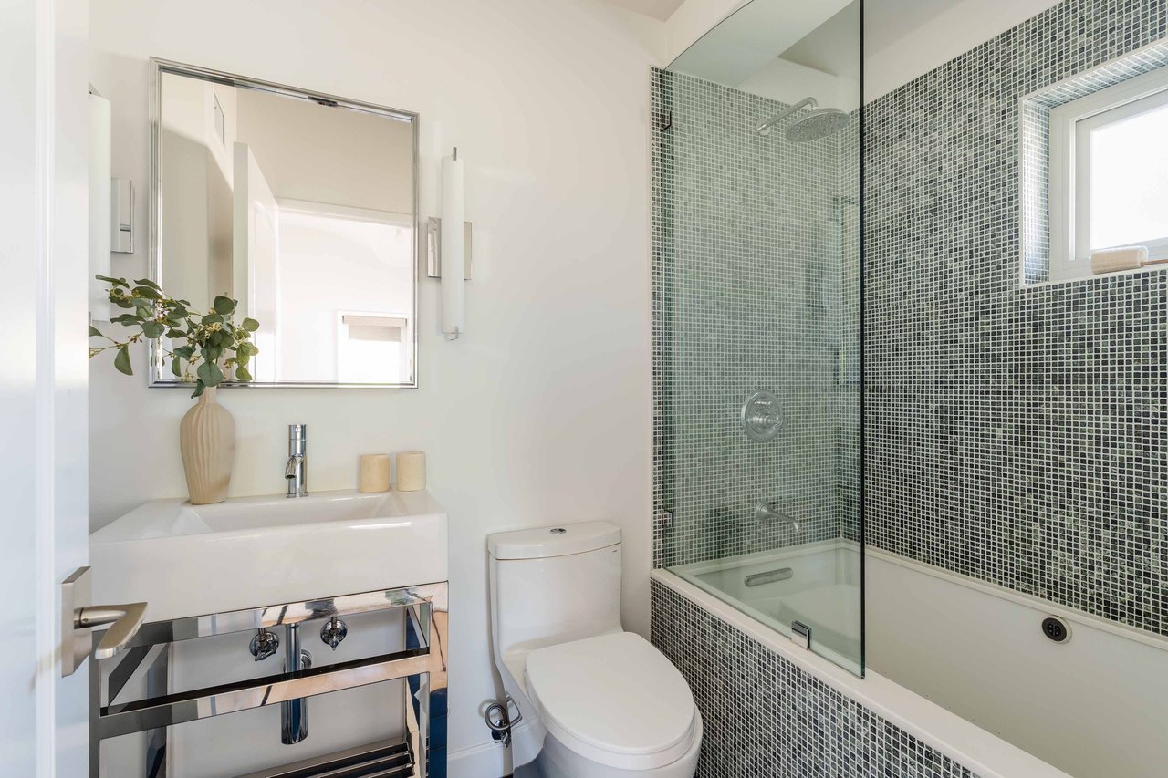 Just off Montana Avenue, this front-facing residence is the premier townhome within a gated four-unit Spanish enclave. Extensively renovated by the current owners, the 2,251-SF layout has been thoughtfully elevated with curated materials, bespoke craftsmanship, and a sophisticated modern aesthetic. Double-height ceilings, hardwood floors, clerestory windows, and gallery-style walls create an airy, sunlit great room and entry with a dramatic black stone fireplace grounding the space. The designer kitchen features custom sage cabinetry, slab stone backsplashes, Wolf and Sub-Zero appliances, and a farmhouse sink with picture window looking out to the exterior. Just beyond, an oversized private patio with a fire pit and mature landscaping offers multiple outdoor living and dining area options - perfect for entertaining or relaxation. Upstairs, a spacious lofted office with a built-in nook and covered patio overlooks the main level and provides flexible utility as a studio, gym, or additional lounge. The serene primary suite features vaulted ceilings, a fireplace, balcony, walk-in closet, and a spa-like bath with dual vanities and an oversized shower. A generous secondary bedroom suite includes its own balcony, walk-in closet, and renovated bath. Additional highlights include a renovated powder room, dedicated laundry room, state-of-the-art air and water filtration systems, and a private two-car garage with storage inside the gated subterranean parking. Originally built for the developer’s personal use and situated just feet from Montana Avenue’s boutiques and cafés, this rare offering blends privacy, design, and turnkey luxury in one of Santa Monica’s most sought-after locations.