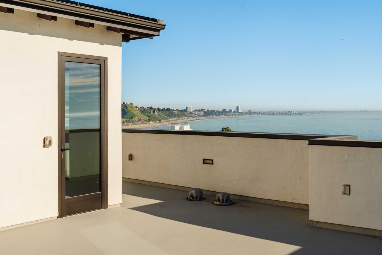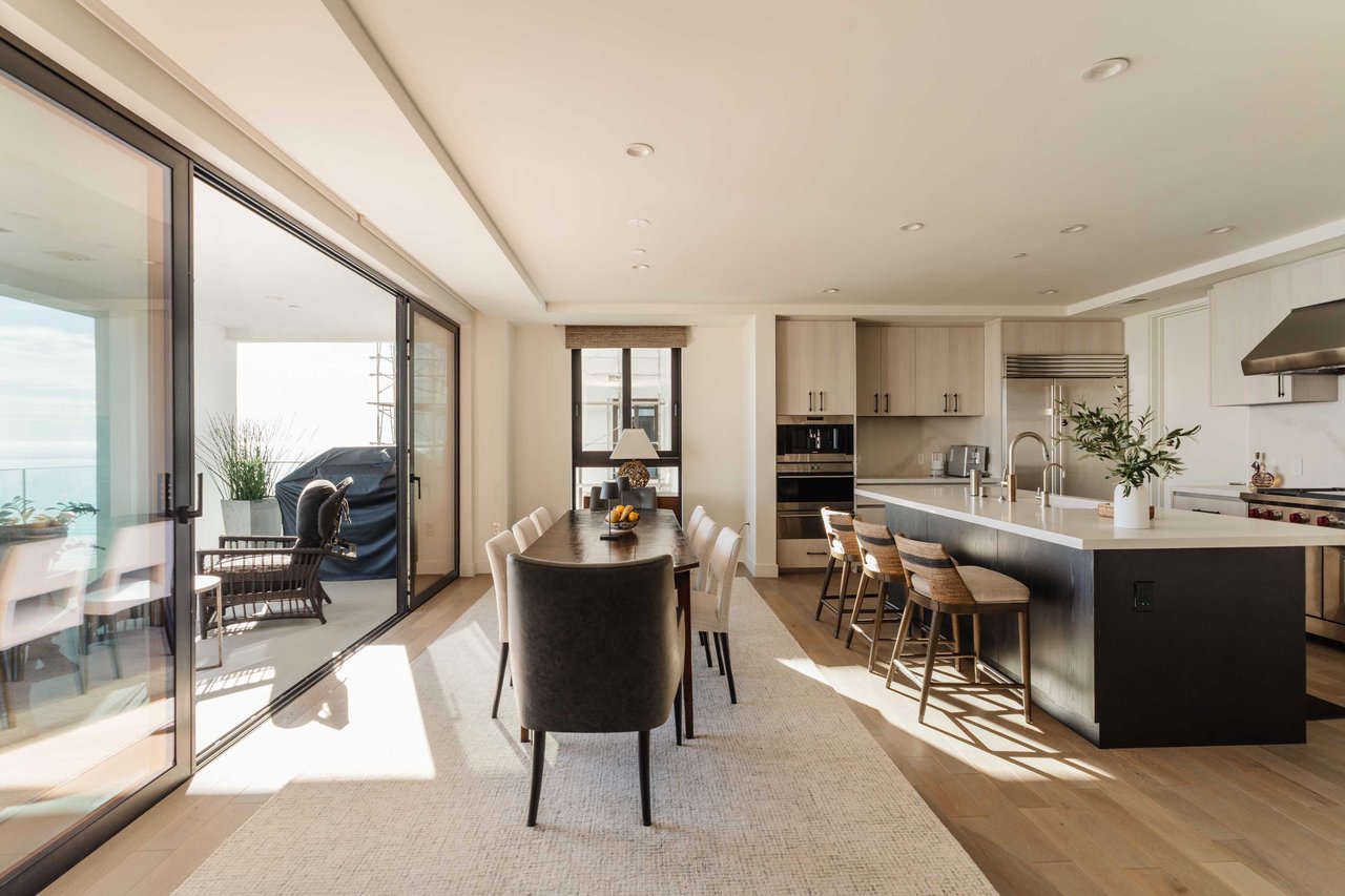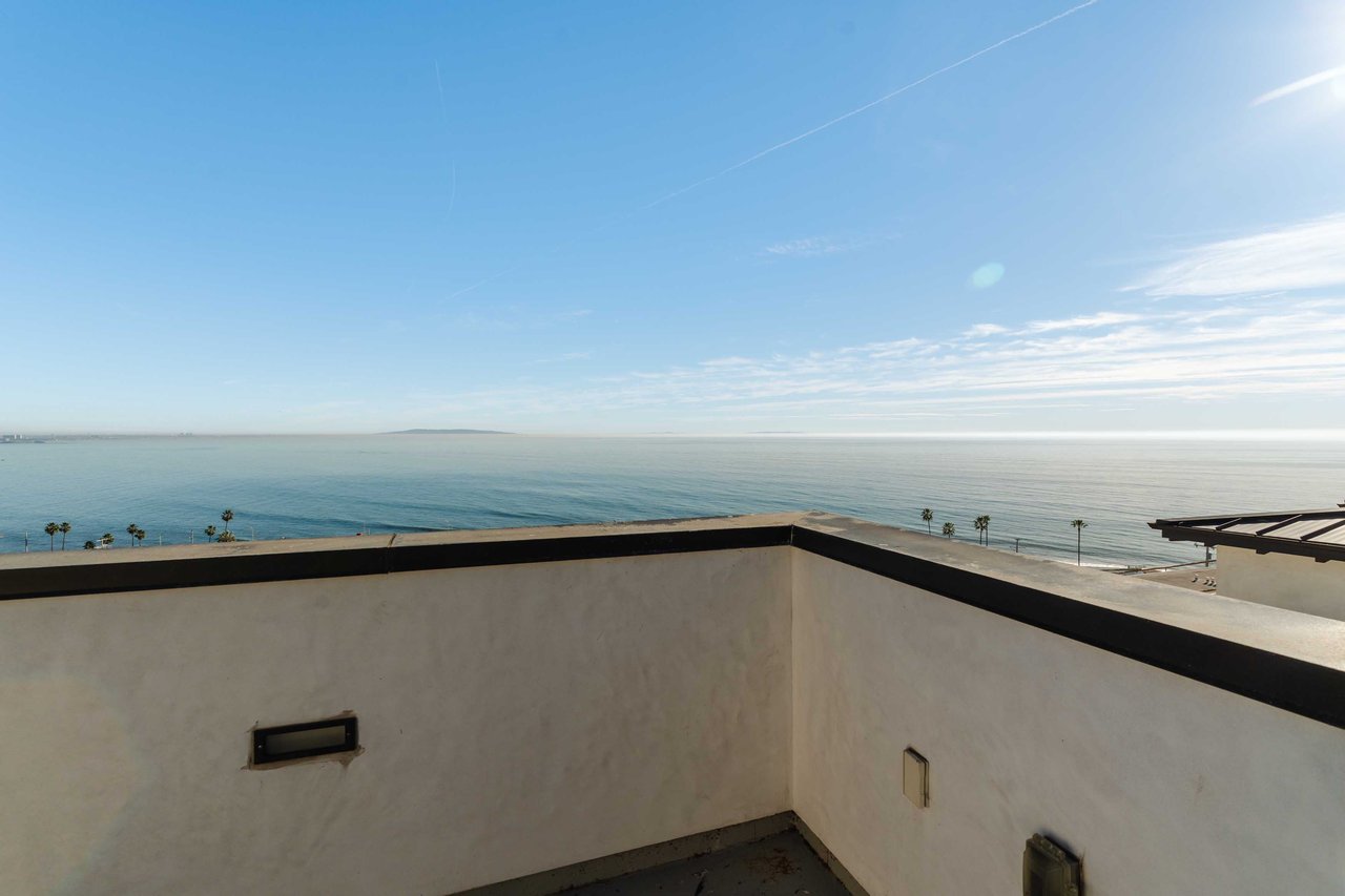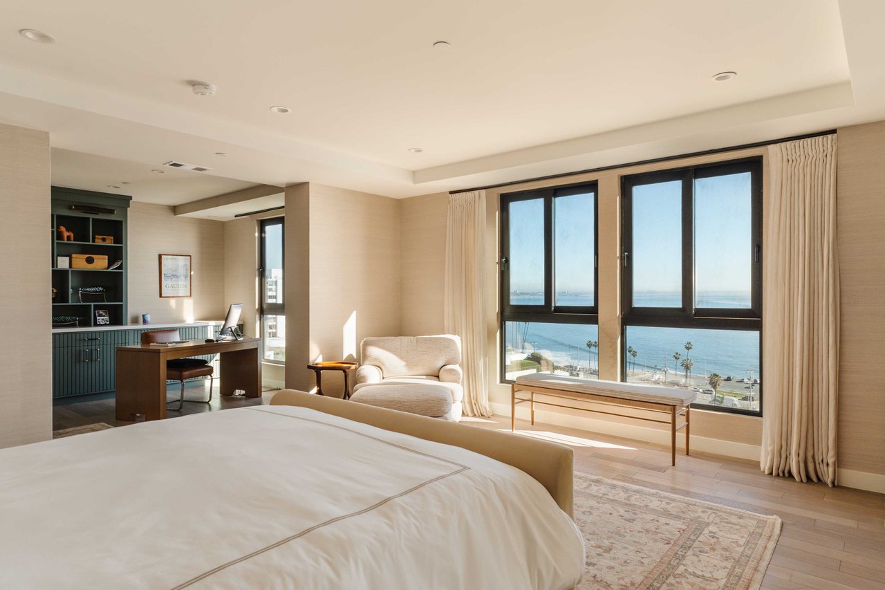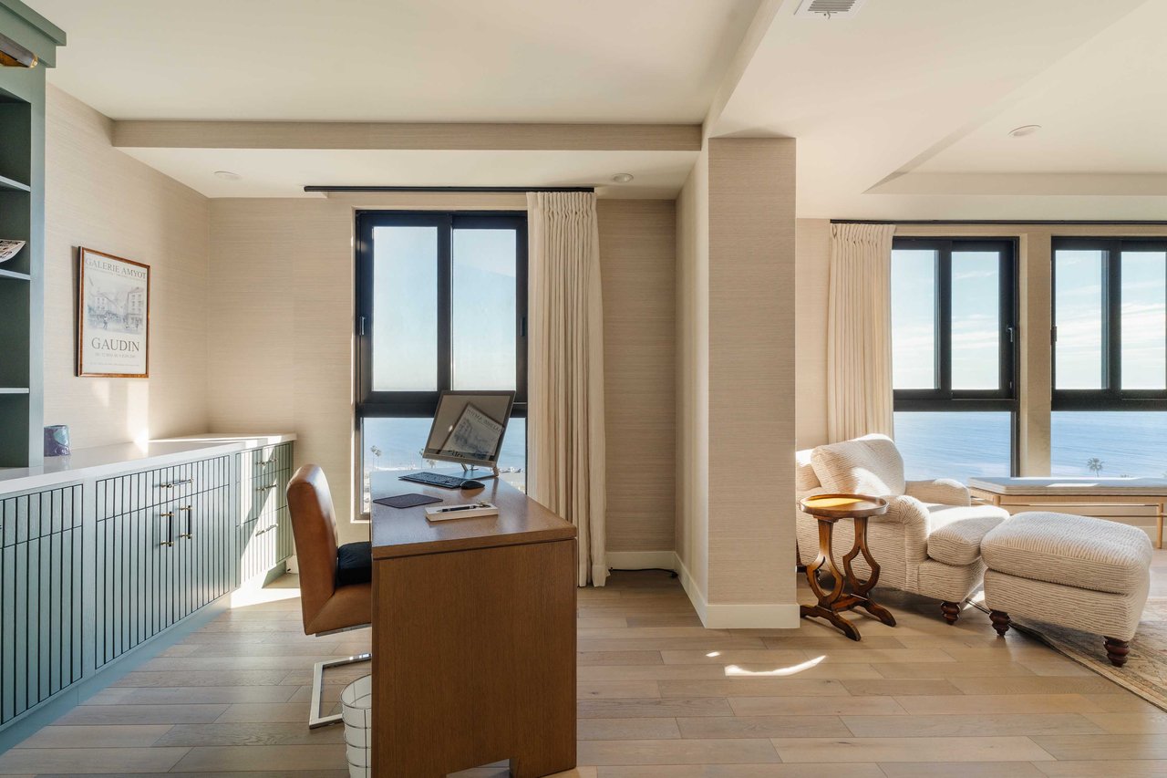 Perched on the bluffs above PCH and Sunset Boulevard, this designer-done residence offers some of the most commanding ocean and coastline views on the Westside. The entry opens into a seamless, light-filled main floor plan where the living and dining areas transition effortlessly into a bespoke chef’s kitchen. Further customized by the current owners, the kitchen features Wolf and Sub-Zero appliances, a center island, and upgraded cabinetry, countertops, and water filtration. The main level is framed by explosive views of the Queen’s Necklace and Catalina Island, best enjoyed from the private balcony. Upstairs, the primary retreat is a masterclass in luxury, featuring a private sitting/office area and a spa-like bath with a view-oriented soaking tub, oversized shower with bench, Waterworks fixtures, and triple vanities. A sumptuous walk-in closet by California Closets completes the suite. Two additional guest suites feature en-suite baths and custom closets. Refined interior details include hardwood flooring, grasscloth wallcoverings, custom window treatments, and a bar with wine storage. Exclusive to only a select few residences at OneCoast, the home includes an expansive private rooftop deck and an attached two-car garage with built-in storage. Residents enjoy 24-hour, guard-gated security, a location just a block from the beach, and a 5-minute drive to Palisades Village, Malibu, and Santa Monica.