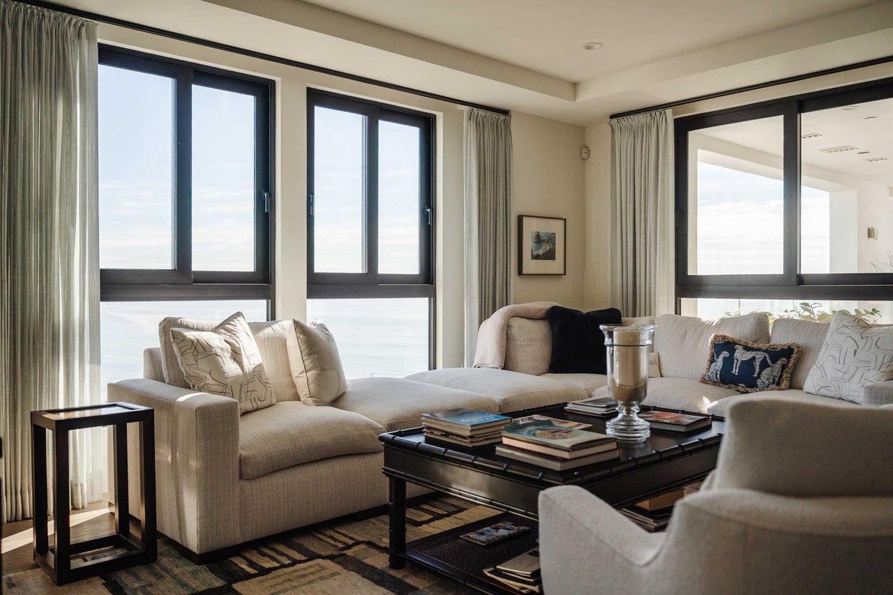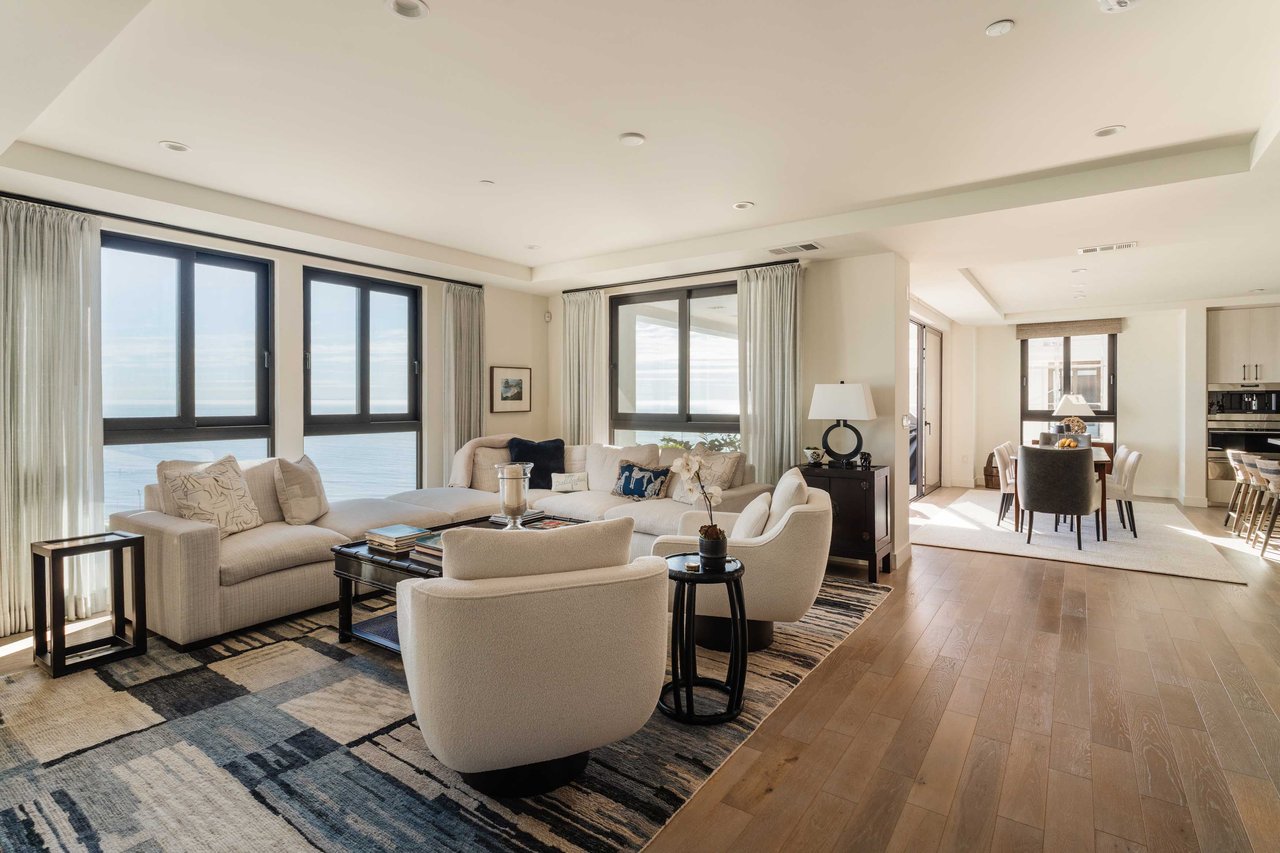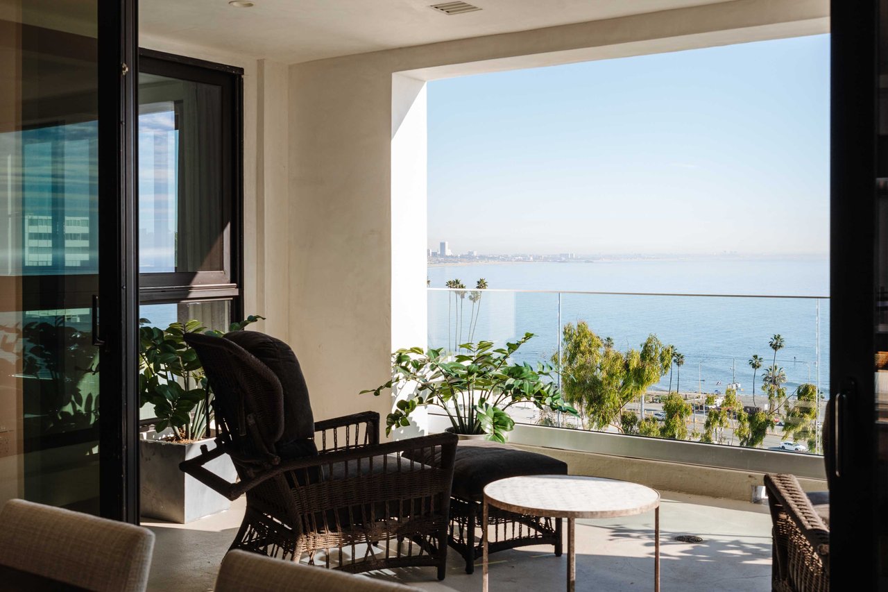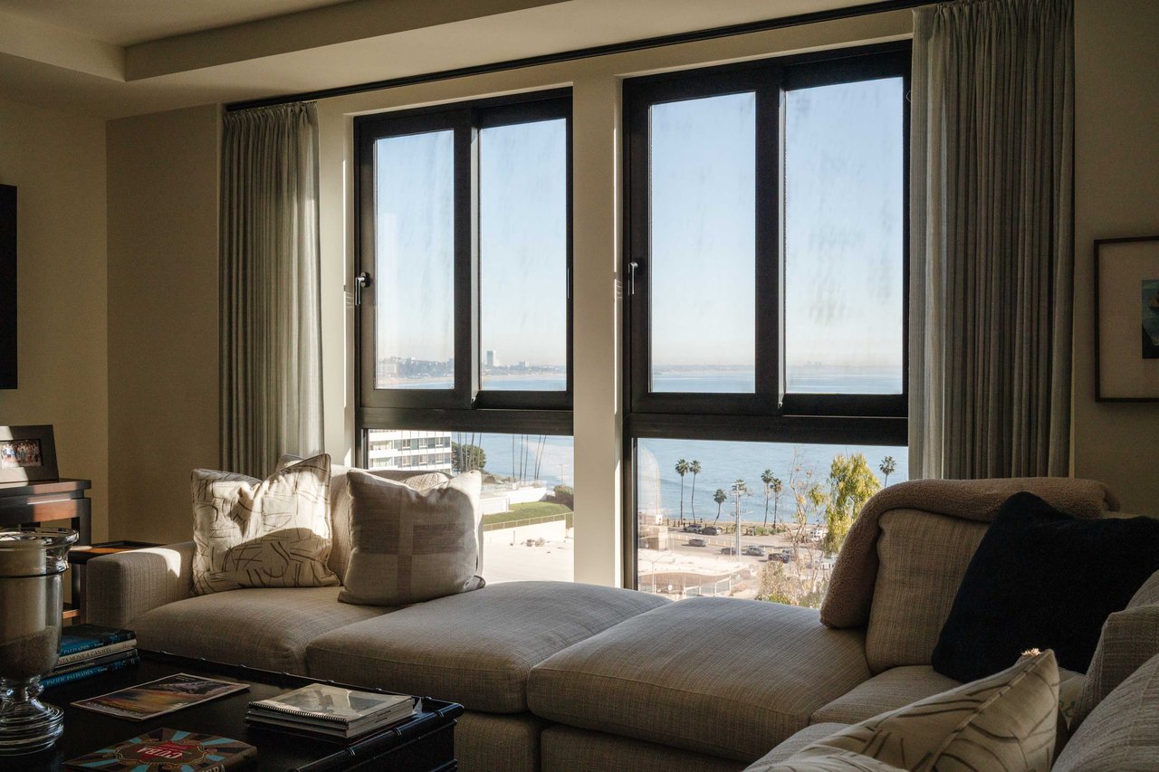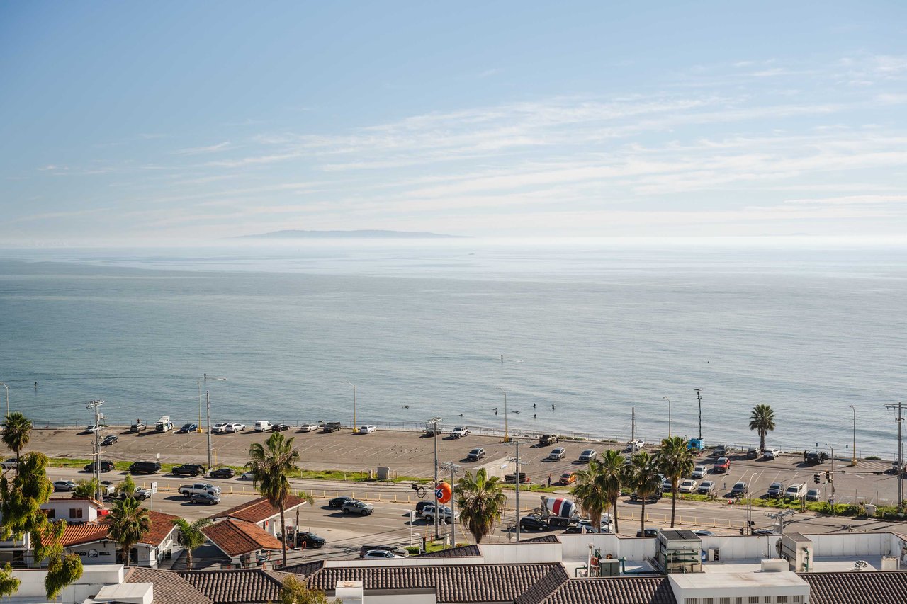 Perched on the bluffs above PCH and Sunset Boulevard, this designer-done residence offers some of the most commanding ocean and coastline views on the Westside. The entry opens into a seamless, light-filled main floor plan where the living and dining areas transition effortlessly into a bespoke chef’s kitchen. Further customized by the current owners, the kitchen features Wolf and Sub-Zero appliances, a center island, and upgraded cabinetry, countertops, and water filtration. The main level is framed by explosive views of the Queen’s Necklace and Catalina Island, best enjoyed from the private balcony. Upstairs, the primary retreat is a masterclass in luxury, featuring a private sitting/office area and a spa-like bath with a view-oriented soaking tub, oversized shower with bench, Waterworks fixtures, and triple vanities. A sumptuous walk-in closet by California Closets completes the suite. Two additional guest suites feature en-suite baths and custom closets. Refined interior details include hardwood flooring, grasscloth wallcoverings, custom window treatments, and a bar with wine storage. Exclusive to only a select few residences at OneCoast, the home includes an expansive private rooftop deck and an attached two-car garage with built-in storage. Residents enjoy 24-hour, guard-gated security, a location just a block from the beach, and a 5-minute drive to Palisades Village, Malibu, and Santa Monica.