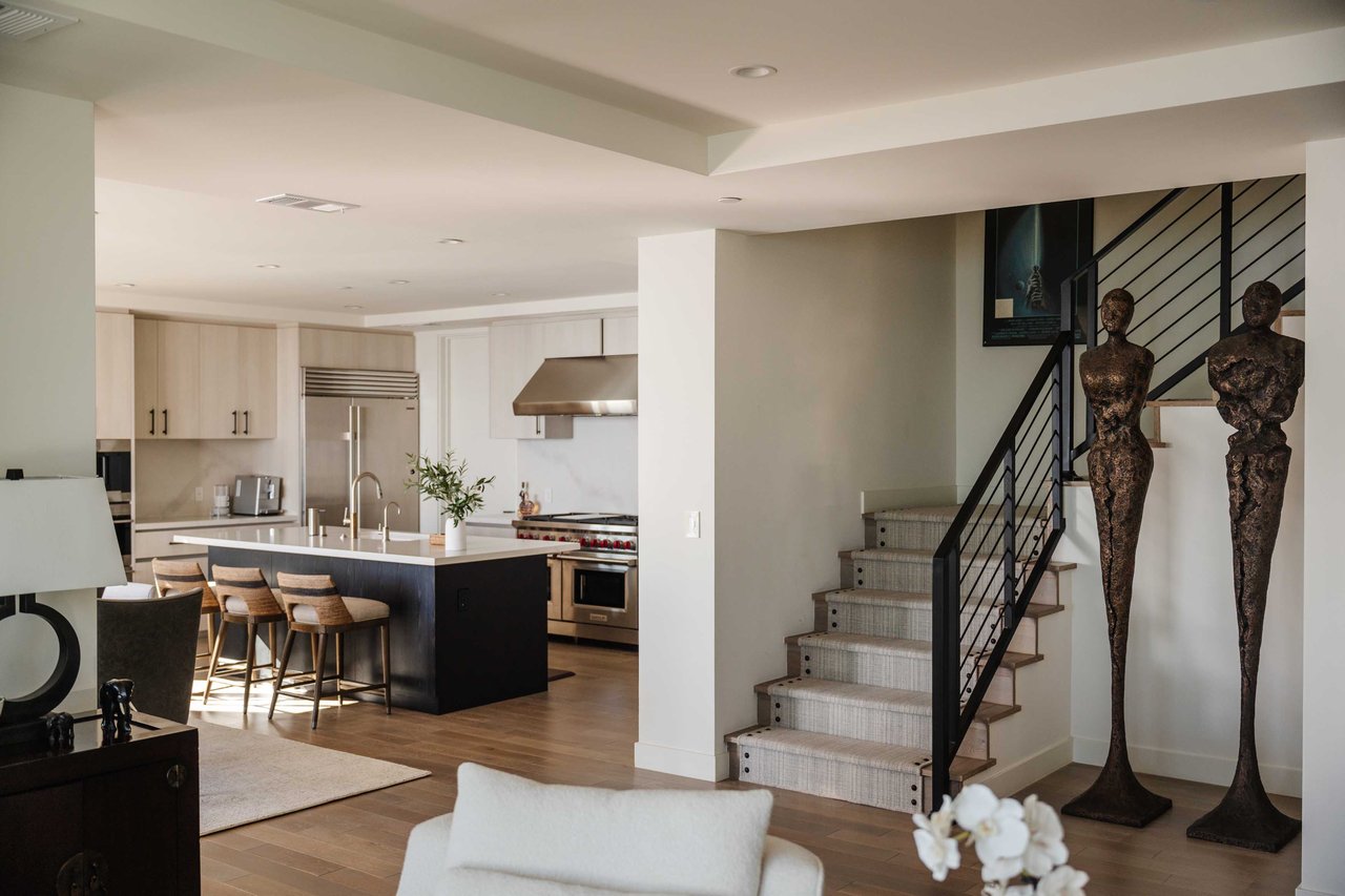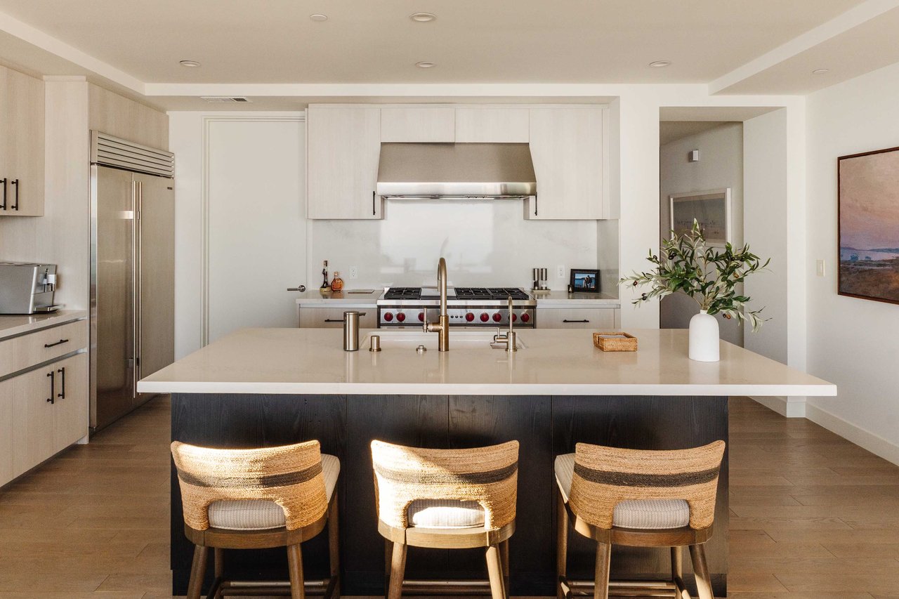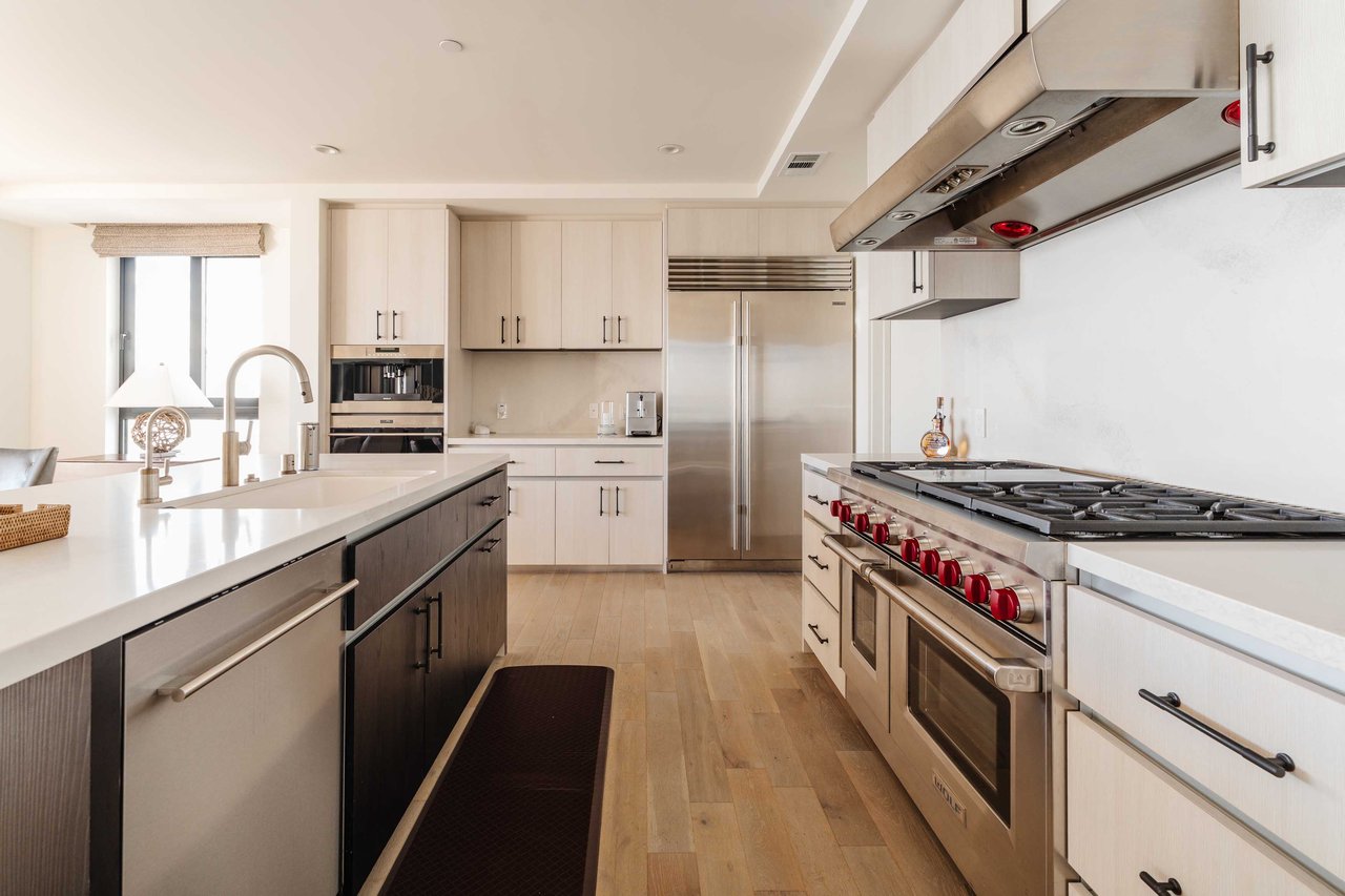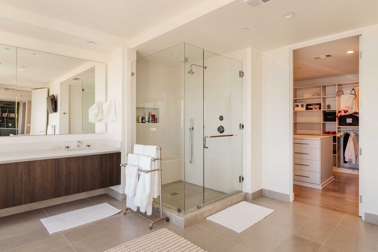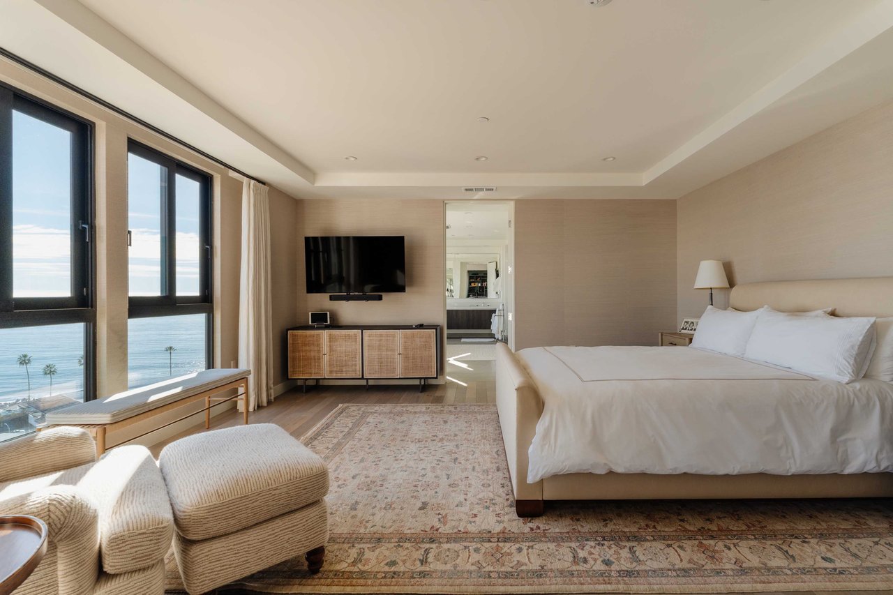 Perched on the bluffs above PCH and Sunset Boulevard, this designer-done residence offers some of the most commanding ocean and coastline views on the Westside. The entry opens into a seamless, light-filled main floor plan where the living and dining areas transition effortlessly into a bespoke chef’s kitchen. Further customized by the current owners, the kitchen features Wolf and Sub-Zero appliances, a center island, and upgraded cabinetry, countertops, and water filtration. The main level is framed by explosive views of the Queen’s Necklace and Catalina Island, best enjoyed from the private balcony. Upstairs, the primary retreat is a masterclass in luxury, featuring a private sitting/office area and a spa-like bath with a view-oriented soaking tub, oversized shower with bench, Waterworks fixtures, and triple vanities. A sumptuous walk-in closet by California Closets completes the suite. Two additional guest suites feature en-suite baths and custom closets. Refined interior details include hardwood flooring, grasscloth wallcoverings, custom window treatments, and a bar with wine storage. Exclusive to only a select few residences at OneCoast, the home includes an expansive private rooftop deck and an attached two-car garage with built-in storage. Residents enjoy 24-hour, guard-gated security, a location just a block from the beach, and a 5-minute drive to Palisades Village, Malibu, and Santa Monica.