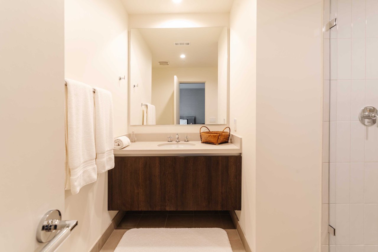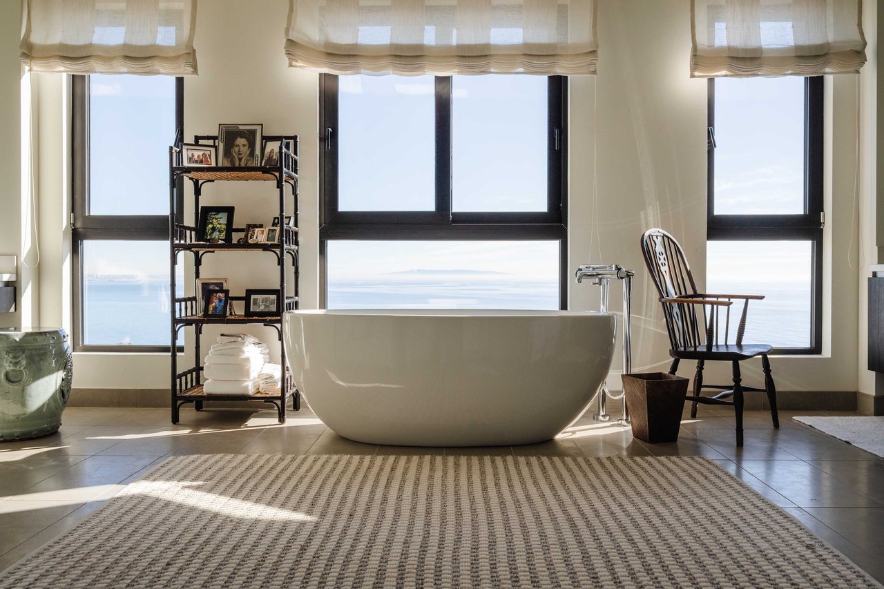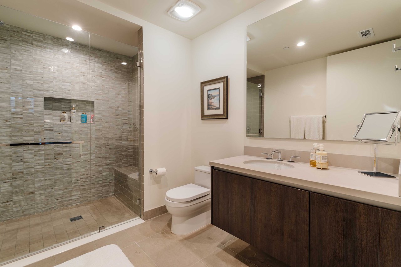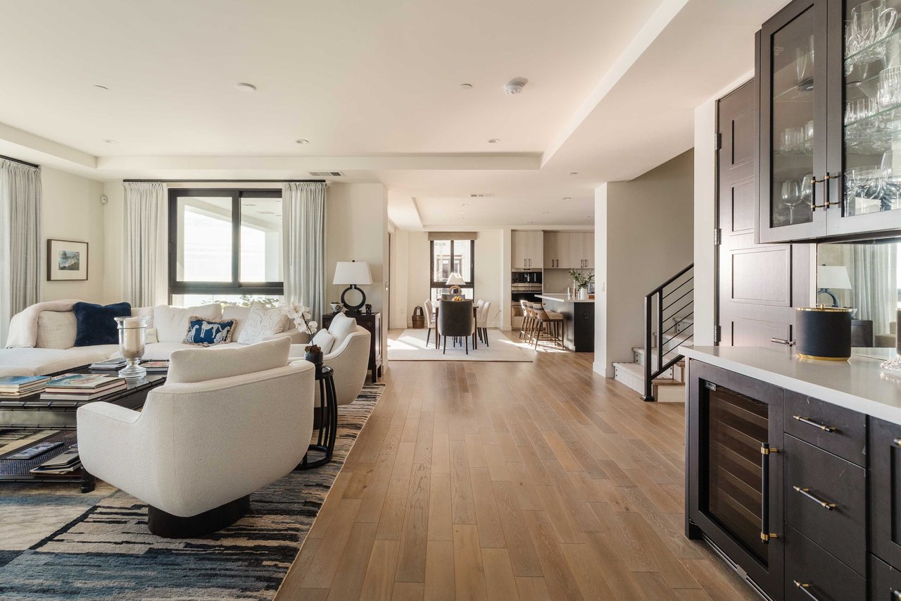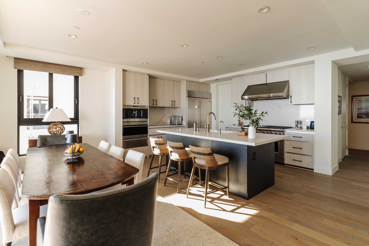 Perched on the bluffs above PCH and Sunset Boulevard, this designer-done residence offers some of the most commanding ocean and coastline views on the Westside. The entry opens into a seamless, light-filled main floor plan where the living and dining areas transition effortlessly into a bespoke chef’s kitchen. Further customized by the current owners, the kitchen features Wolf and Sub-Zero appliances, a center island, and upgraded cabinetry, countertops, and water filtration. The main level is framed by explosive views of the Queen’s Necklace and Catalina Island, best enjoyed from the private balcony. Upstairs, the primary retreat is a masterclass in luxury, featuring a private sitting/office area and a spa-like bath with a view-oriented soaking tub, oversized shower with bench, Waterworks fixtures, and triple vanities. A sumptuous walk-in closet by California Closets completes the suite. Two additional guest suites feature en-suite baths and custom closets. Refined interior details include hardwood flooring, grasscloth wallcoverings, custom window treatments, and a bar with wine storage. Exclusive to only a select few residences at OneCoast, the home includes an expansive private rooftop deck and an attached two-car garage with built-in storage. Residents enjoy 24-hour, guard-gated security, a location just a block from the beach, and a 5-minute drive to Palisades Village, Malibu, and Santa Monica.